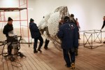 Everything happens so quickly here! Yesterday there was a miniature paper city in the gallery space, and a giant room filled from floor to ceiling with blue balloons, and then this morning, there as only broken glass, trash, and three giant garbage bags filled with popped rubber. At present, there’s a 16-foot long CLOUD covered in light bulbs, about a million cardboard boxes scattered all over the floor, and new walls springing up in all directions. Welcome to the world of contemporary art galleries, where time moves at an accelerated rate towards an impending deadline: The Opening.