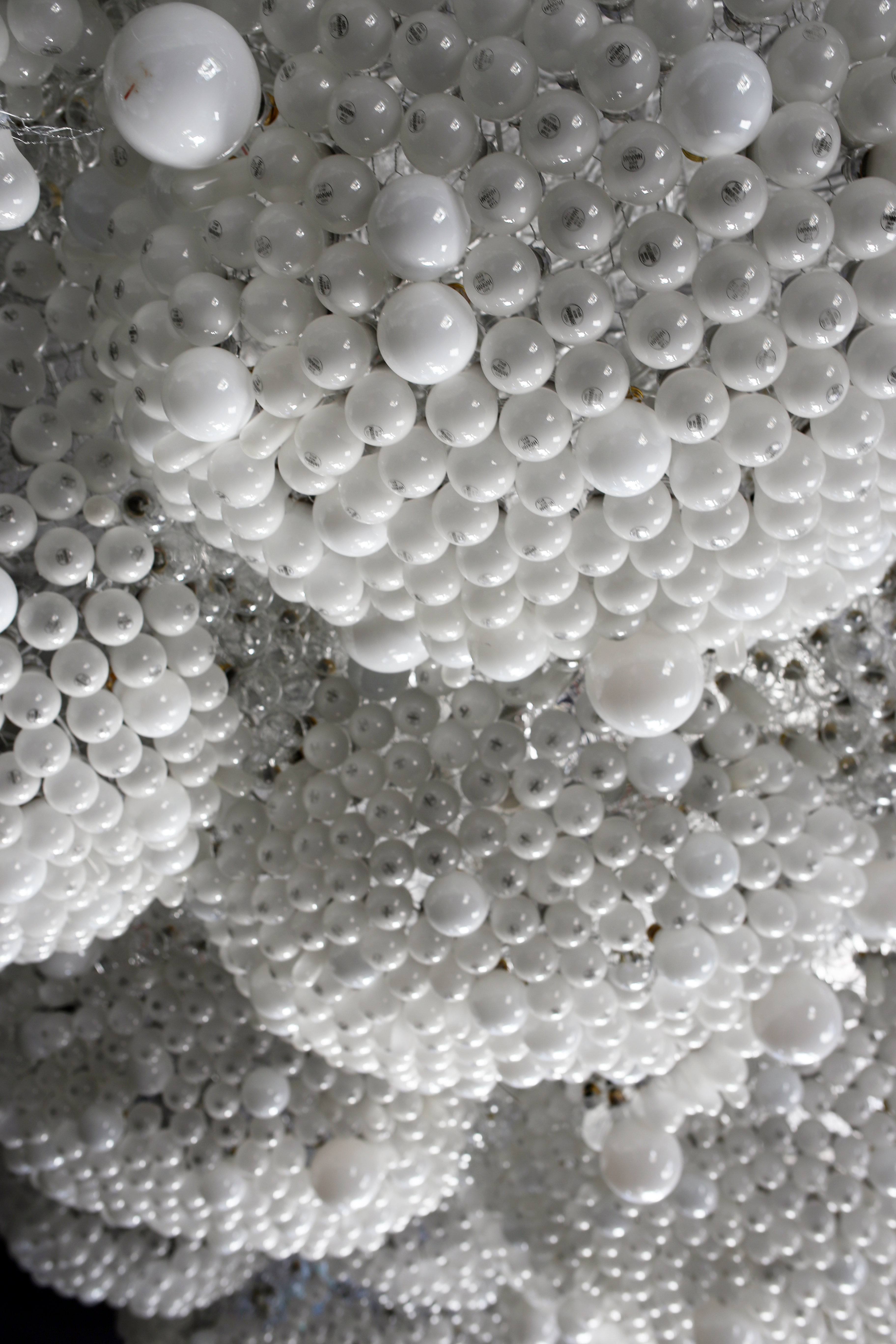 CLOUD CEILING is an interactive installation created by Canadian artists Wayne Garrett & Caitlind r.c. Brown (Calgary). Constructed from hand-bent steel, reflective mylar, electronics, motion sensors, LEDs, and 15,000 re-appropriated incandescent light bulbs, the piece is an permanent installation designed specifically for Progress Bar in Chicago. As bar patrons pass beneath the installation, they trip motion sensors within the CLOUD, creating “lightning” beneath the cumulous surface of light bulbs, mapping their progress through the space and the social “electricity” between people.