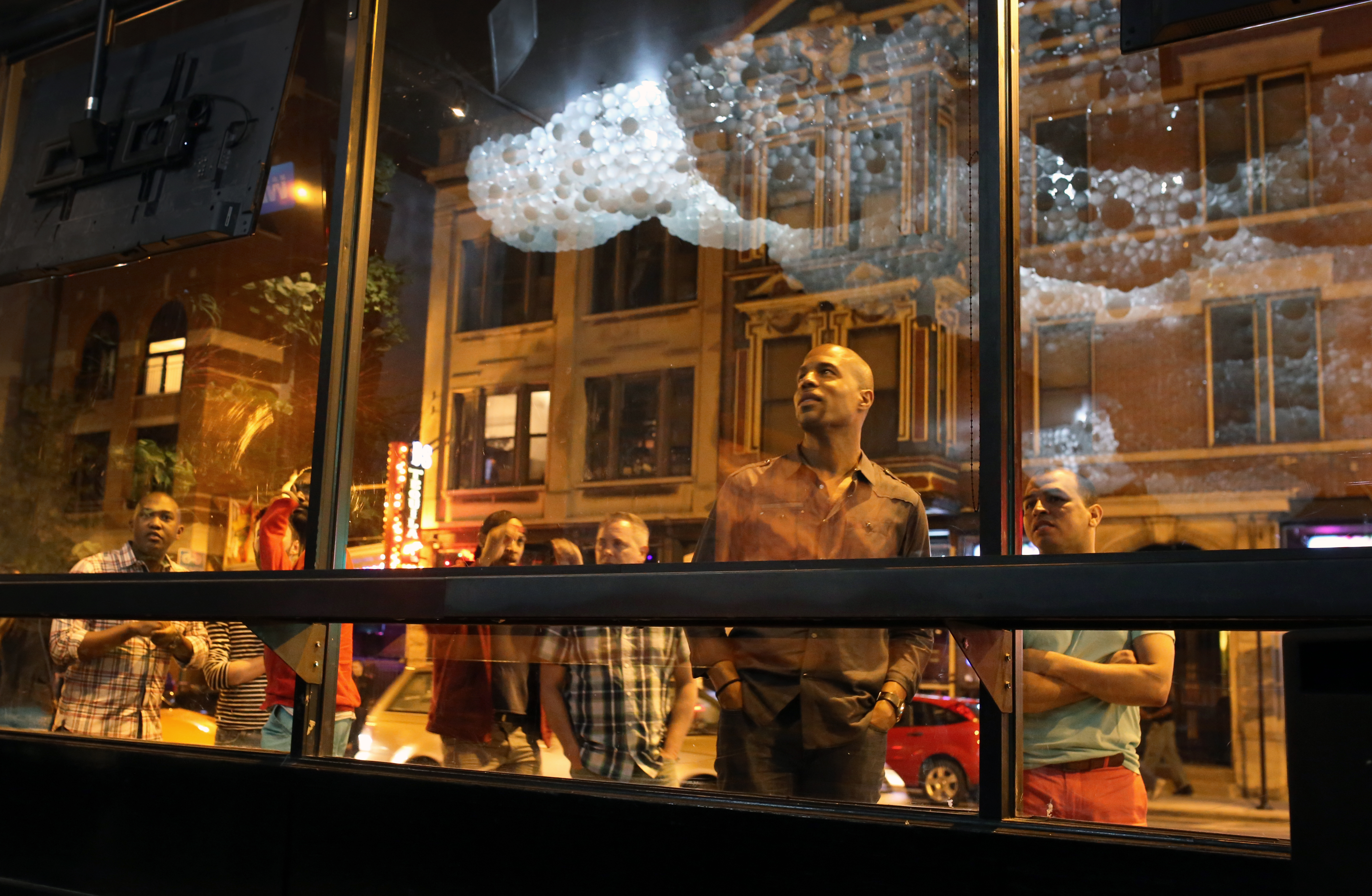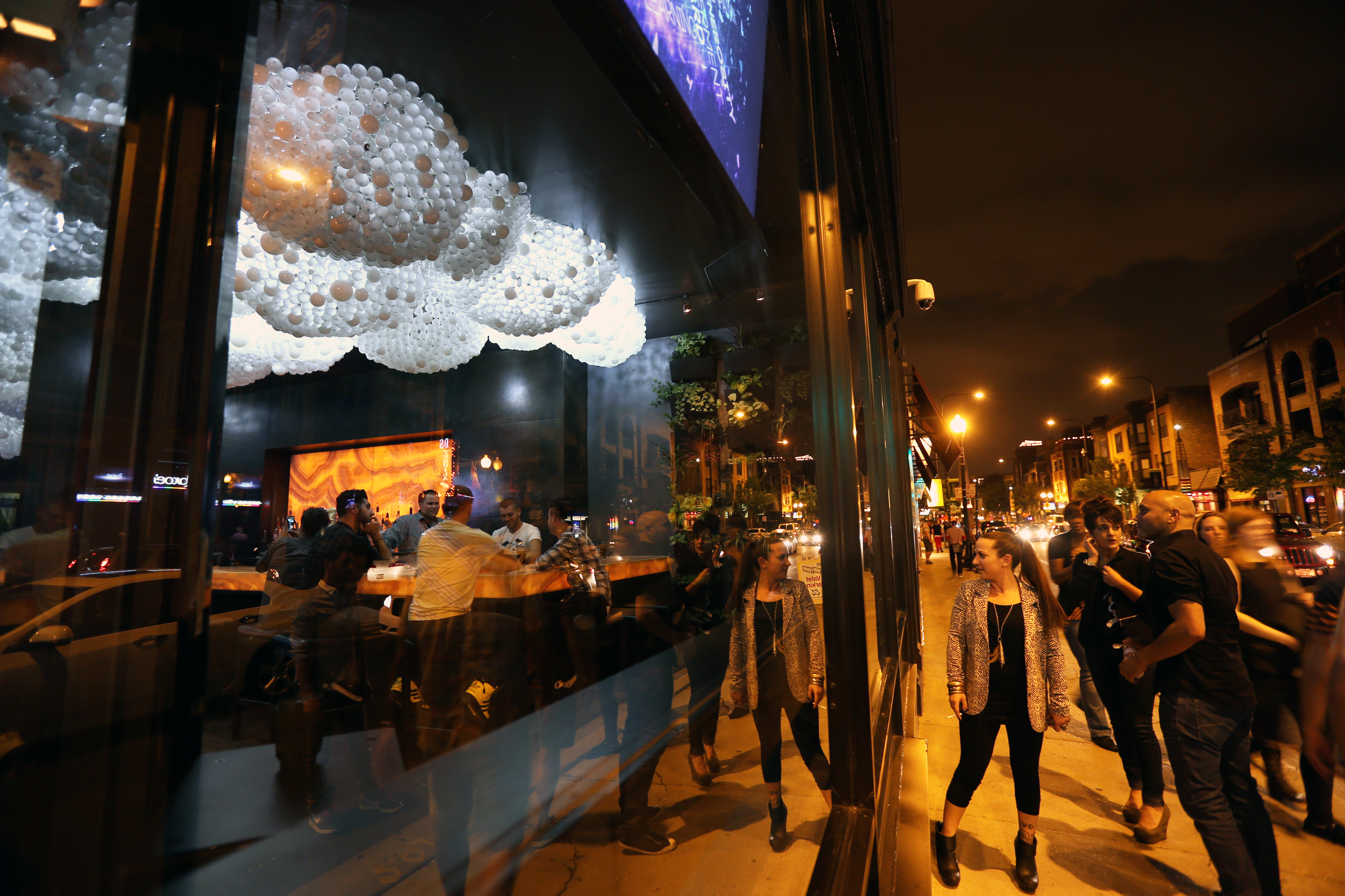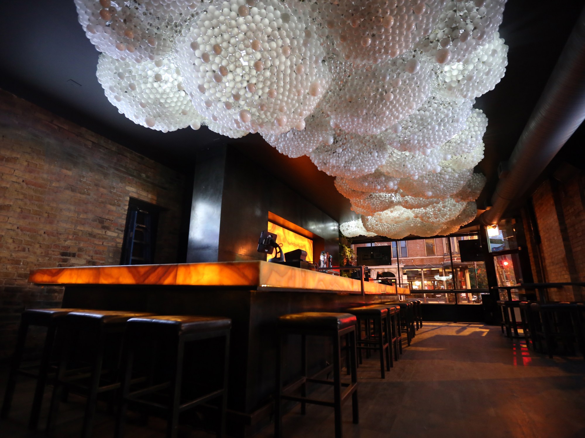 Progress Bar is located in the heart of Boystown, a strip in Chicago rumoured to be the third largest gay community in the United States. CLOUD CEILING creates a glowing electric heartbeat for Boystown, visible throughout the neighbourhood through the window of Progress Bar.