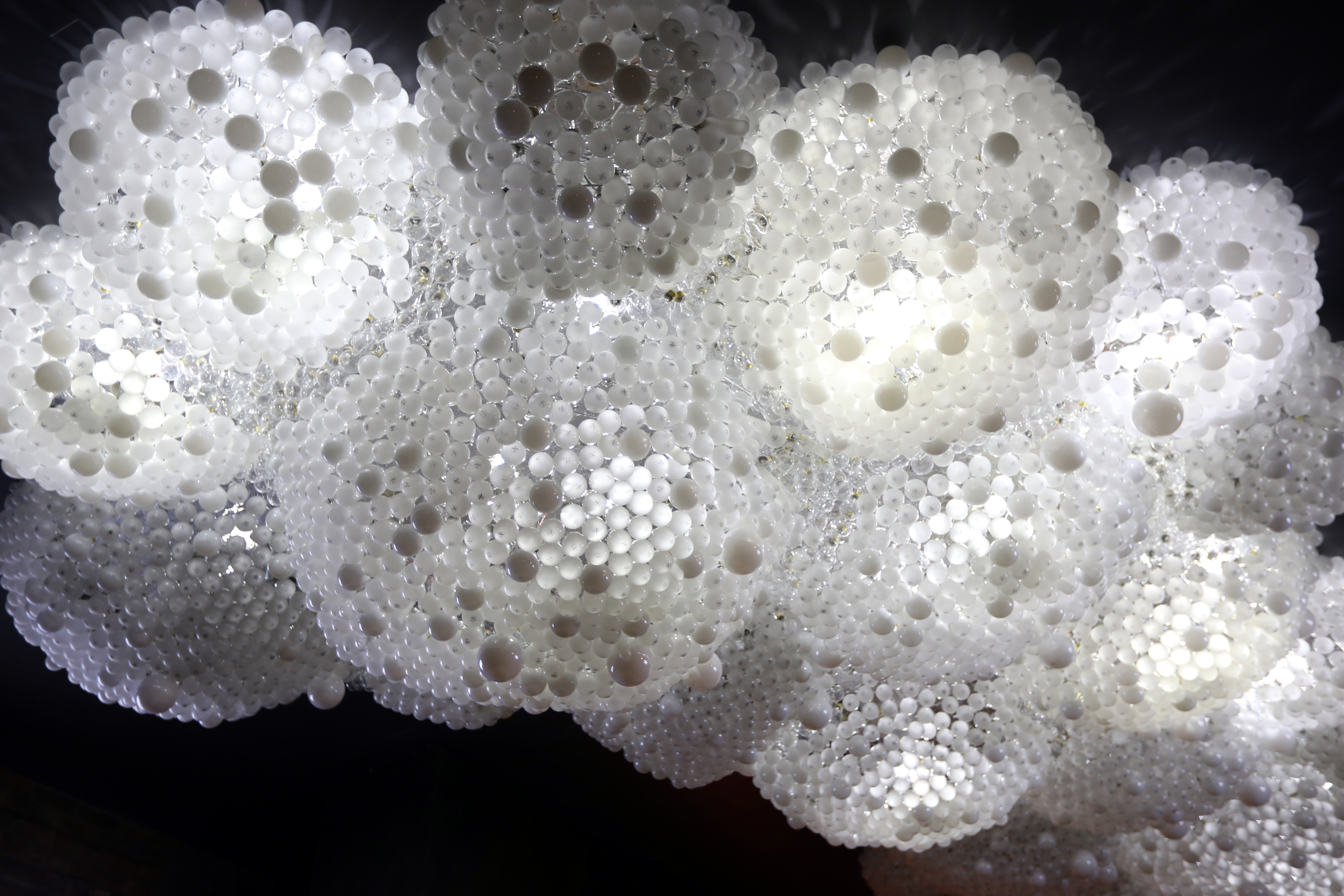 Unlike previous CLOUDs, CLOUD CEILING is a permanent fixture. The installation was constructed with safety, resiliency, and longevity in mind. By comparison, the original rendition of CLOUD was only on public view for 6 hours before tear-down, and audiences could interact with it physically to create flickering on the CLOUD’s surface.