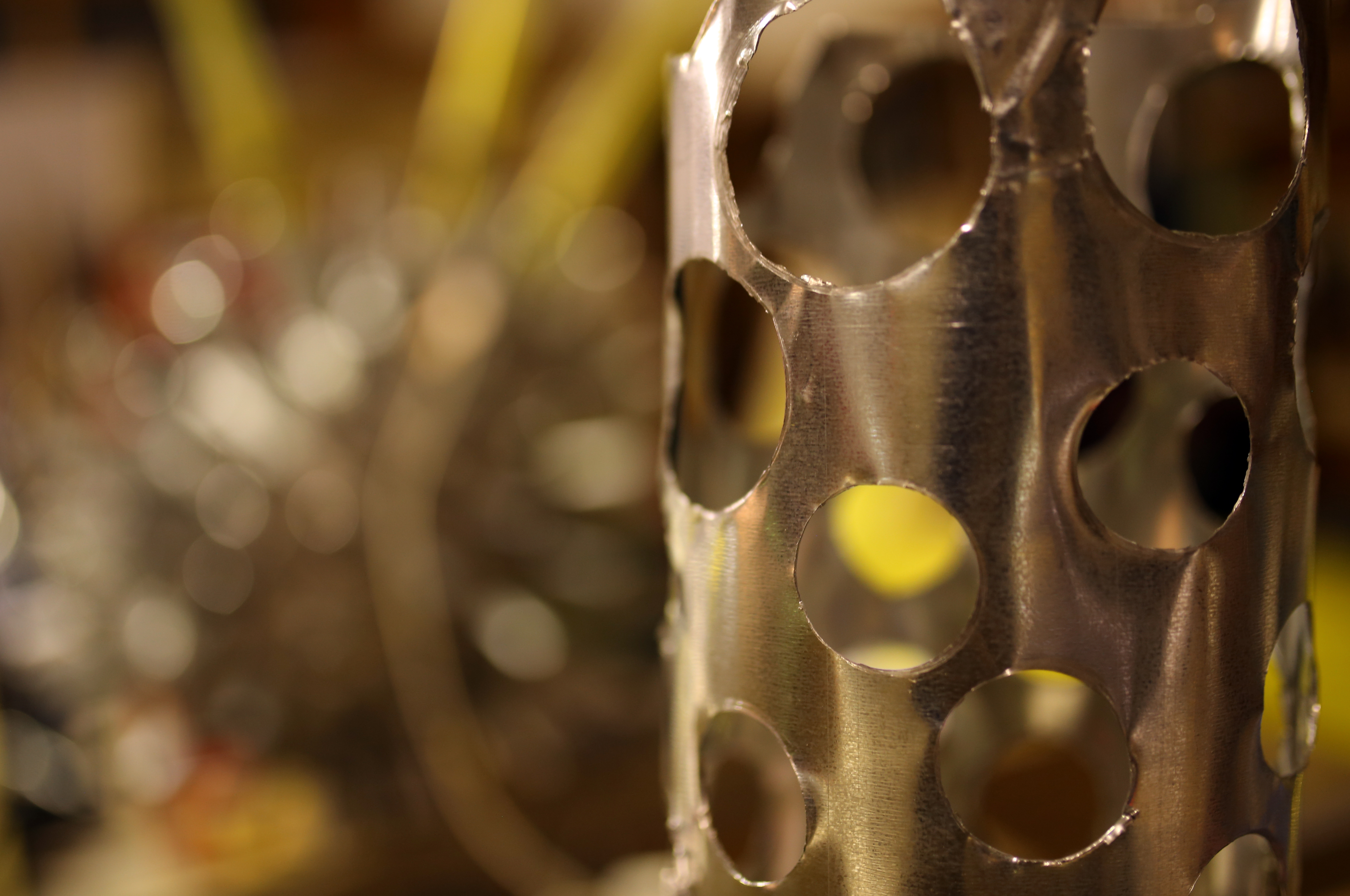 After fiddling with animated LEDs, arduino units, and other fancy gagetry, we decided on a rough and analogue approach, utilizing only one large light bulb inside the belly of the sun. The bulb is surrounded by a rotating tin cylinder with holes cut out of it, geared to a small electric motor that is activated by motion sensors placed on either side of Stephen Avenue walkway. When tripped, either one of the motion sensors switches the motor to 3-volt rotational speed, creating a slow glimmer of light on the surface of the sculpture for a matter of seconds. If you haven’t already watched the SOLAR FLARE video, you can see it at the top of this post.