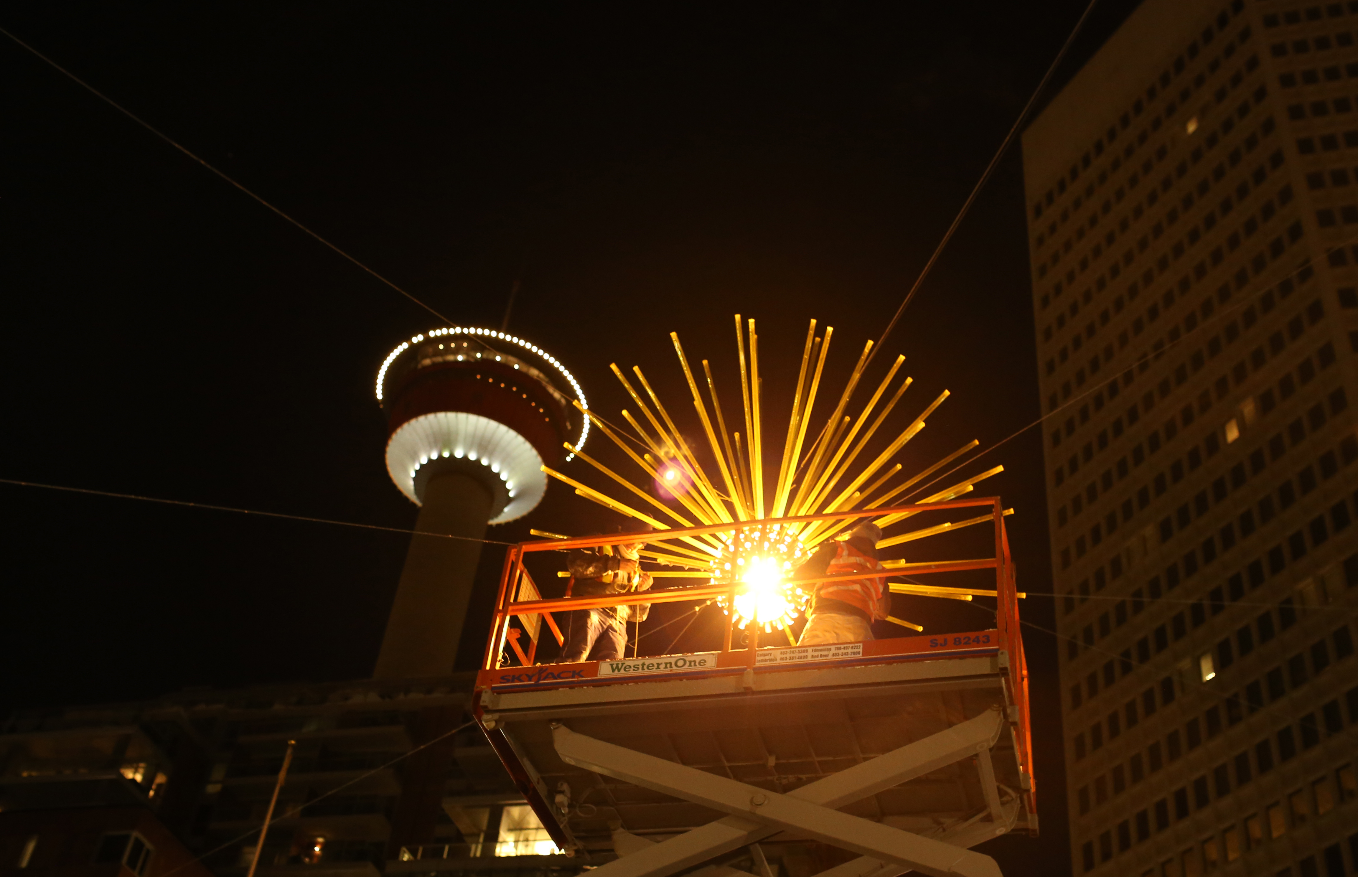 In December, we finished installing our latest light installation and our first foray into coloured light – SOLAR FLARE. Publicly viewable above Stephen Avenue in downtown Calgary, the sculpture will be on display until February 1, 2014.
