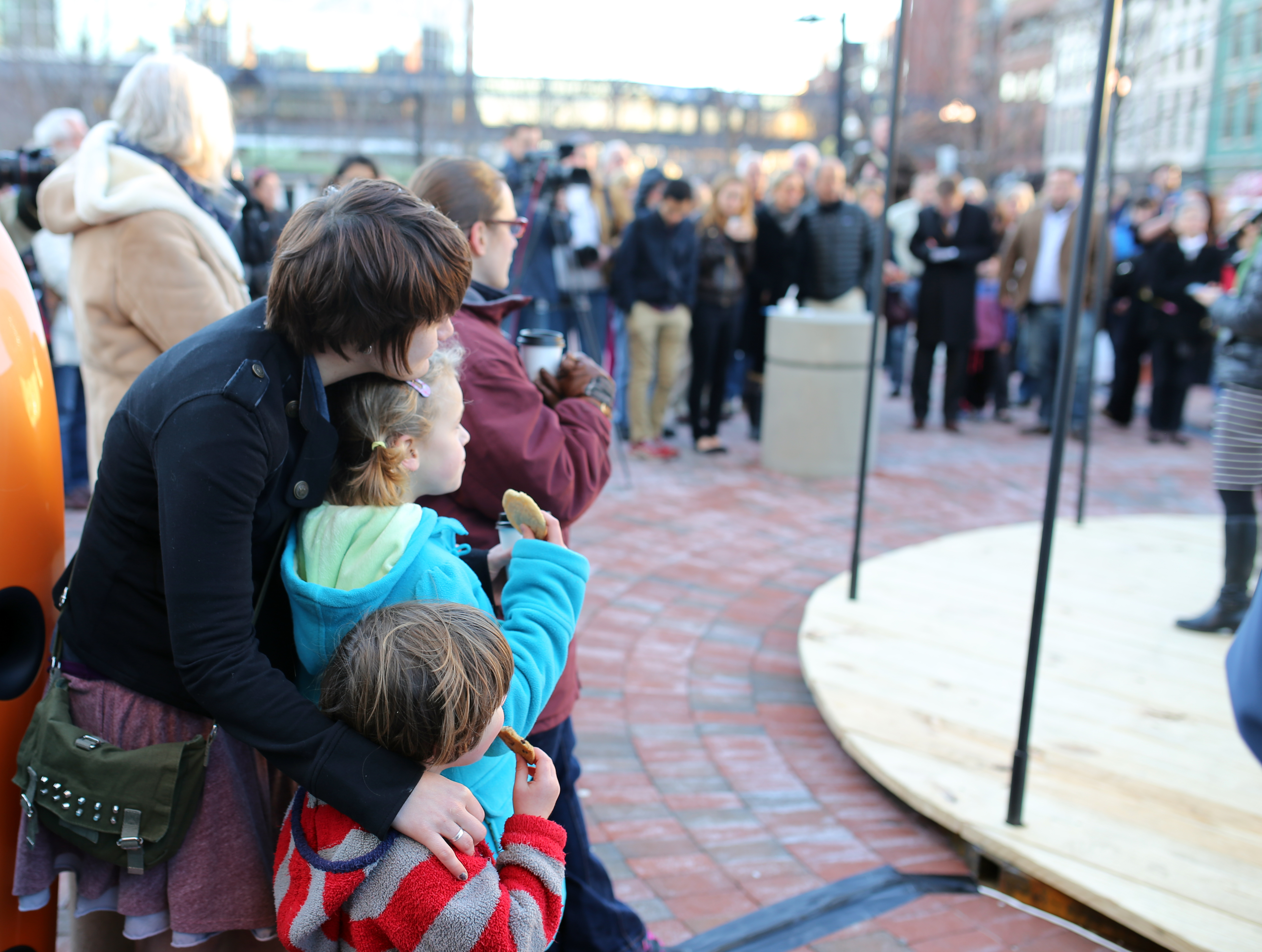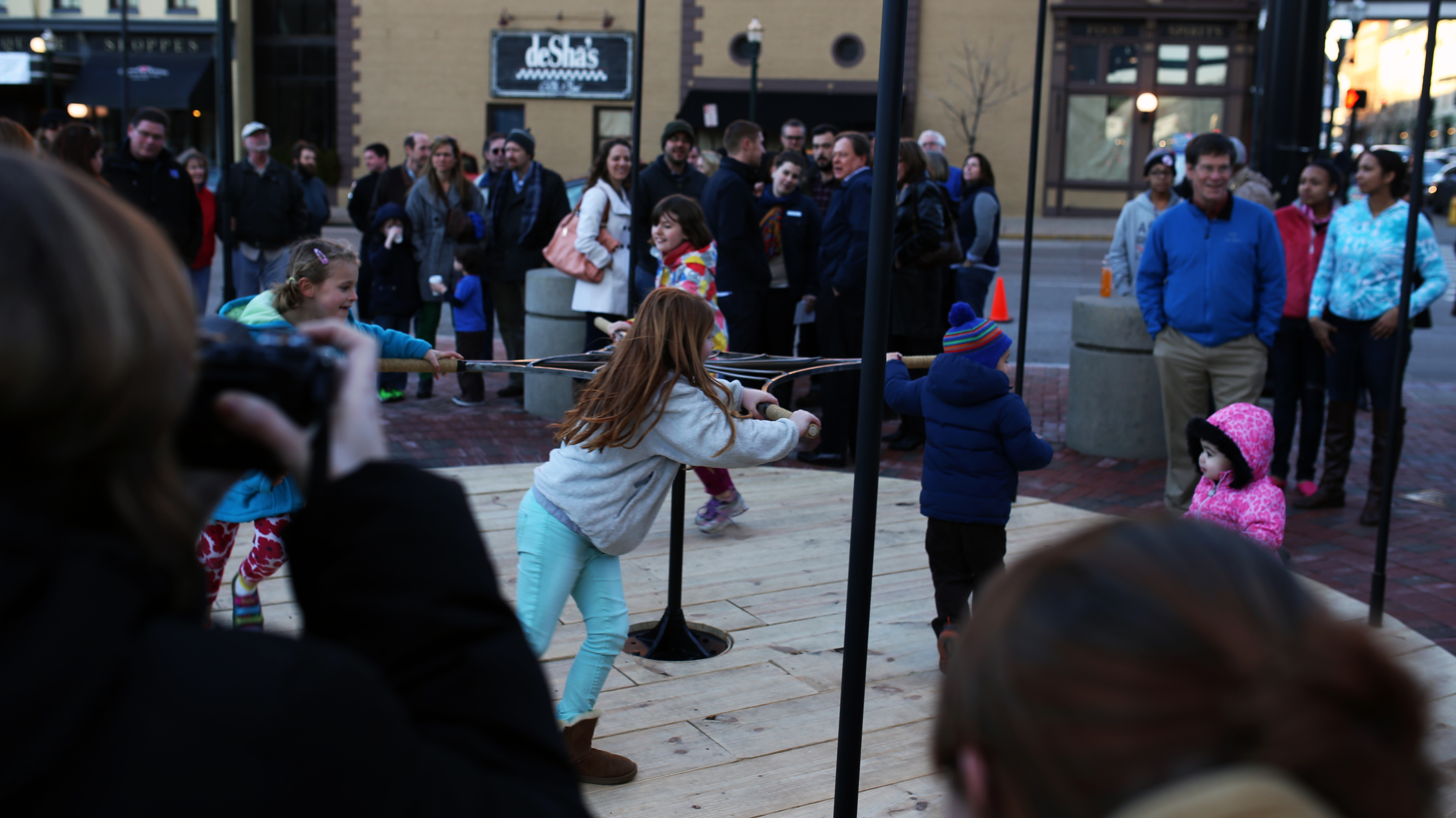 On February 21, 2014, NEW MOON was officially unveiled in Triangle Park. Stephanie Harris, the Executive Director of the Lexington Art League (our amazing hosts and sponsors) gave a short and very kind address, followed by the Mayor of Lexington, and then they invited the public to step up and engage with the sculpture – take part in the art.