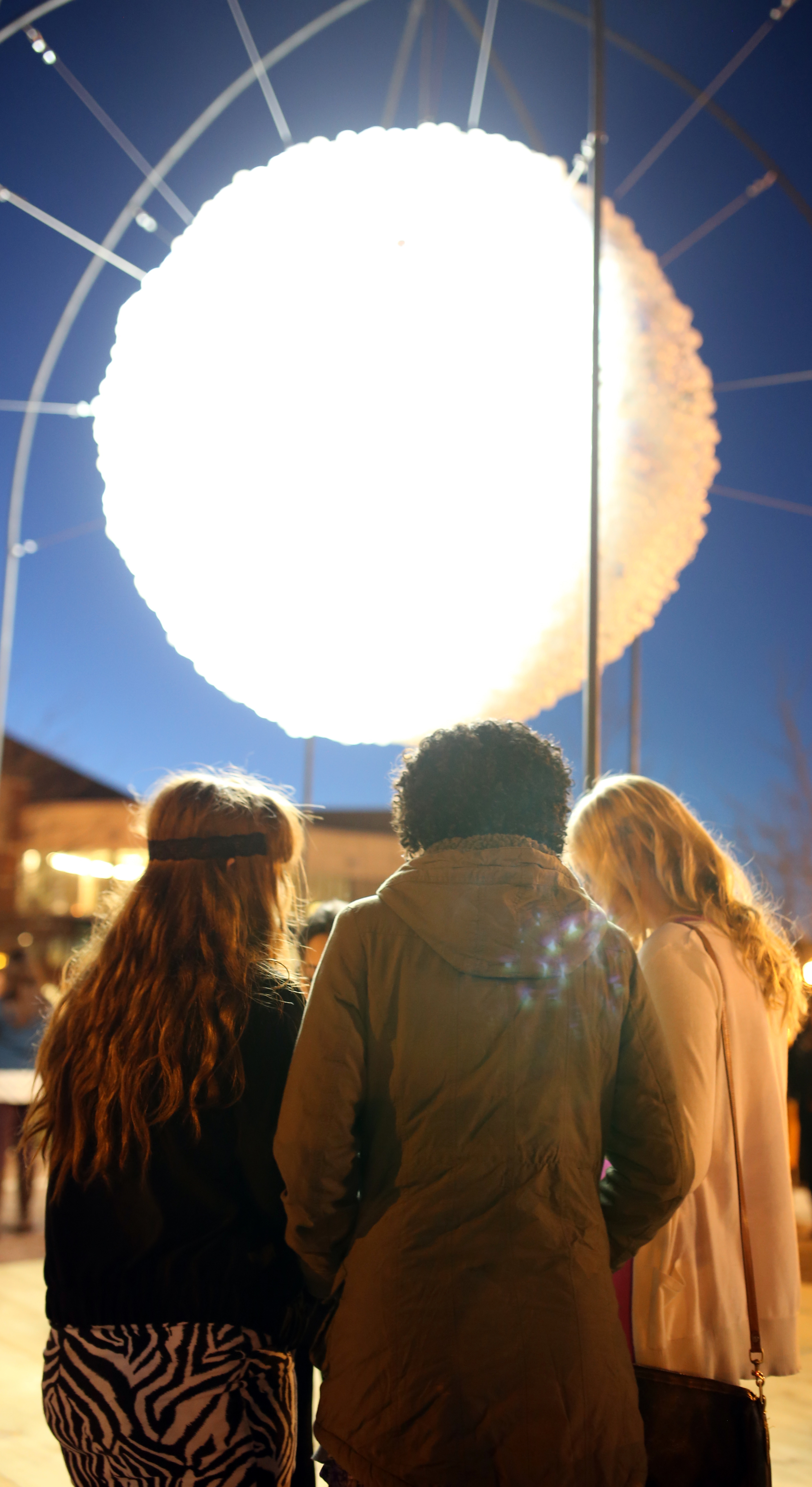 Interactive work struggles against its own demons – this is difficult work to create. It is often (and mistakenly) placed in a category next to product design, mass-produced objects, and playground equipment, when it is none of these things (and couldn’t be, based on the millions of dollars and hundreds of product tests used to design and create them). Instead, interactive art uses a shared language, often referencing familiar everyday (and yes, mass produced) objects to elicit an intuitive response from the viewer. With CLOUD, a pull-string says “pull me.” With NEW MOON, the wheel says “turn me.” We are borrowing these understandings from popular culture, and re-appropriating them to draw the viewer into the work, asking them to engage with the art and with each other.