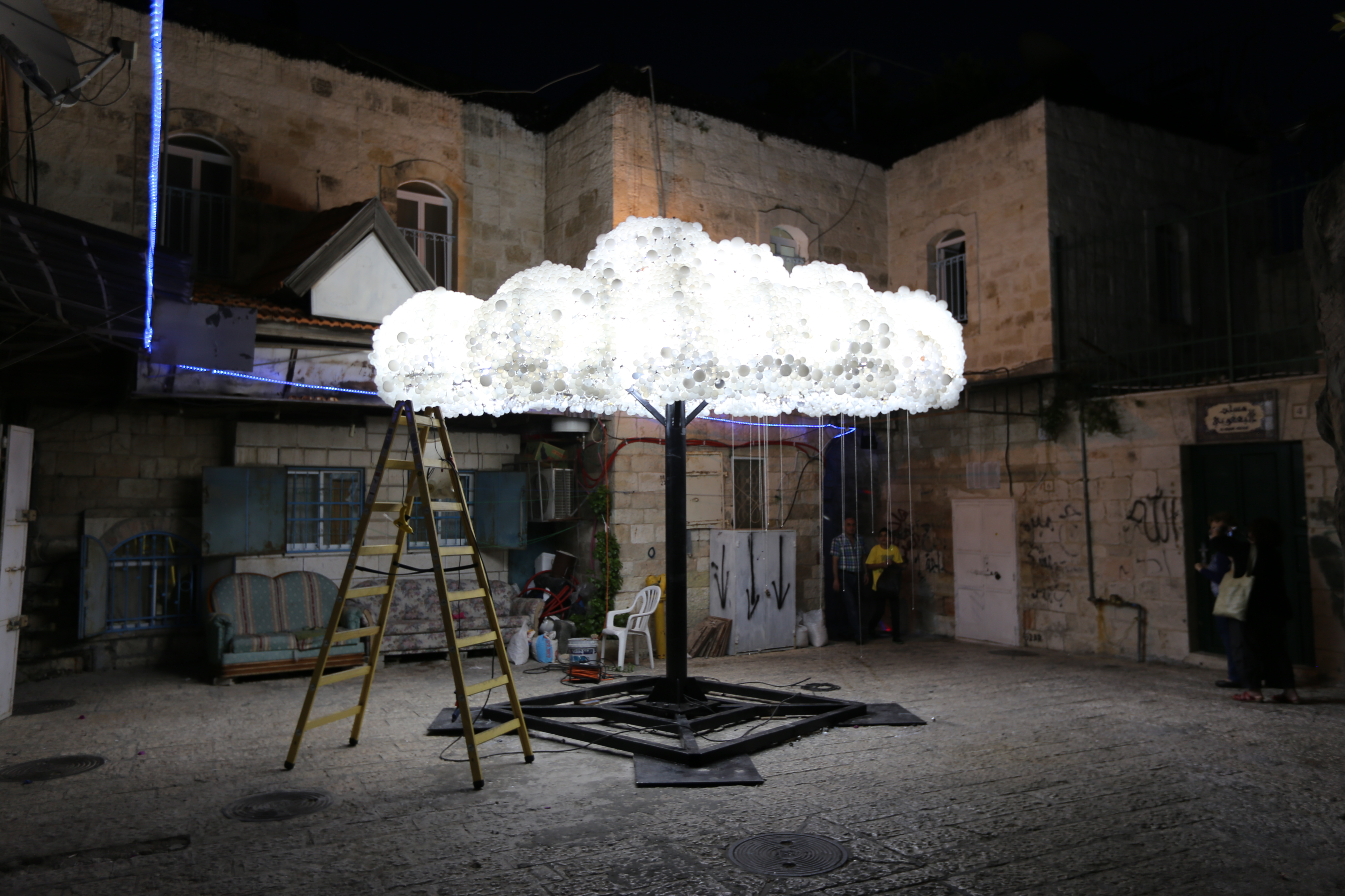 Aesthetically, Jerusalem is built from a pale stone, regulated by the government as the primary facade material for all architecture in the city. This regulation creates a certain uniformity, allowing breathing room for architectural forms – both ancient, and new. The site selected for CLOUD by Lights in Jerusalem was a small plaza located in the Armenian Quarter, serving as a corridor from the Tower of David towards the Jewish Quarter of the city.