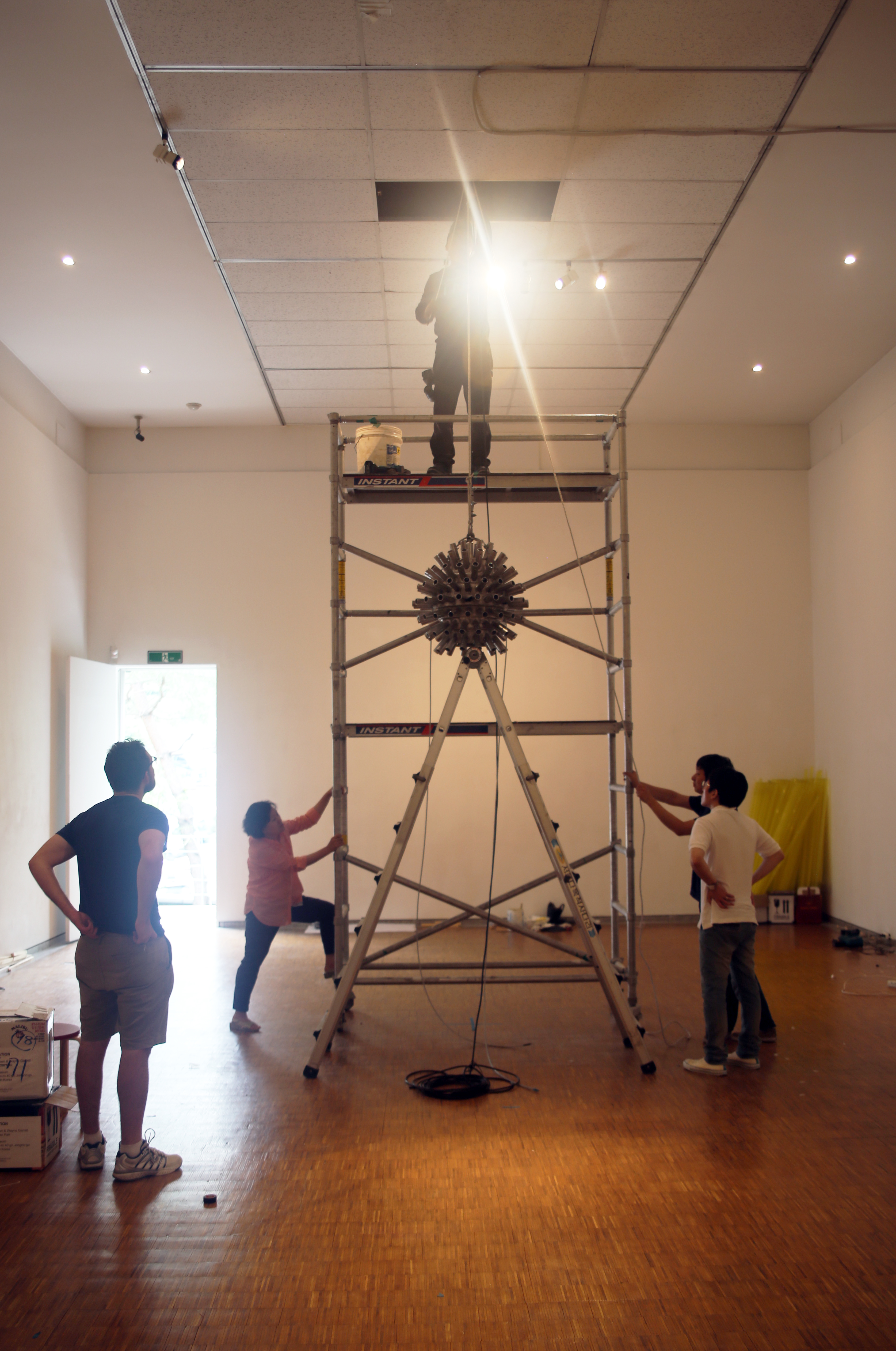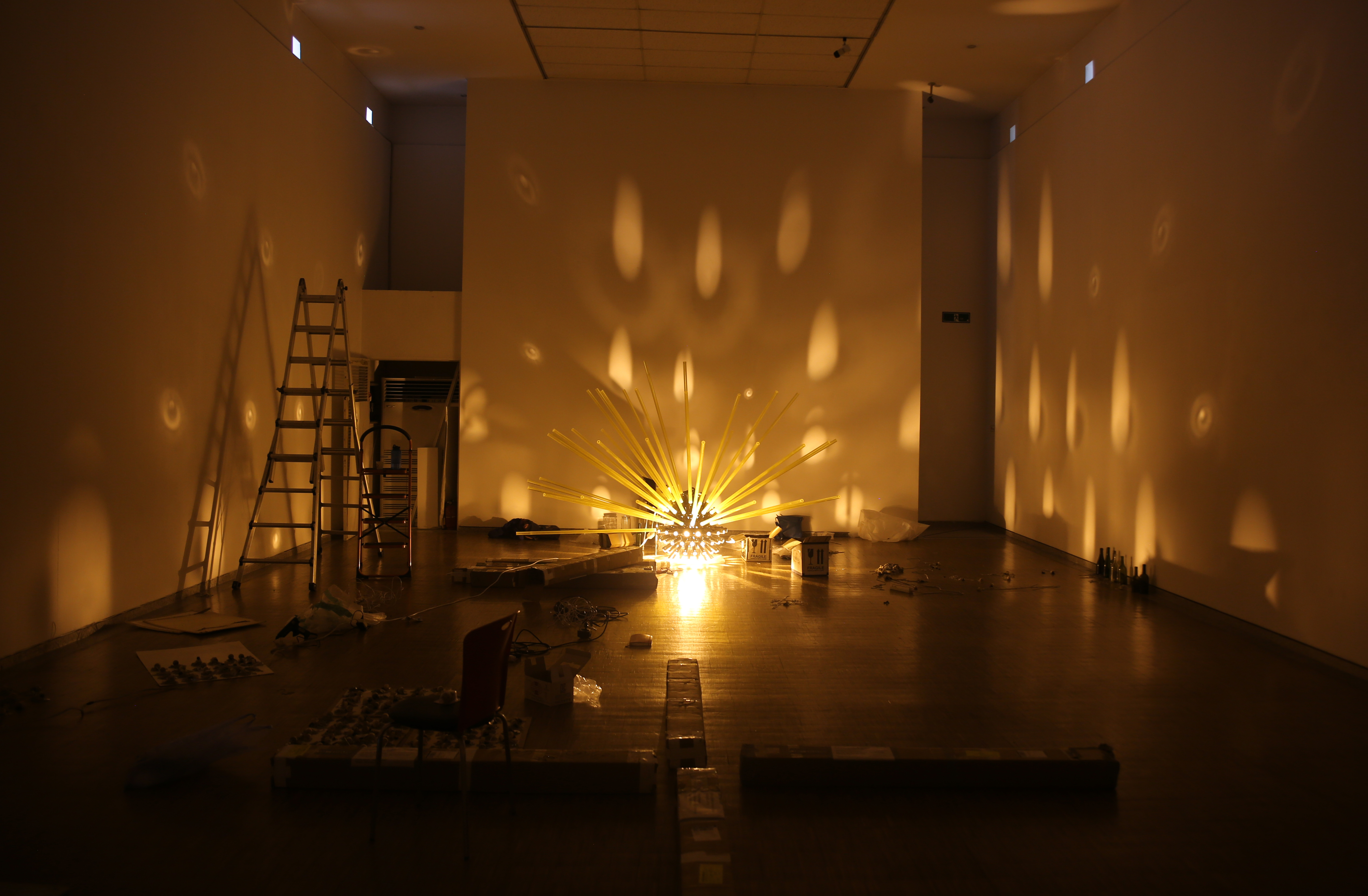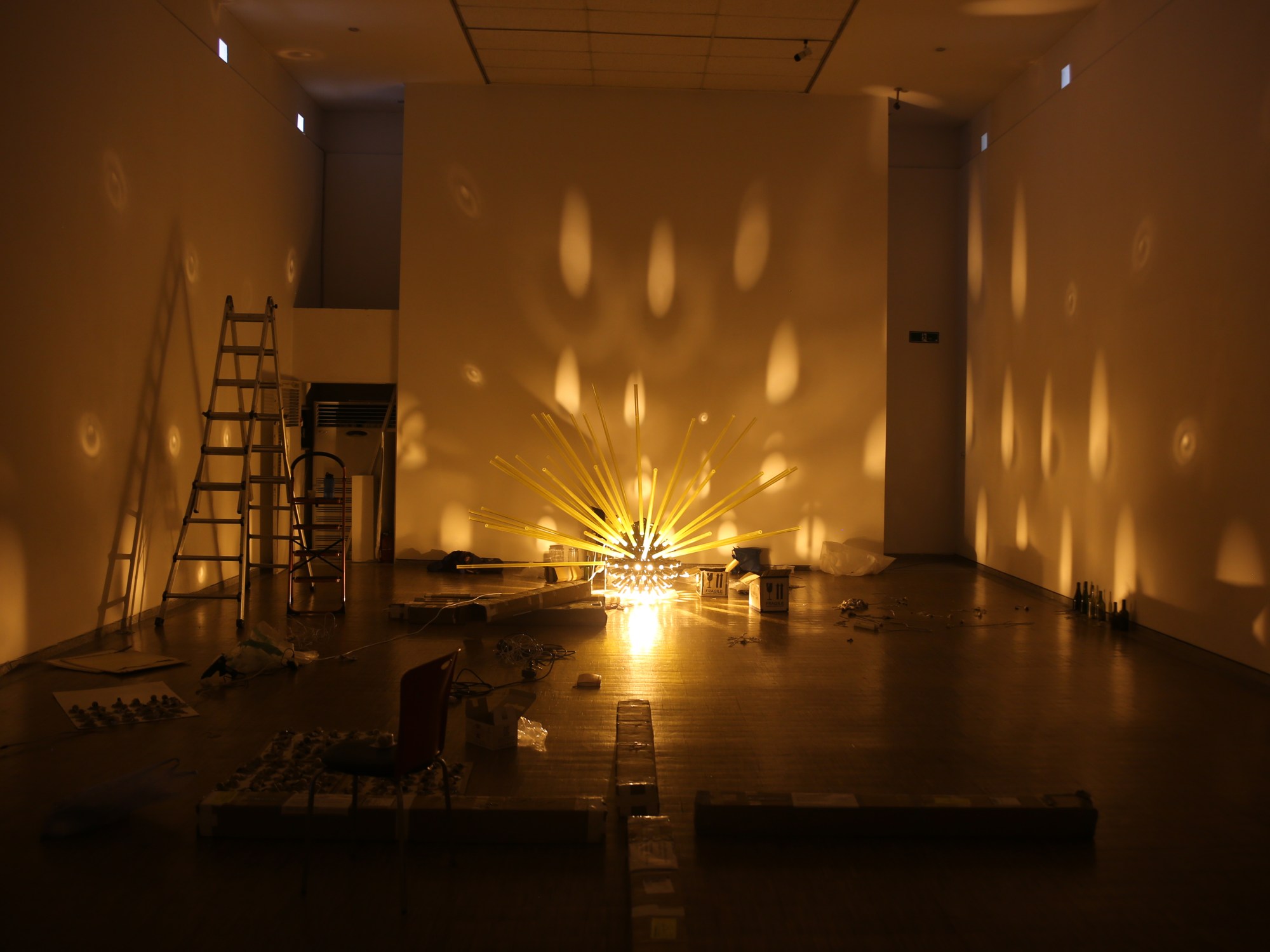 After some discussion about the mood of the exhibition, we settled on showing two works at Whanki – SOLAR FLARE and BELLWETHER. Both have previous contexts – SOLAR FLARE was installed last January above a pedestrian street in downtown Calgary, and BELLWETHER was created for the Lexington Art League’s group show, Luminosity, at Loudoun House (a gallery less about white walls than it’s extraordinary setting in a centennial mansion).