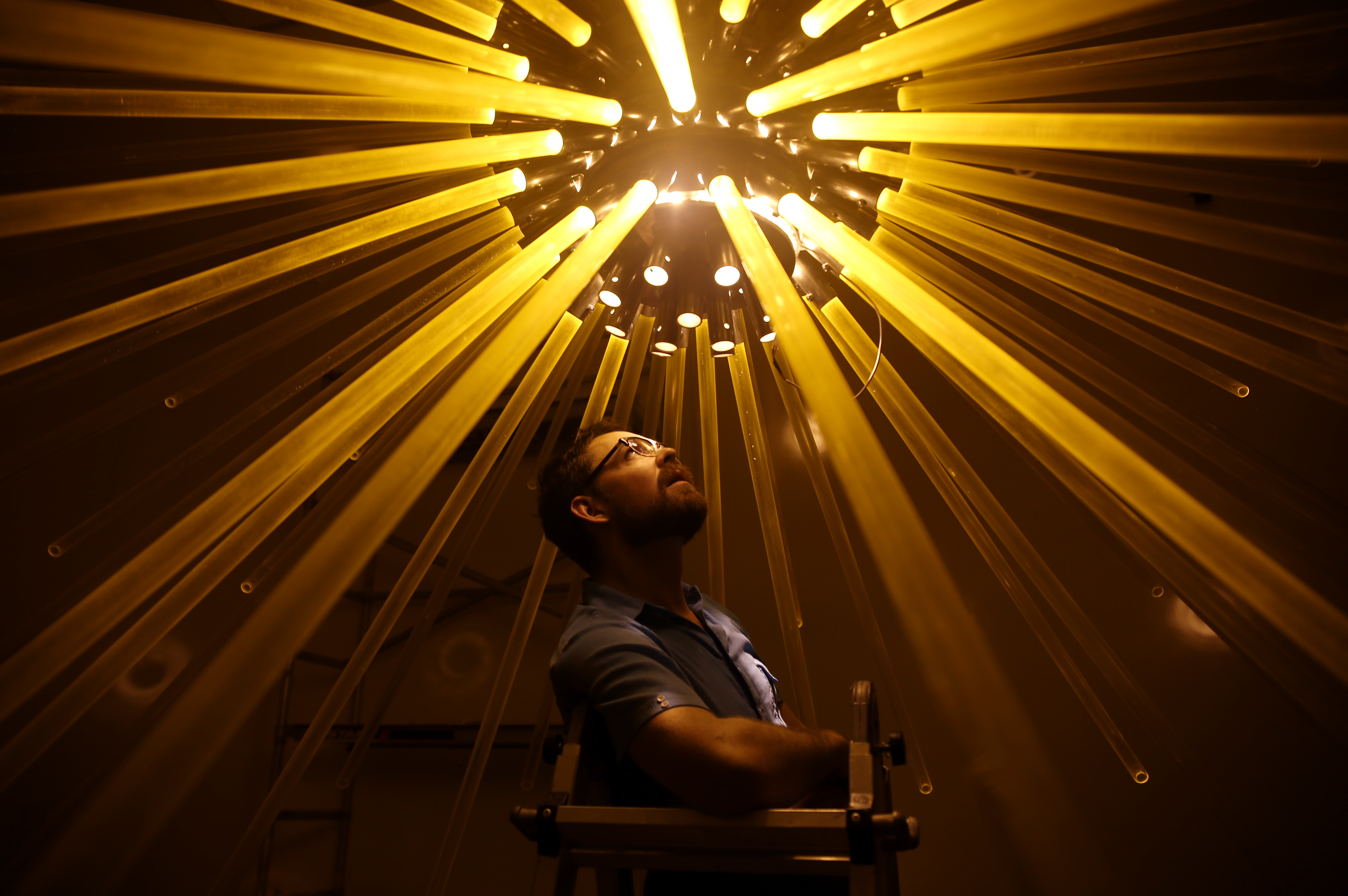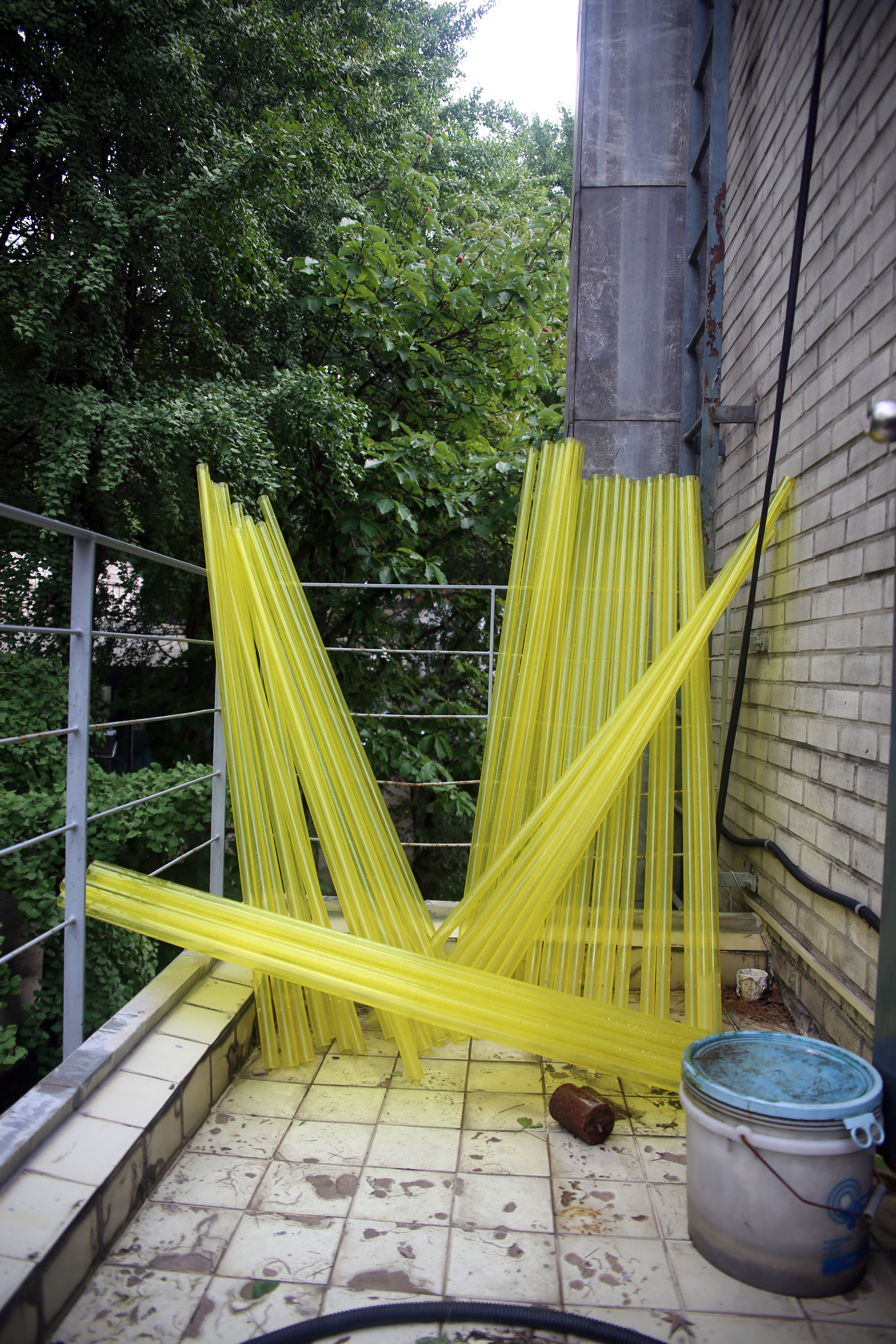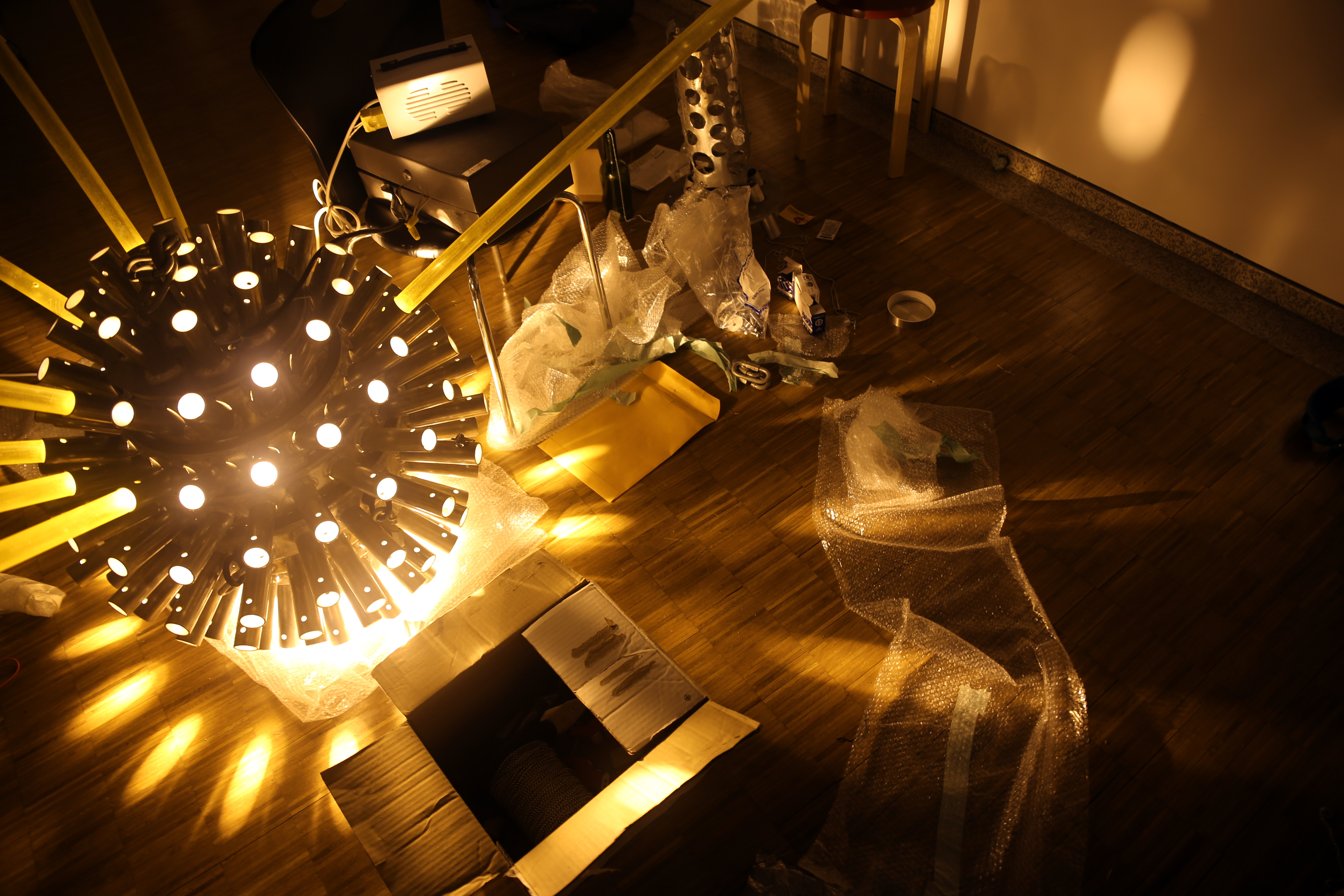 After some discussion about the mood of the exhibition, we settled on showing two works at Whanki – SOLAR FLARE and BELLWETHER. Both have previous contexts – SOLAR FLARE was installed last January above a pedestrian street in downtown Calgary, and BELLWETHER was created for the Lexington Art League’s group show, Luminosity, at Loudoun House (a gallery less about white walls than it’s extraordinary setting in a centennial mansion).