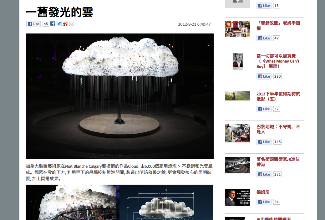 The turning point we encountered after Nuit Blanche was fast and violent. Buoyed by the photogenic qualities of the piece in combination with the sculpture’s novel use of light bulbs, the blogosphere took hold of CLOUD like a tidal wave, sending images of the sculpture splashing all over the globe.