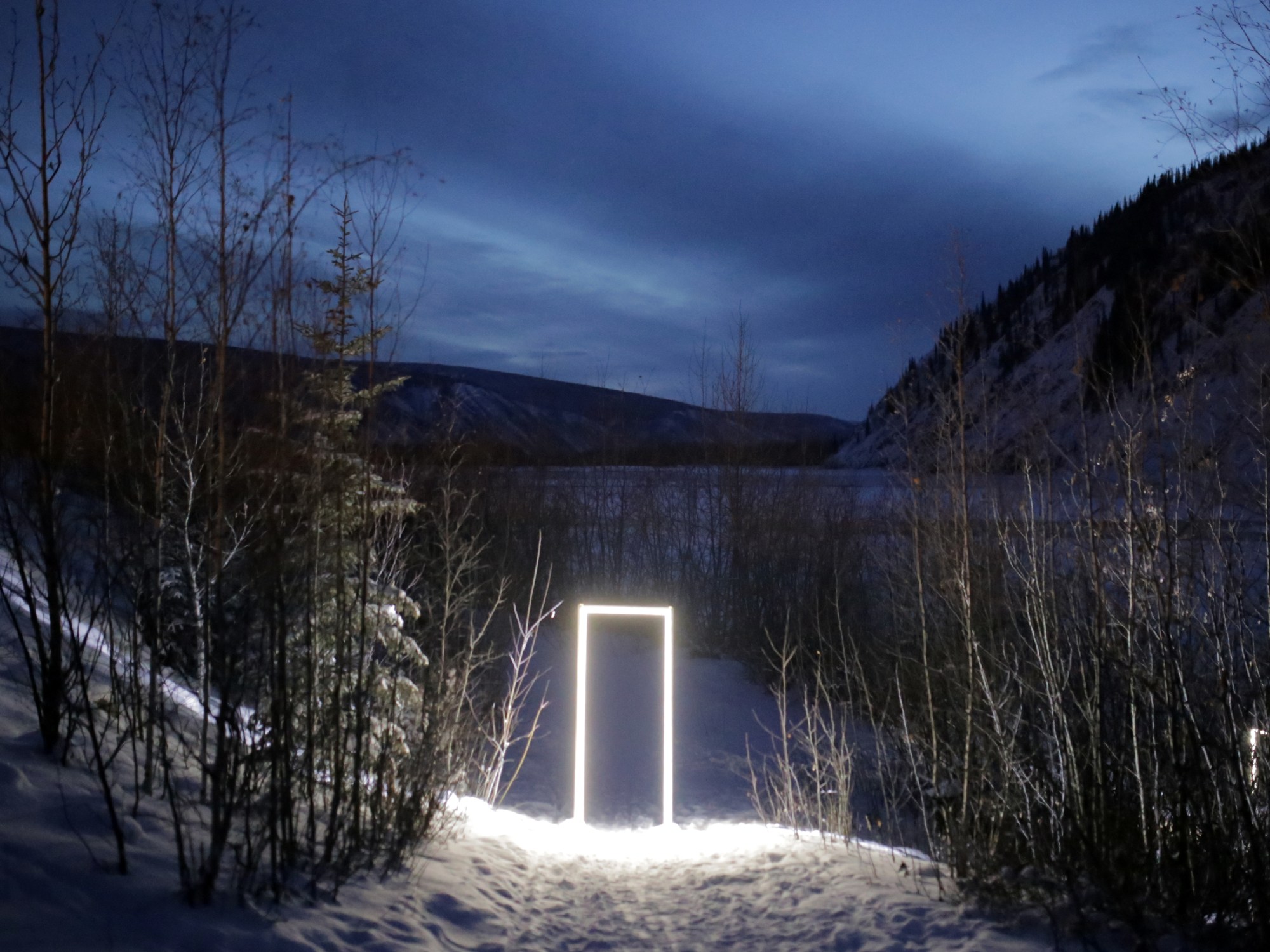 The most beautiful and surprising elements of installing The Deep Dark in Dawson came from the landscape itself. Plumes of breath billowed like illuminated clouds around the heads of viewers as they passed through each gate. Footsteps in the snow compressed creakily, the sound traveling across immense distances through the cold air. And the swoosh of the river, saturated with blossoms of ice, was unlike anything we’ve ever heard before – at once both eerie and comforting, a perfect pairing with the deep dark surrounding.