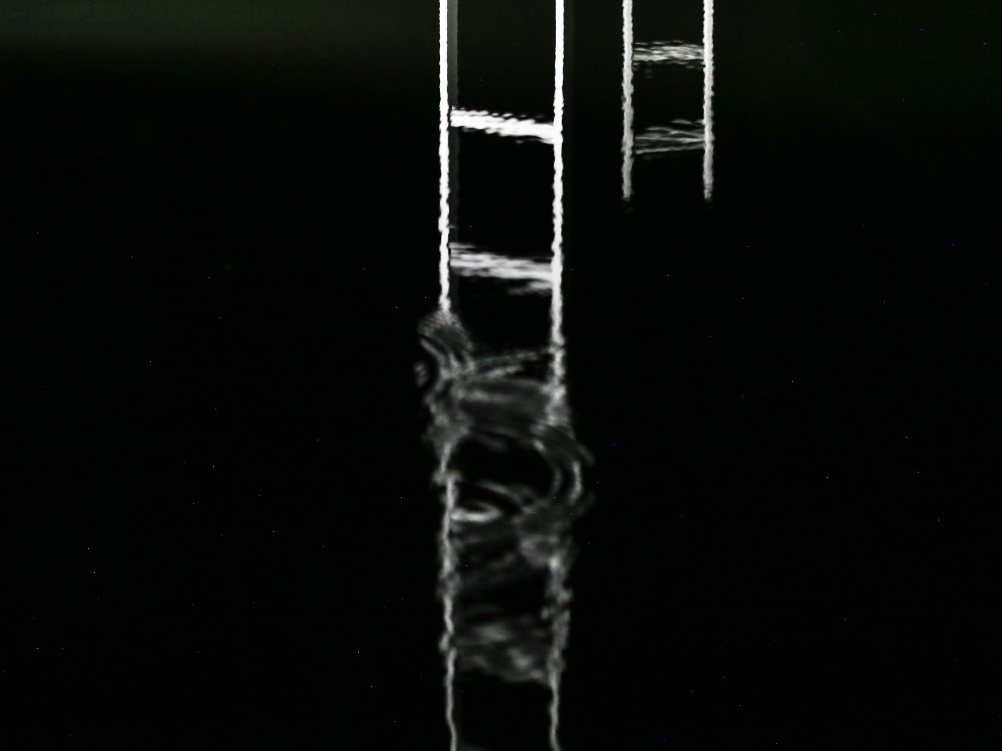 As they are illuminated, the ladders expand into the depths beneath them, implying movement up and down simultaneously, but going nowhere. The sweeping light of the projection machine, while rotating consistently like a clock, illuminates ladders out of sequence – not right to left, but seemingly at random, outside of time.