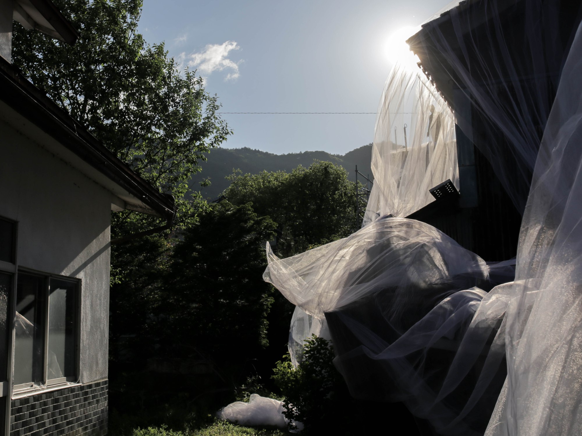 Tracing the contours of each house, the veil uses the mass and scale of each building as a formalist shape; a found sculpture. Depending on the quality of natural daylight, the veils diffuses light differently, referencing the relationship between light + spirit in Japanese culture.