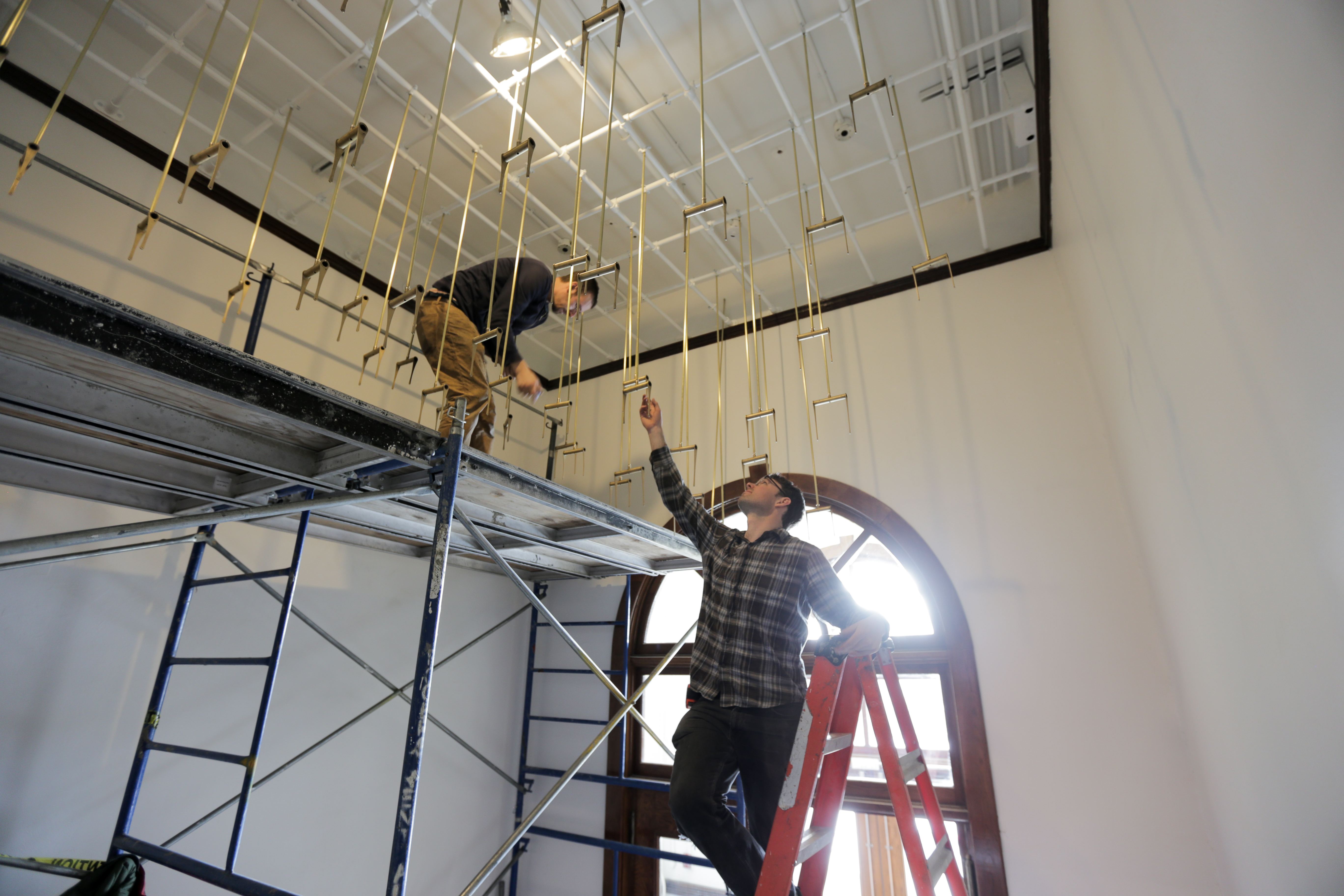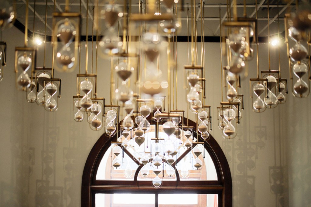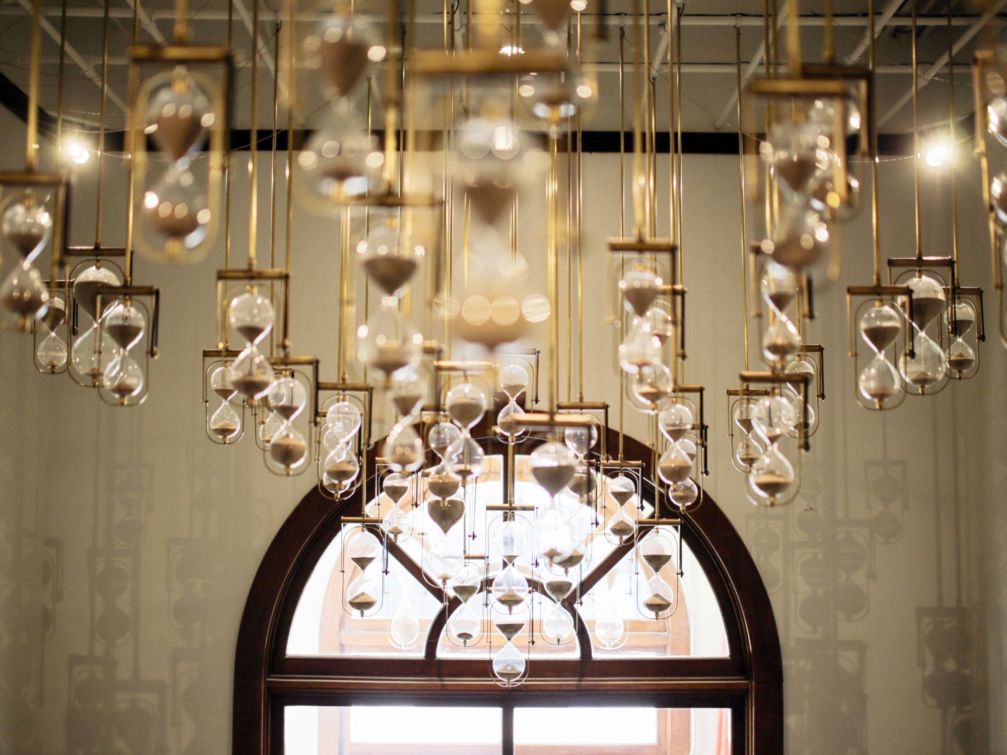 We initially thought we could fasten the installation directly into the ceiling, but the heritage nature of the building meant that the ceiling was not structurally solid enough to hold the artwork. Instead, we built an engineered grid system to hang hourglasses – which ended up being a convenient compositional tool and device for masking electrical wires.