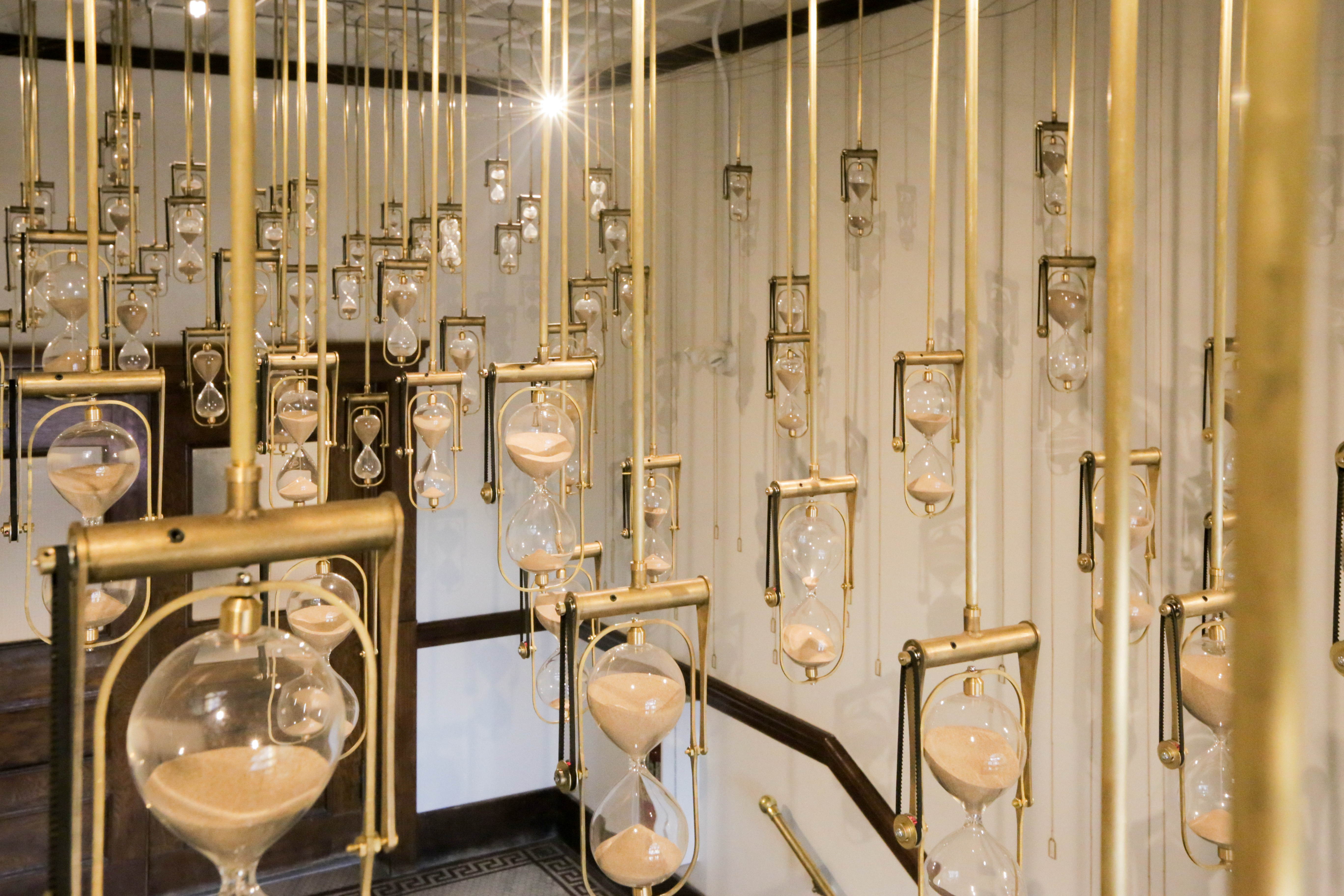 Ranging from the time it takes to “call mom” to the time it takes to “realize it was just a dream and you are no longer lying next to me,” you can read the brass tags attached to various hourglasses to understand the increment of time being measured in sand.