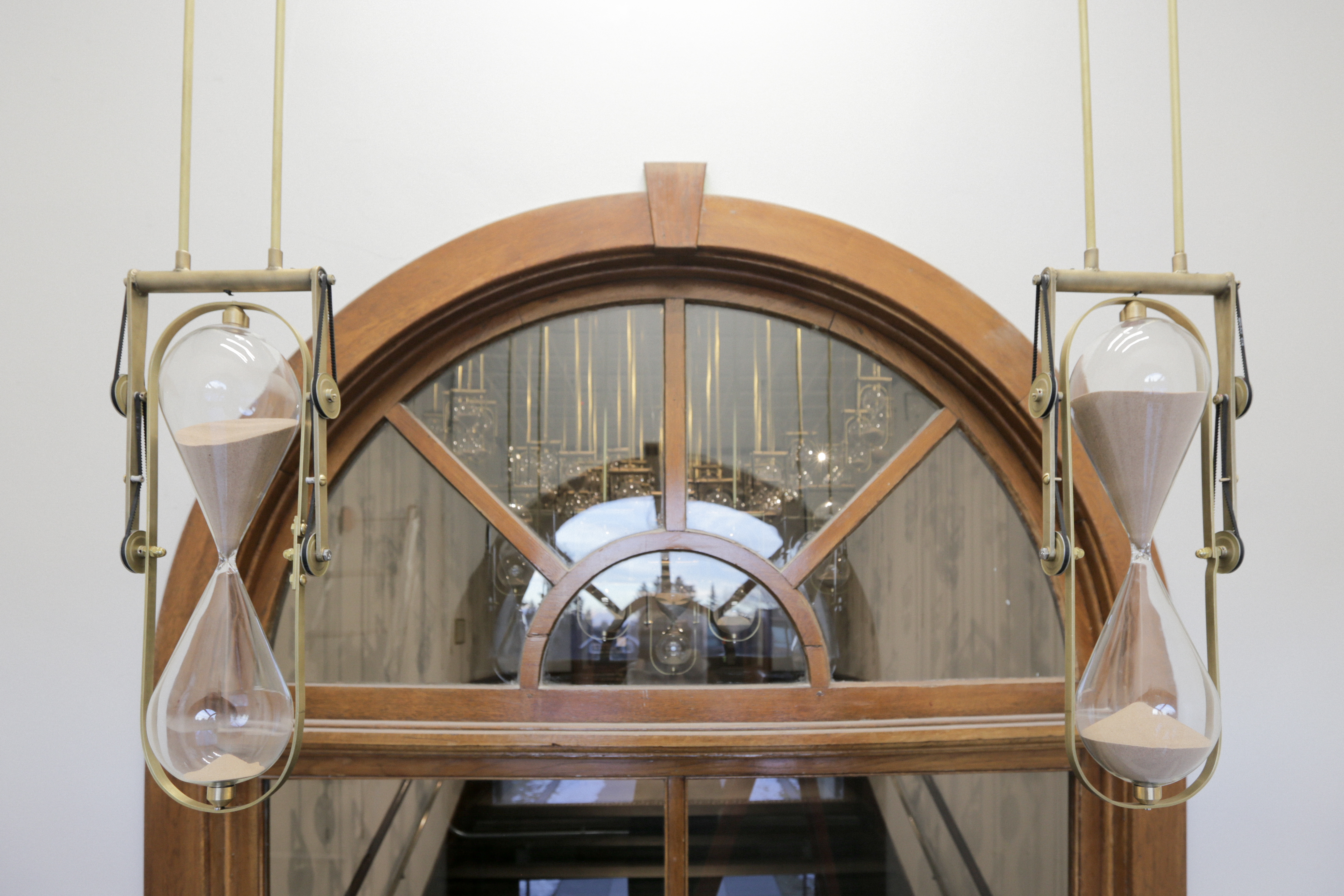 We built the metal armatures holding each hourglass (with help from local welder Rob Reuser), constructing the forks with steel and brass-plating the final components. Brass was used as a reference to traditional time-keeping devices, matching the era of the sandstone building with its brass handrails and other detailing.