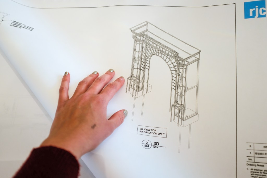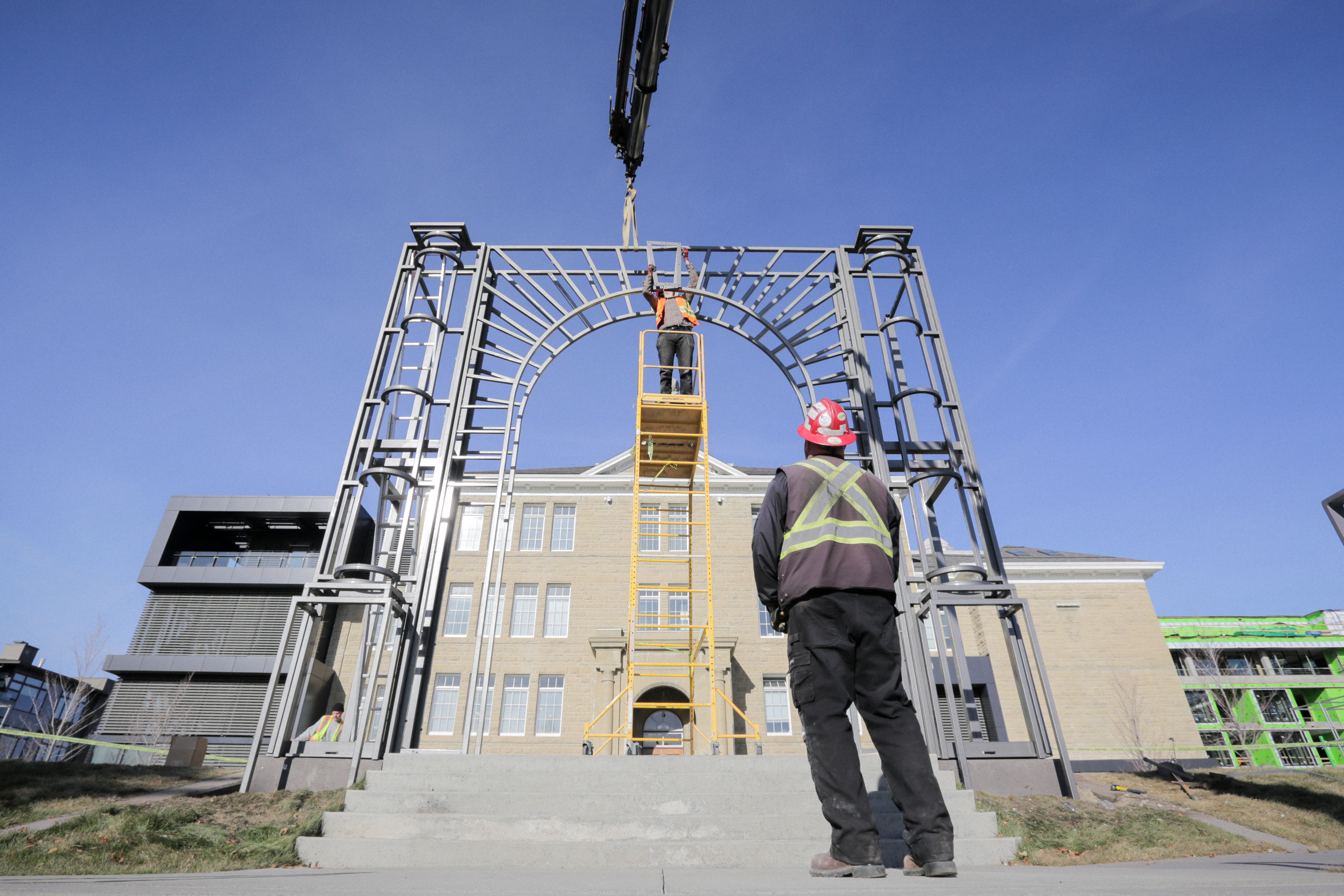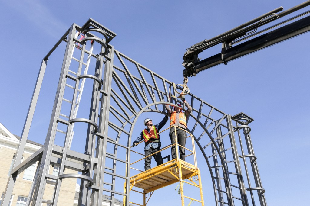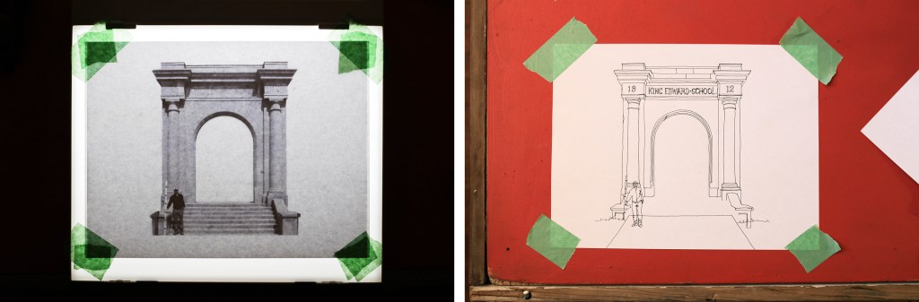 The completed sculpture towers next to cSPACE as an architectural apparition, drawn with steel in physical space. Emulating the King Edward School’s historic grand entrance, the sculpture forms a line-drawing of the sandstone archway and columns, transposed 100 feet from their origin.