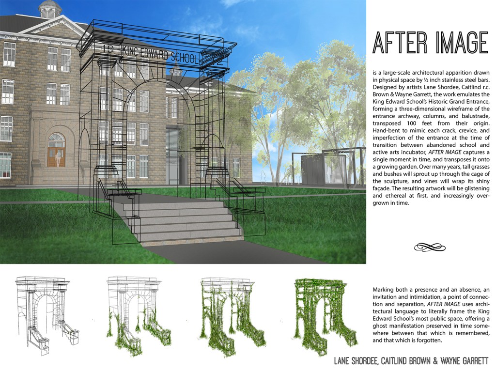 Borrowing from languages of contemporary architecture, AFTER IMAGE draws inspiration from the wireframe, a digital mechanism used to map non-existent architectural spaces prior to construction. We reversed this process, mapping the existing sandstone arch and creating a 22 ft tall physical wireframe emulating the architecture. While the entrance of the King Edward School will continue to change over time, affected by environmental conditions and the ongoing needs of cSPACE’s tenants, AFTER IMAGE proposes a semi-transparent shadow, a 105-year old architectural ghost haunting the school’s nearby public park.