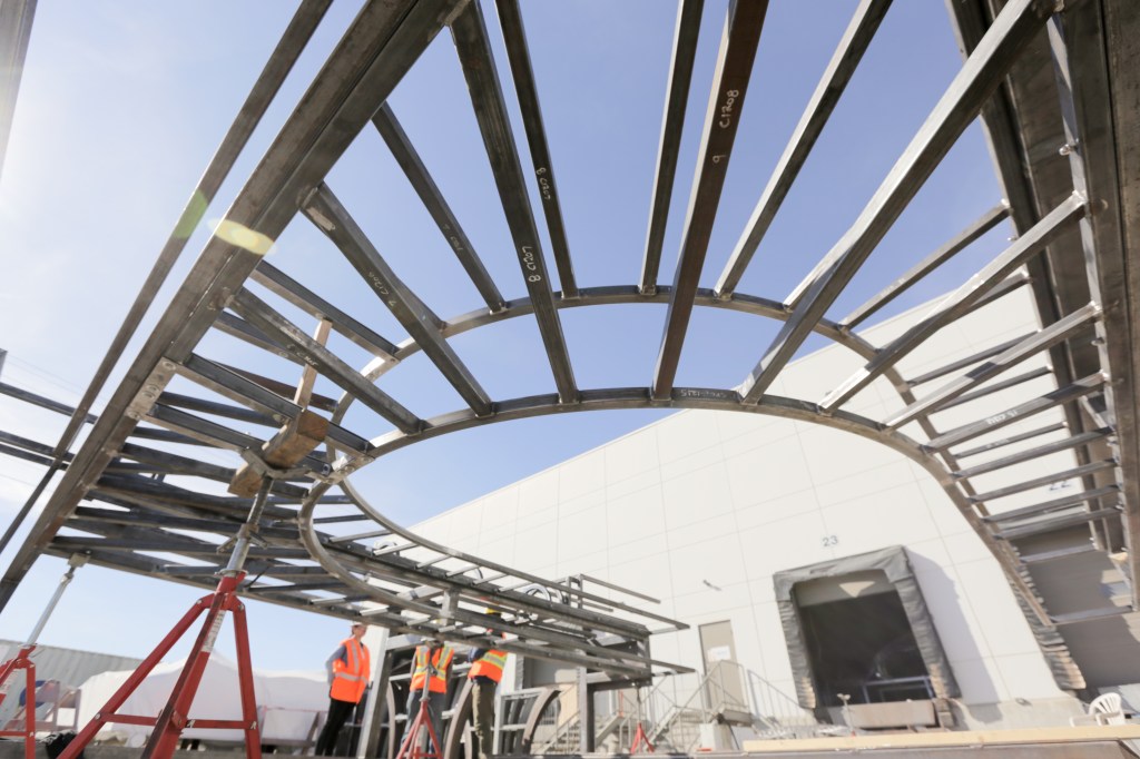 The piece was slotted together in Heavy Industries’ yard as a mock-up test to ensure that everything fit together. It was then sent to the painters, who coated the structure in a high-zinc primer and our chosen paint colour, “Cumulus Gray,” a shimmering paint that changes tone depending on the angle of the sun.