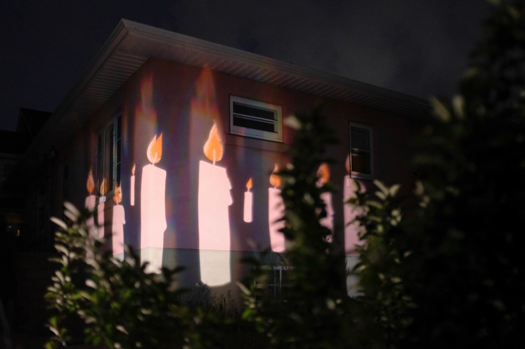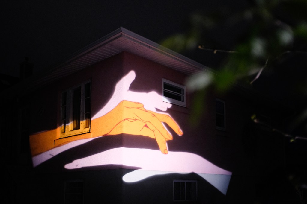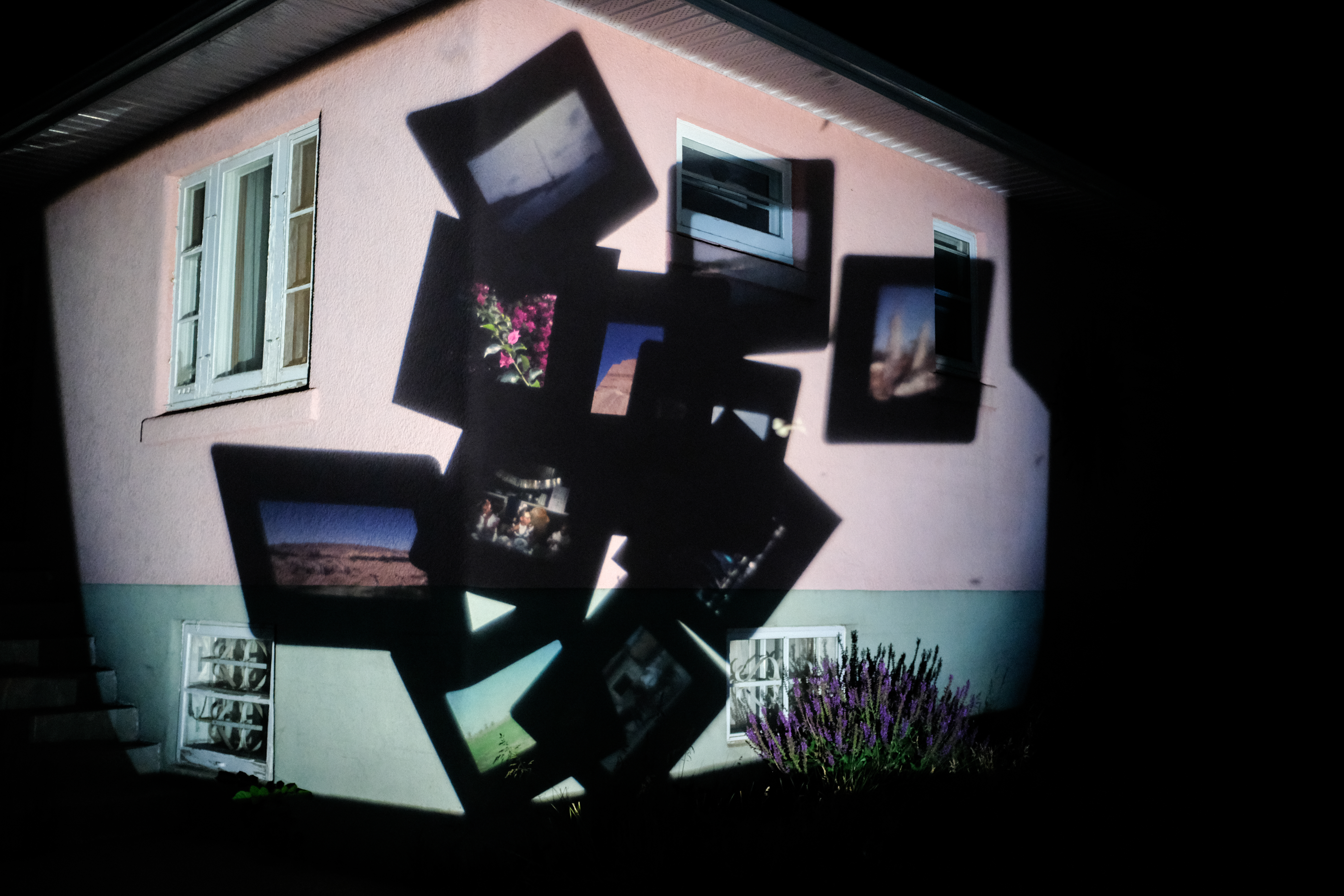 Using an overhead projector, hand-cut from transparencies, theatre gels, and photographic slides, Notes to the Neighbourhood was a series of projections onto our rental house in the Calgary neighbourhood of Ramsay. Projections began in March 2020, and occurred intermittently until September 2020.