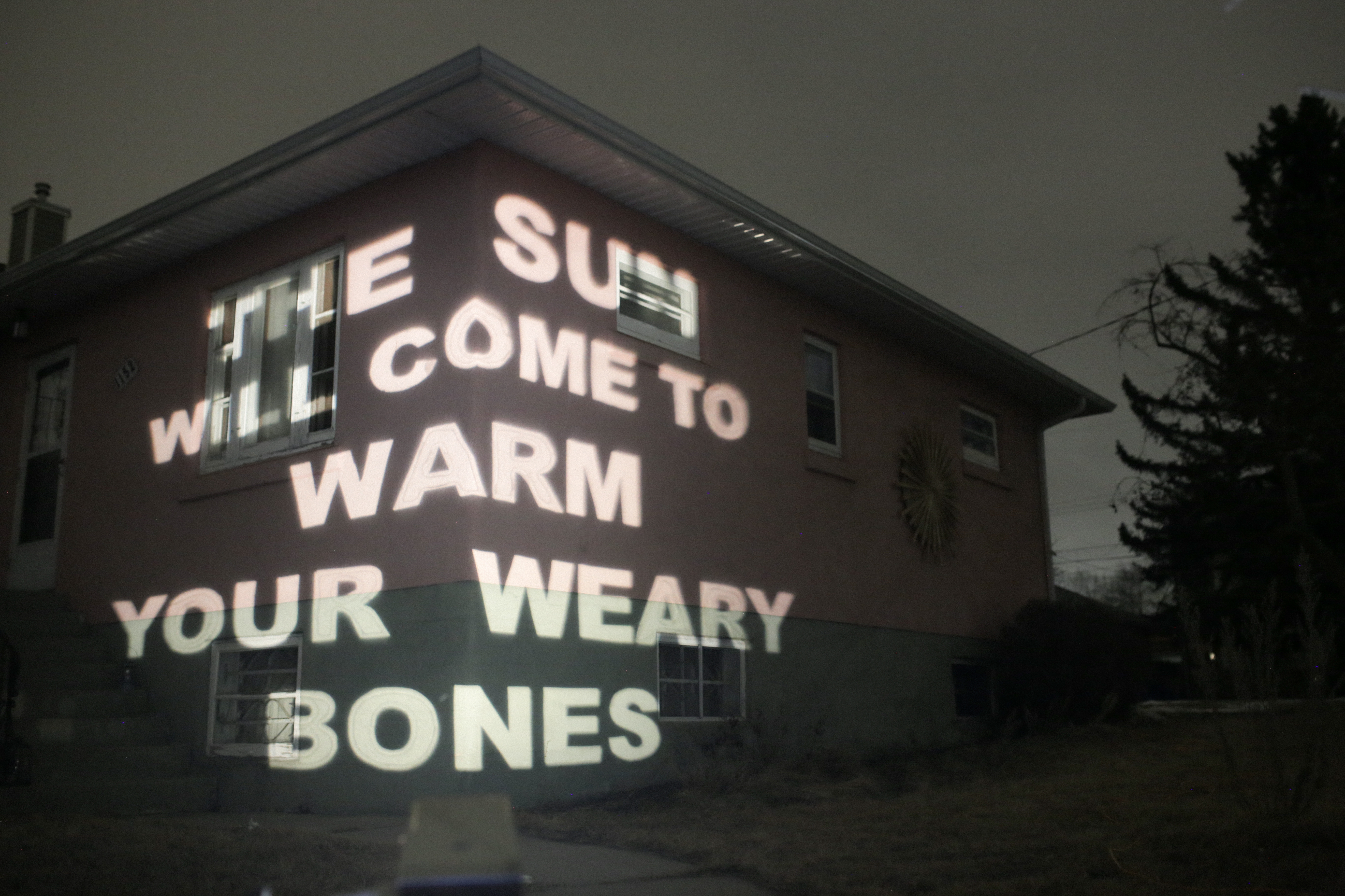 Using an overhead projector, hand-cut from transparencies, theatre gels, and photographic slides, Notes to the Neighbourhood was a series of projections onto our rental house in the Calgary neighbourhood of Ramsay. Projections began in March 2020, and occurred intermittently until September 2020.