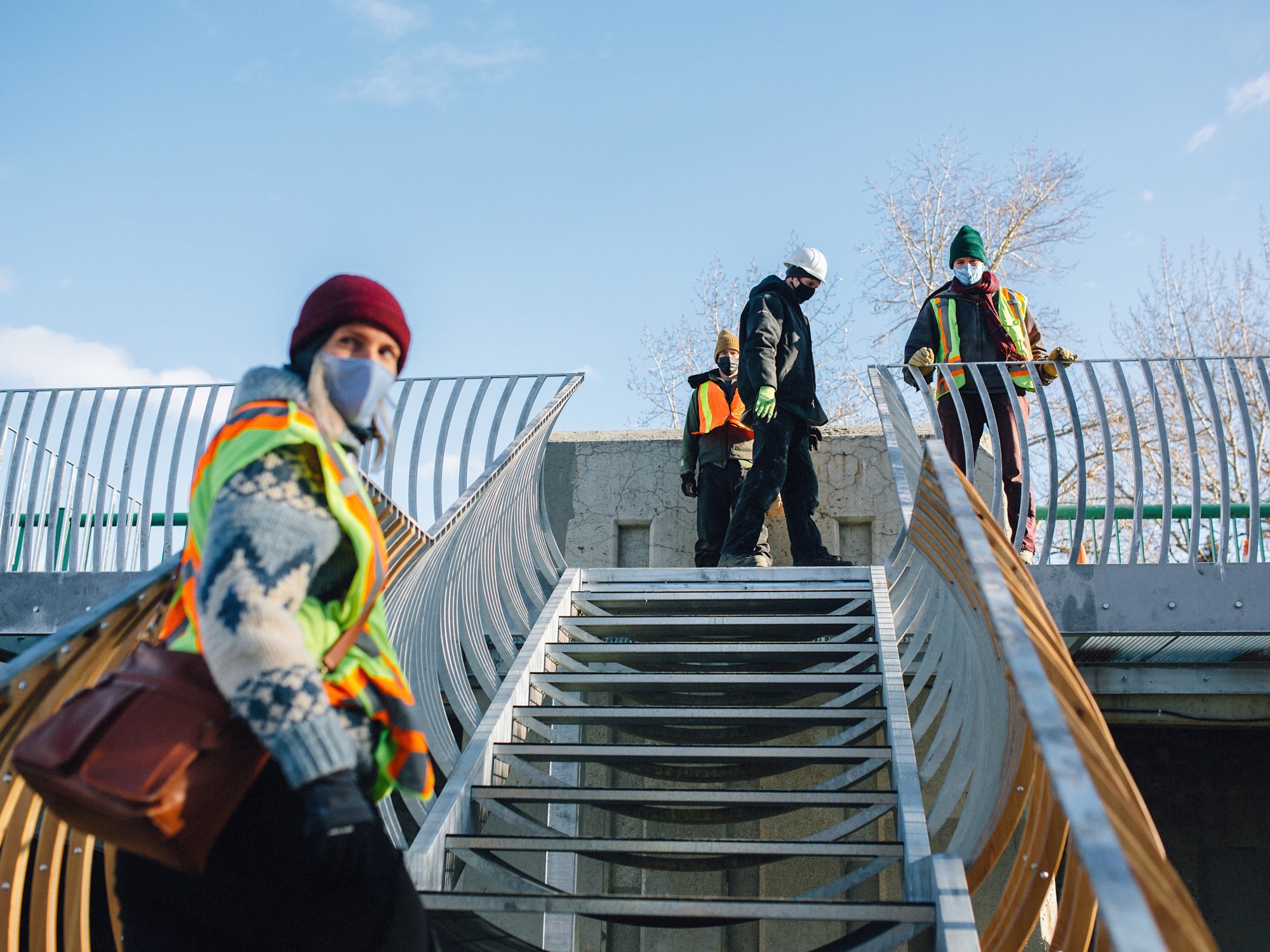 Along with our role as lead artists (in collaboration with Lane Shordee) on The Wandering Island, we designed stairs to guide visitors down onto the island. We titled the piece “Fish Ladder,” a tongue-in-cheek reference to the flood mitigation and fish habitat development that brought the City – and subsequently, our team of public artists – to Elbow Island in the first place.