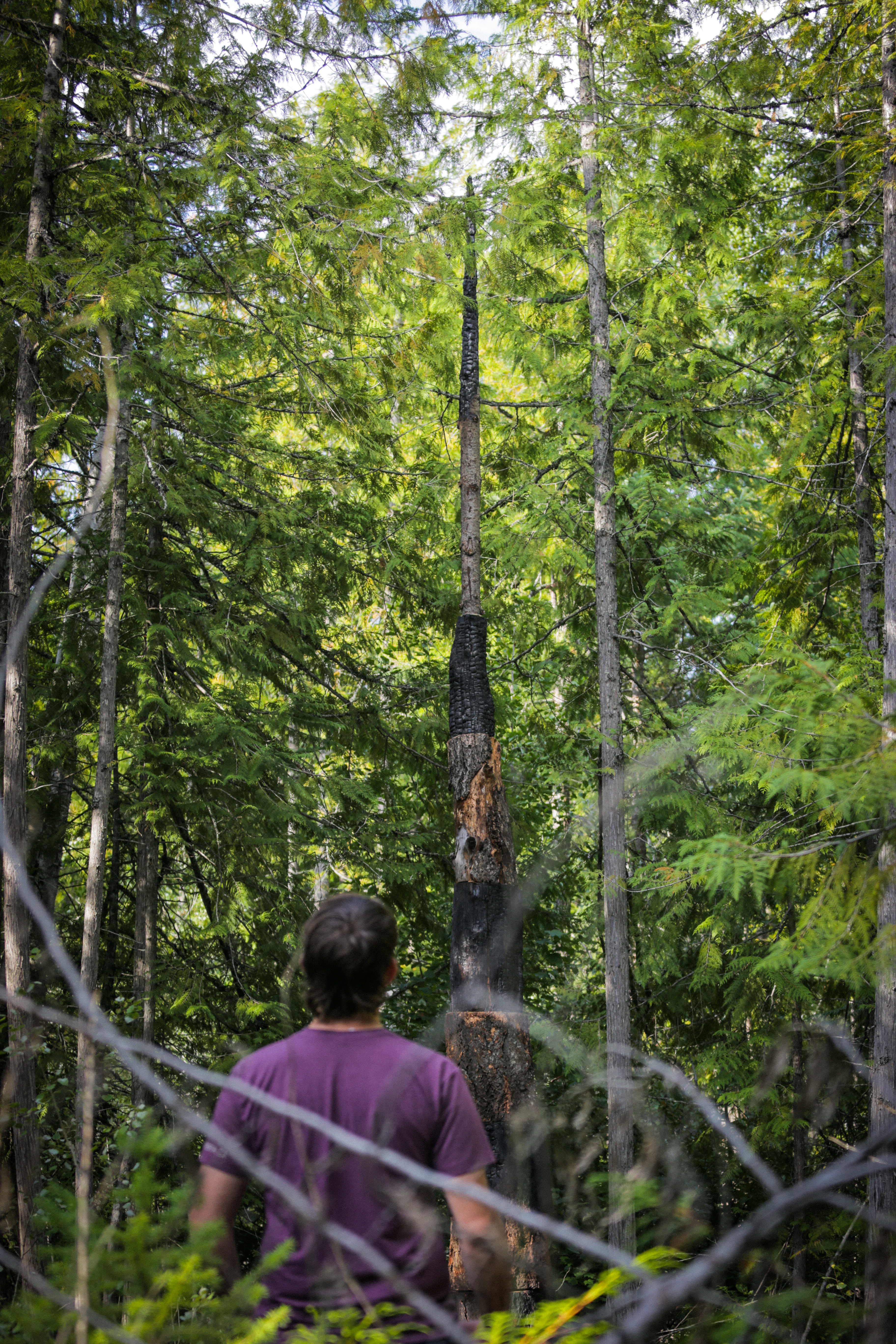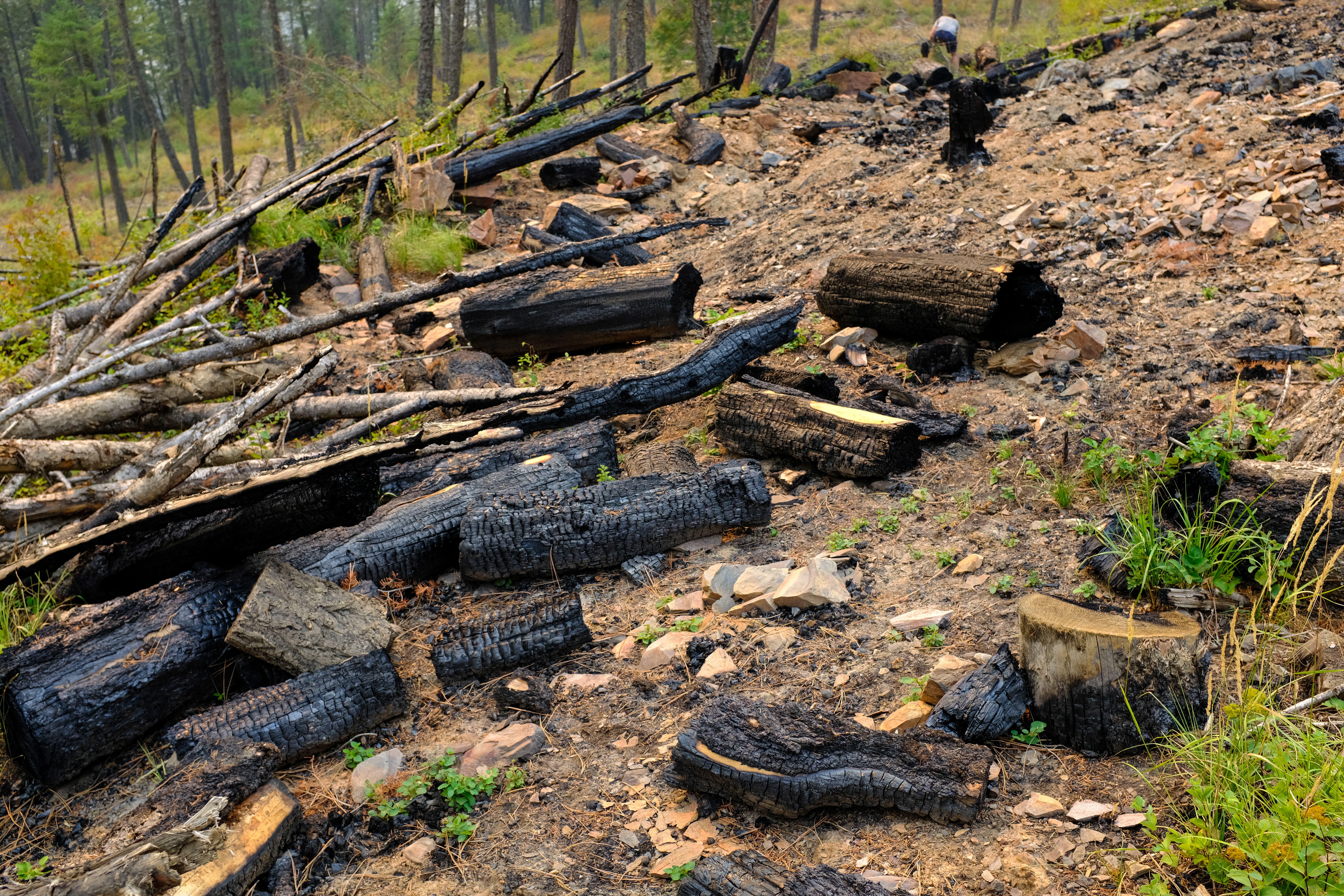 In British Columbia, on the unceded traditional territory of the Yaqan Nukiy within the Ktunaxa Nations, it’s pretty common to see the remains of burn piles on the sides of forestry roads, remnants from controlled burns – one method of wildfire management in forested areas. Each pile is a sculpture garden in its own right, a mix of scorched and raw woods, pyres to a combination of fire management and industrial processes that feel violent, overwhelming in scale, yet somehow commonplace, everyday.