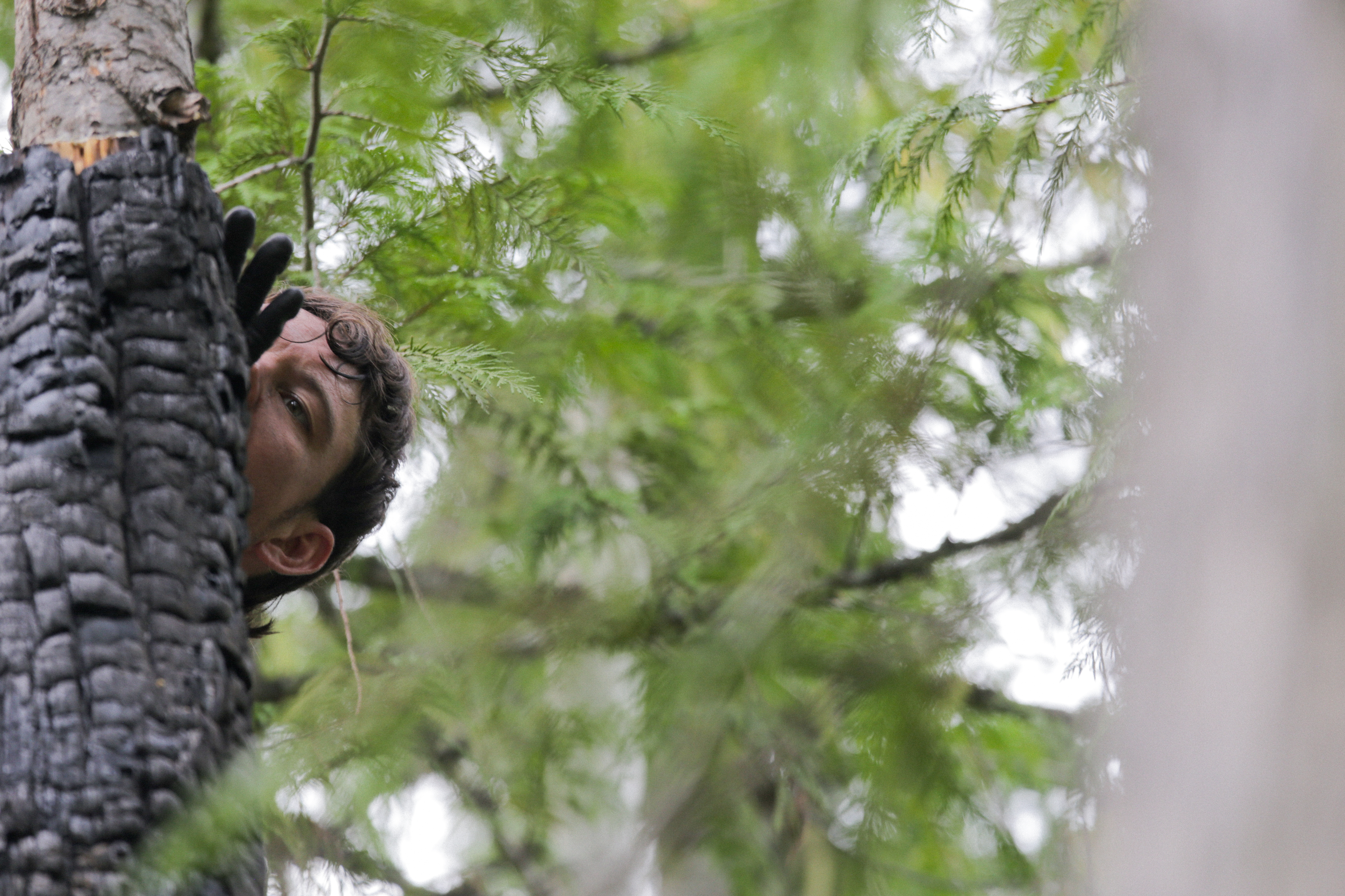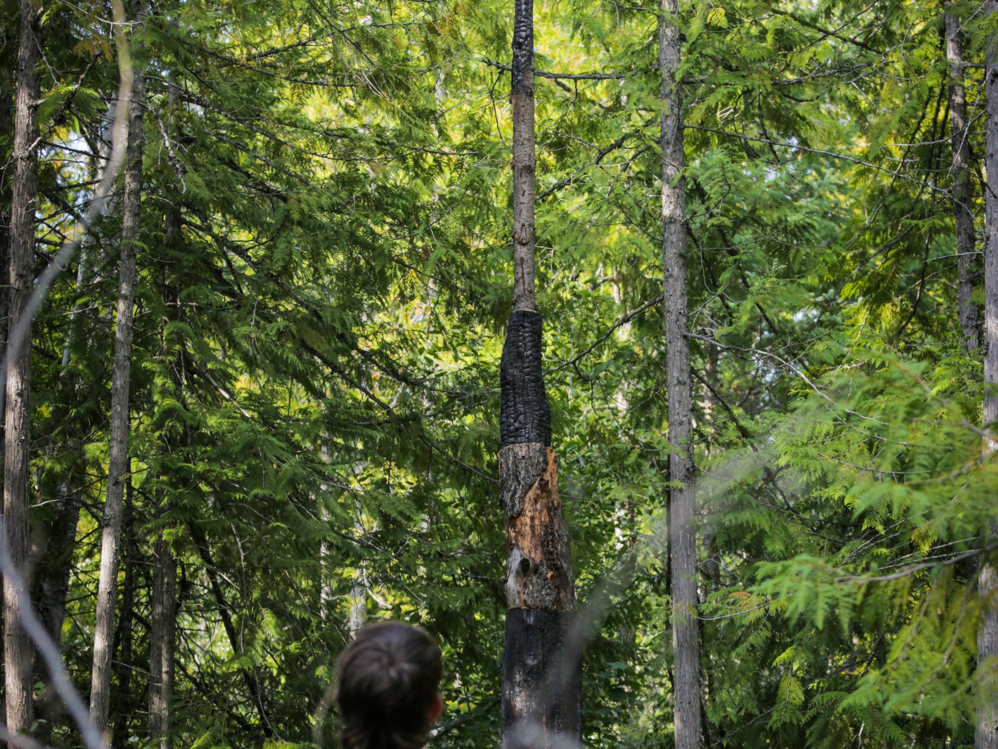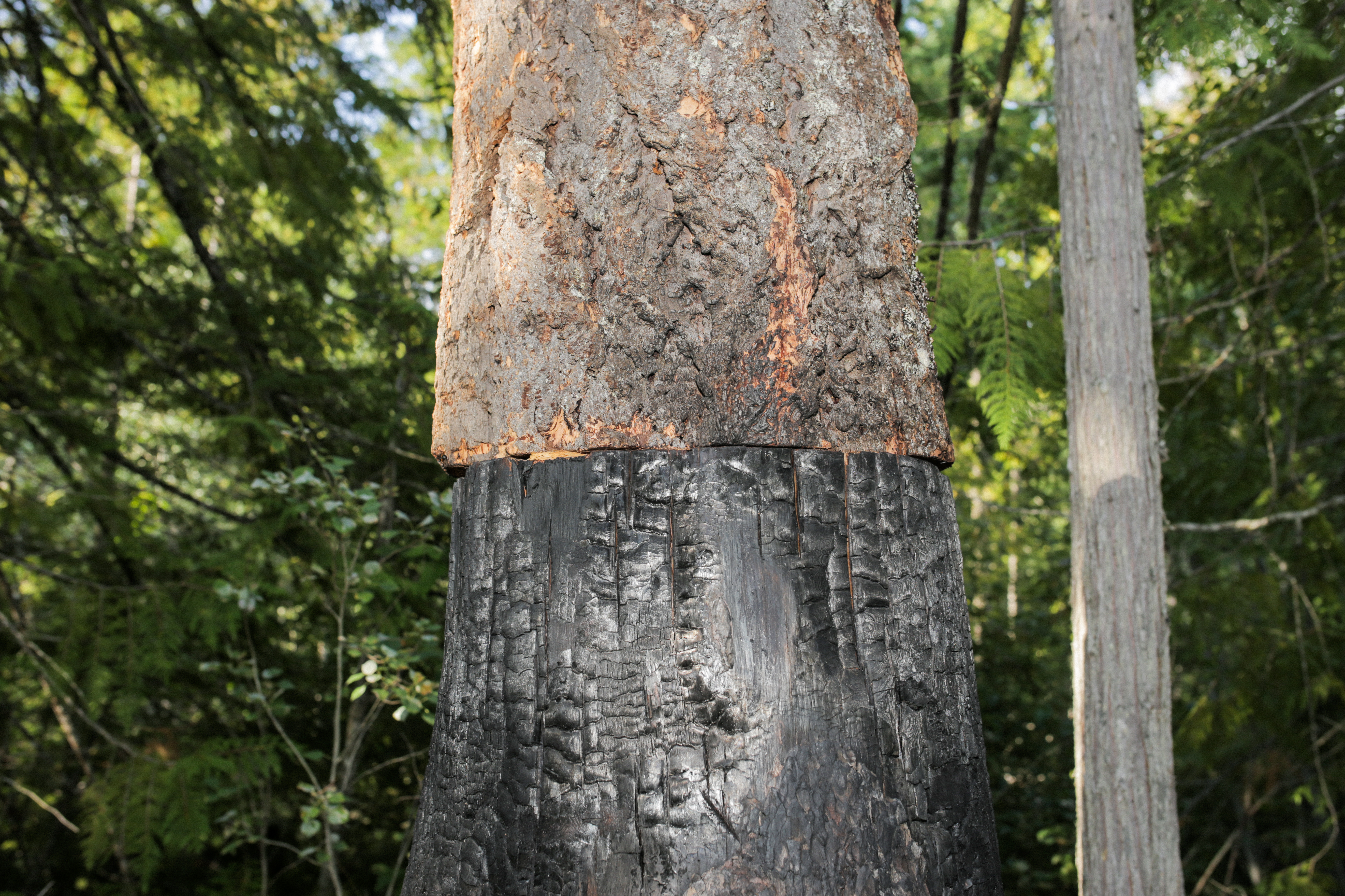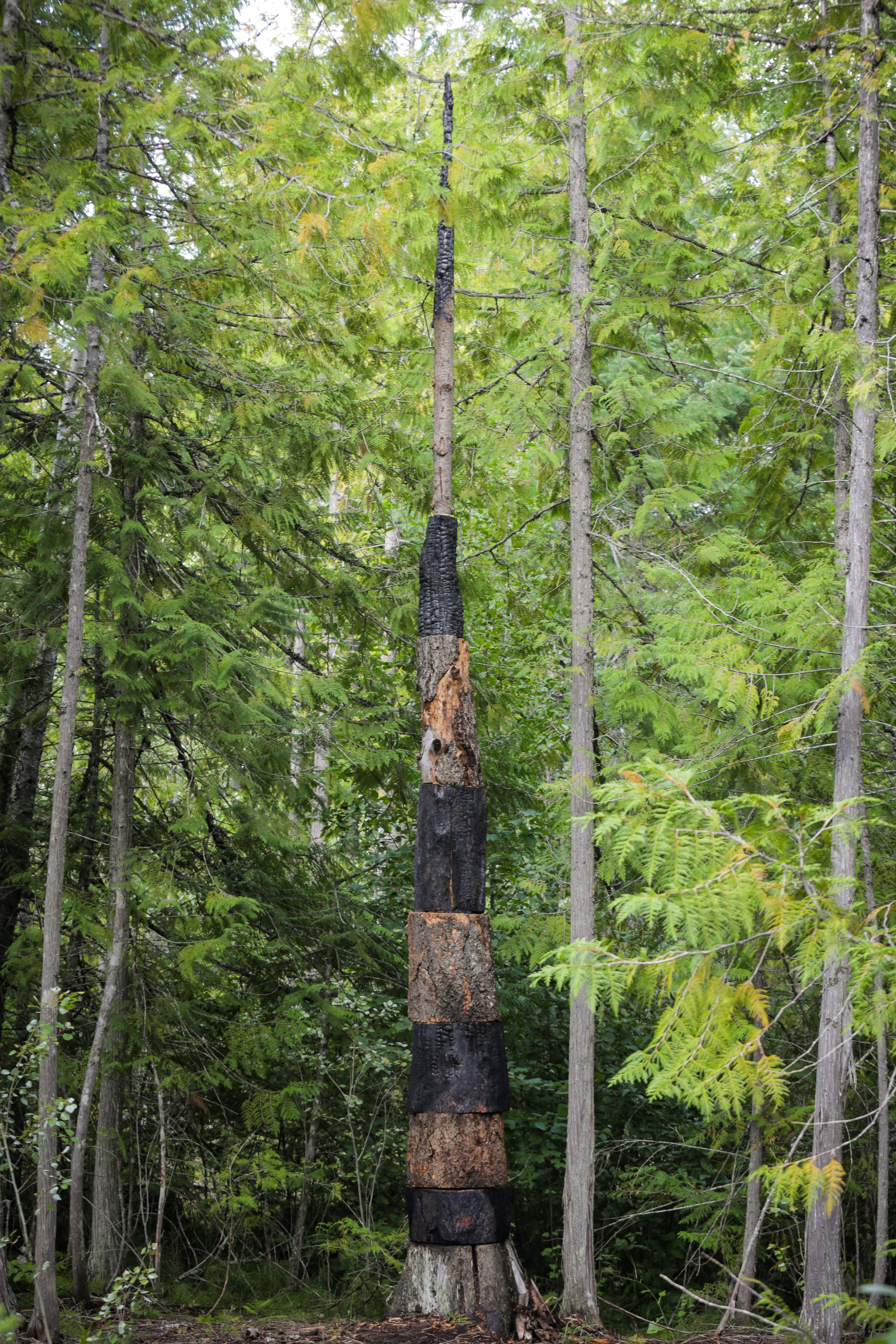Controlled Burn is a spire of alternating scorched and un-scorched wood, stacked in a seemingly precarious tower in the forest at Empire of Dirt. Materials were salvaged from the remains of a burn pile and reconfigured into a monument to human interventions in nature, suggesting equal parts folly and foresight.