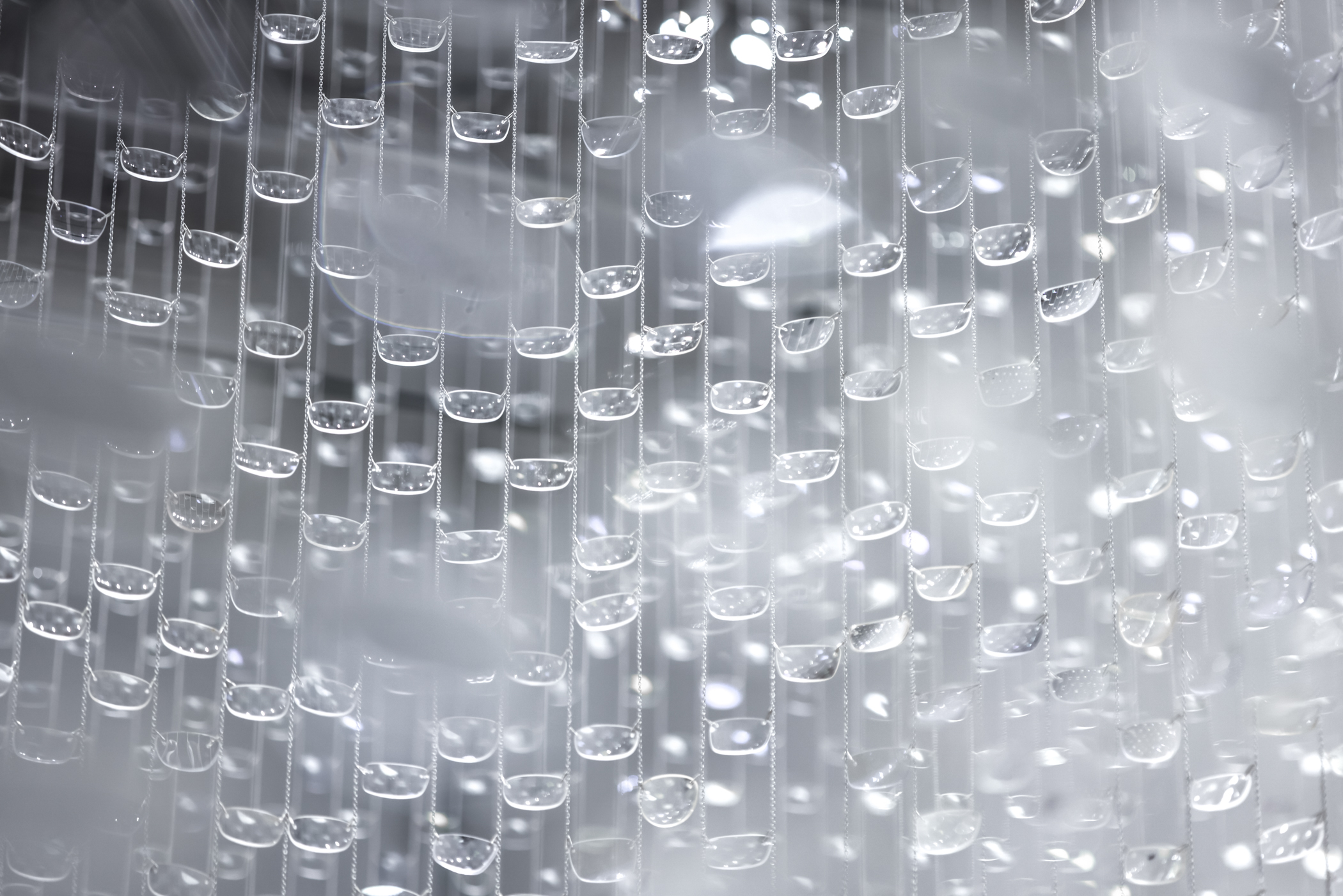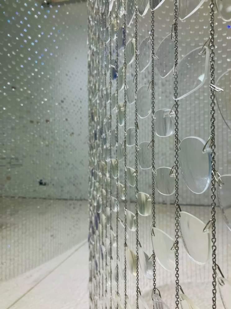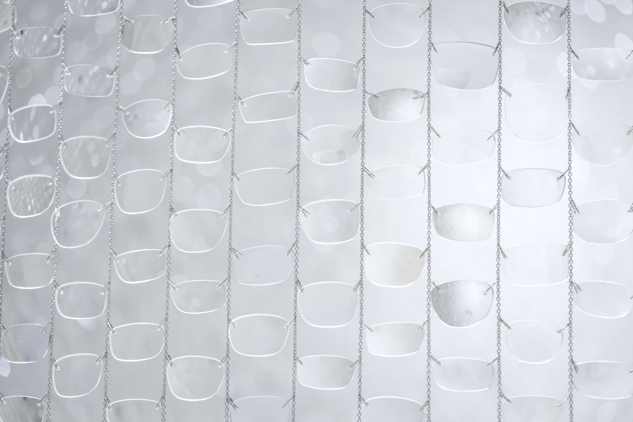 And Between Us, An Ocean is an optical installation evoking shifting perspectives, reciprocity, and distance. 30,000 repurposed eyeglass lenses create a curtain of polycarbonate plastic and delicate chain, shimmering like sheets of falling water. From afar, the installation appears to bisect the gallery with an undulating surface. As you draw closer, an opening in the curtain reveals itself, beckoning you through a narrow channel surrounded by tall glassy walls.