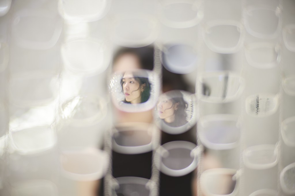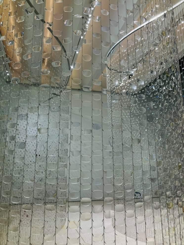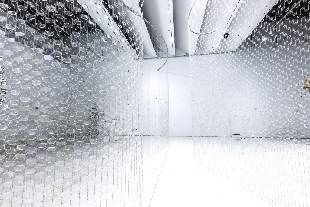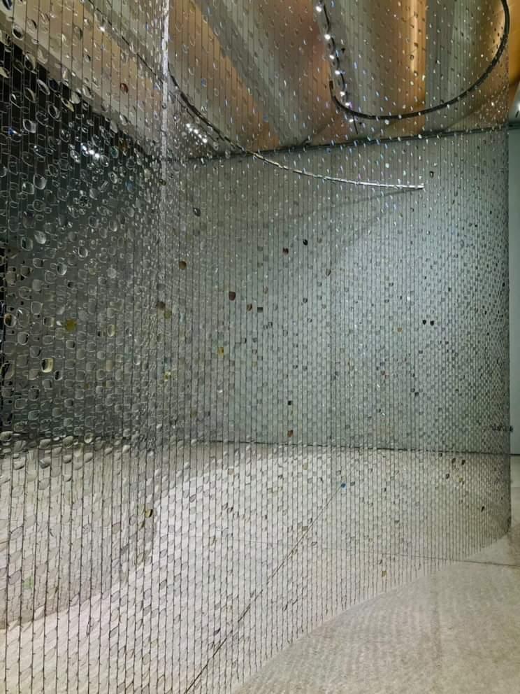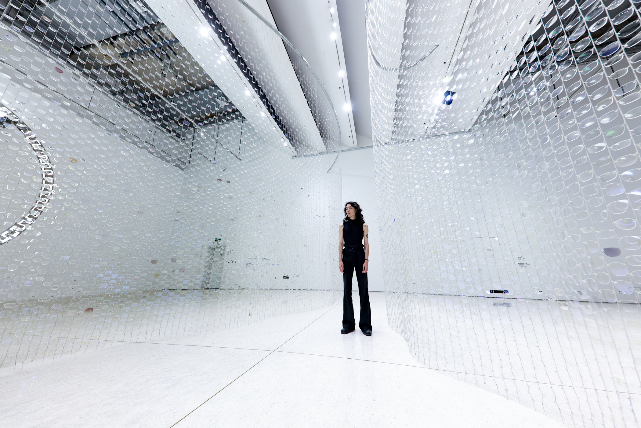 And Between Us, An Ocean is an optical installation evoking shifting perspectives, reciprocity, and distance. 30,000 repurposed eyeglass lenses create a curtain of polycarbonate plastic and delicate chain, shimmering like sheets of falling water. From afar, the installation appears to bisect the gallery with an undulating surface. As you draw closer, an opening in the curtain reveals itself, beckoning you through a narrow channel surrounded by tall glassy walls.