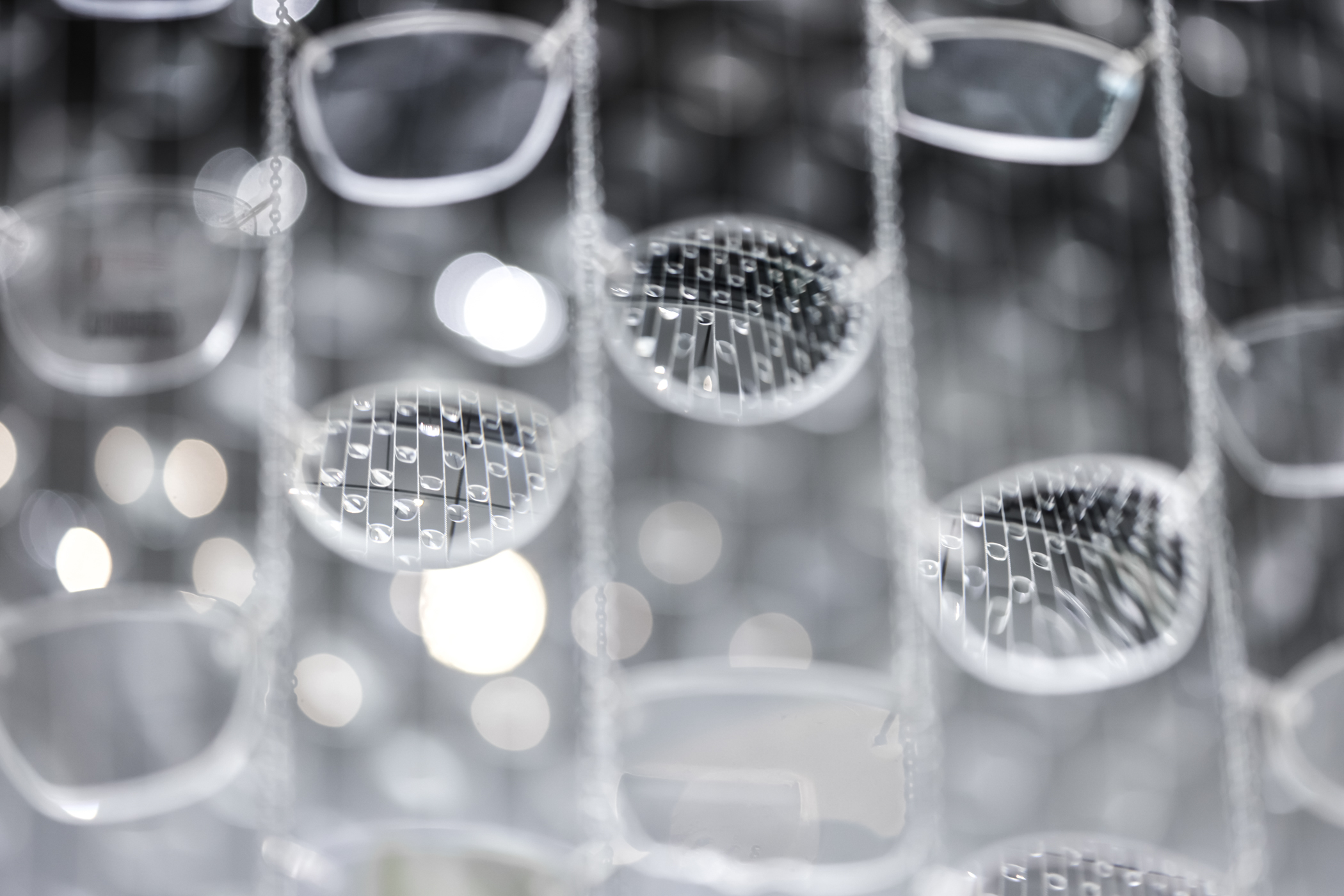 From a distance, your body appears to warp and shimmer as you move, transformed by the optics of prescription lenses. The true nature of the artwork is participatory, inviting a relationship between one side of the shimmering curtain, and the other.