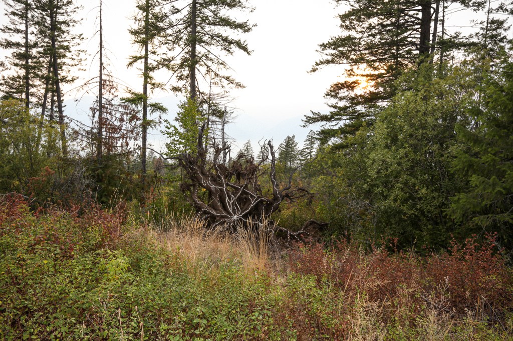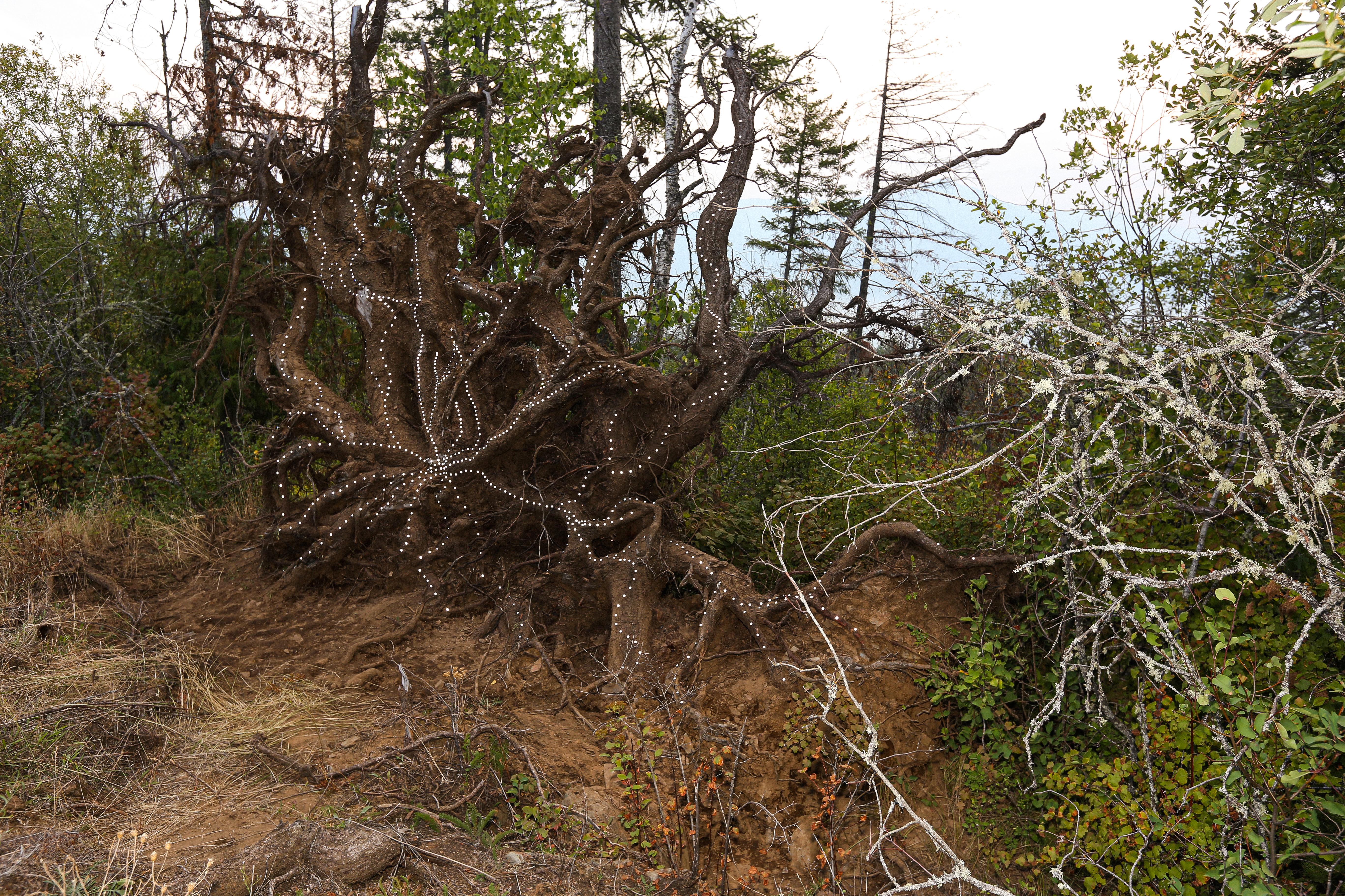 ROOT MASS is an adornments for the death cycle of a fallen tree. A line gesture in the landscape drawing from material concepts previously explored through AFTERGLOW/Aftergrowth (2019), ROOT MASS was created in response to the exposed root ball of a fallen tree at Empire of Dirt, an artist residency on third-growth forest on the unceded traditional territory of the Yaqan Nukiy within the Ktunaxa Nations, near Creston, British Columbia.