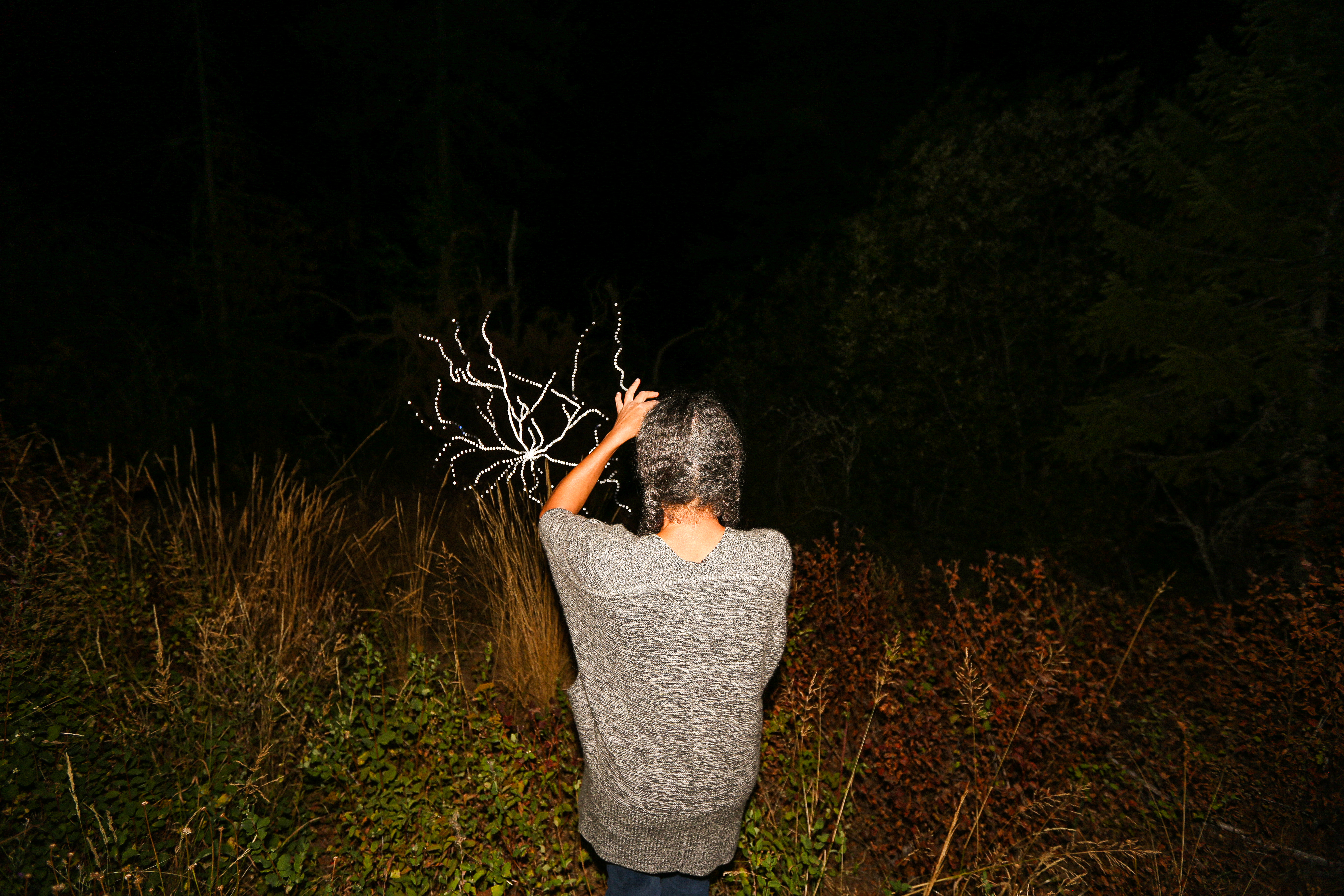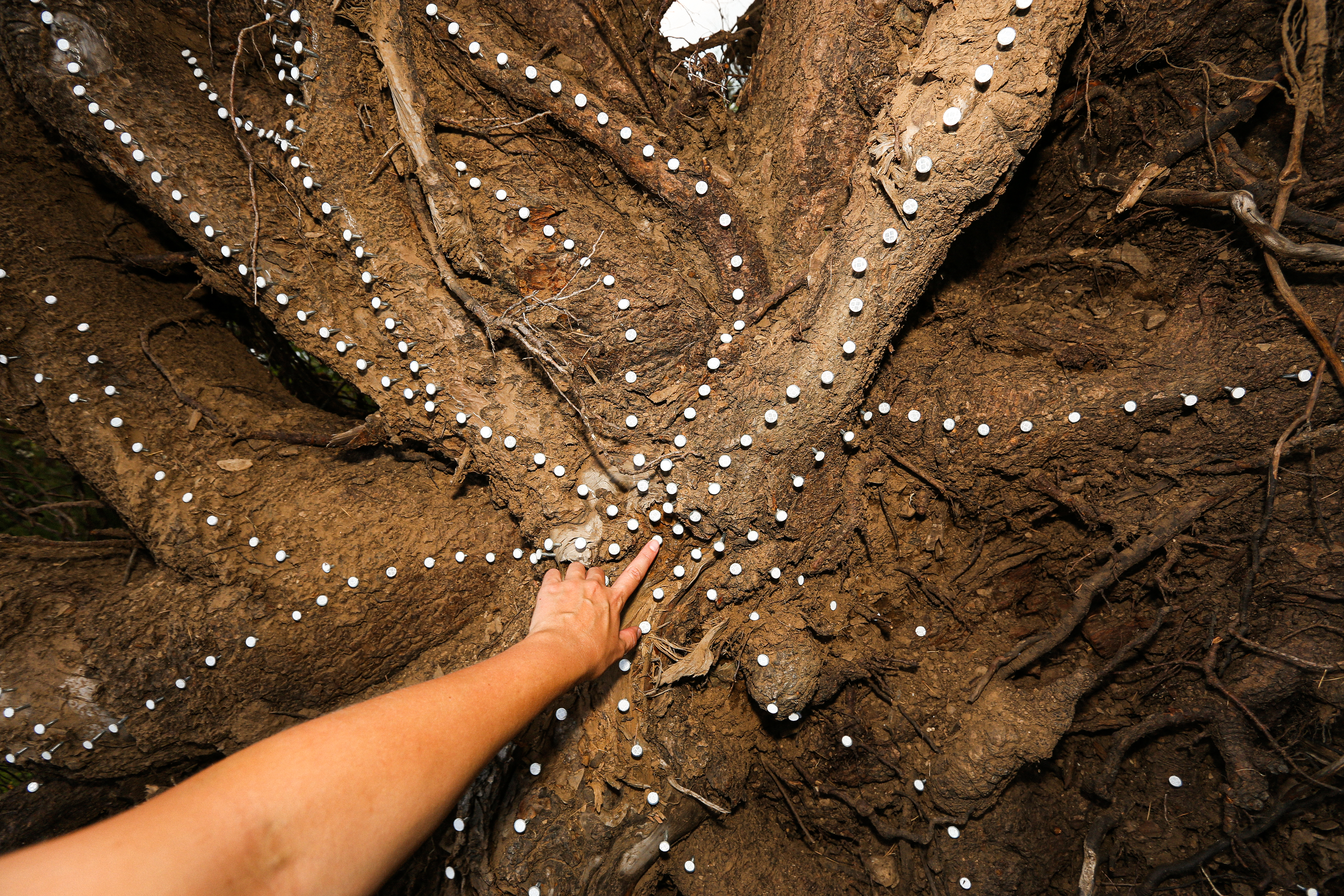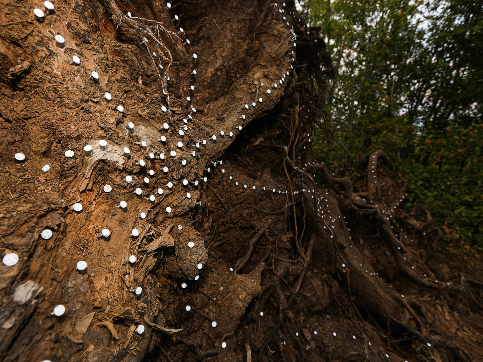 ROOT MASS is intended as a small gesture of celebration for the death cycle of a significant conifer; a line drawing in collaboration with the fallen tree. Delicate dots entwine the roots like an infestation of luminous insects, cut from reflective Prismatic material. Often used as the substrate for road signs, Prismatic is designed to reflect headlights, flashlights, and other light sources, illuminating passively like the eyes of a nocturnal creature.