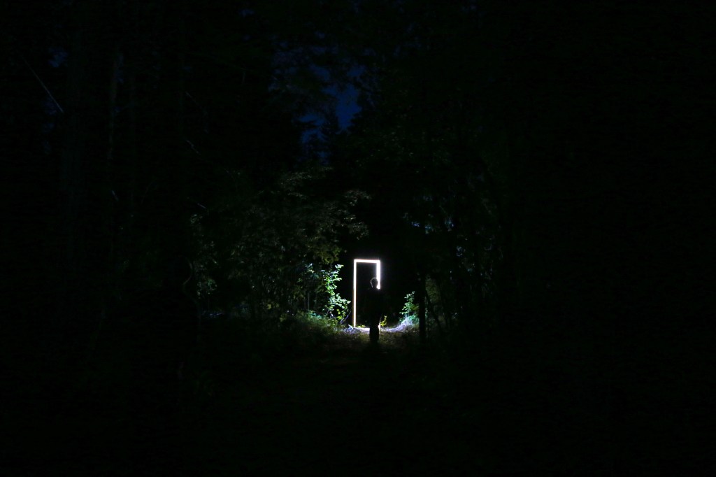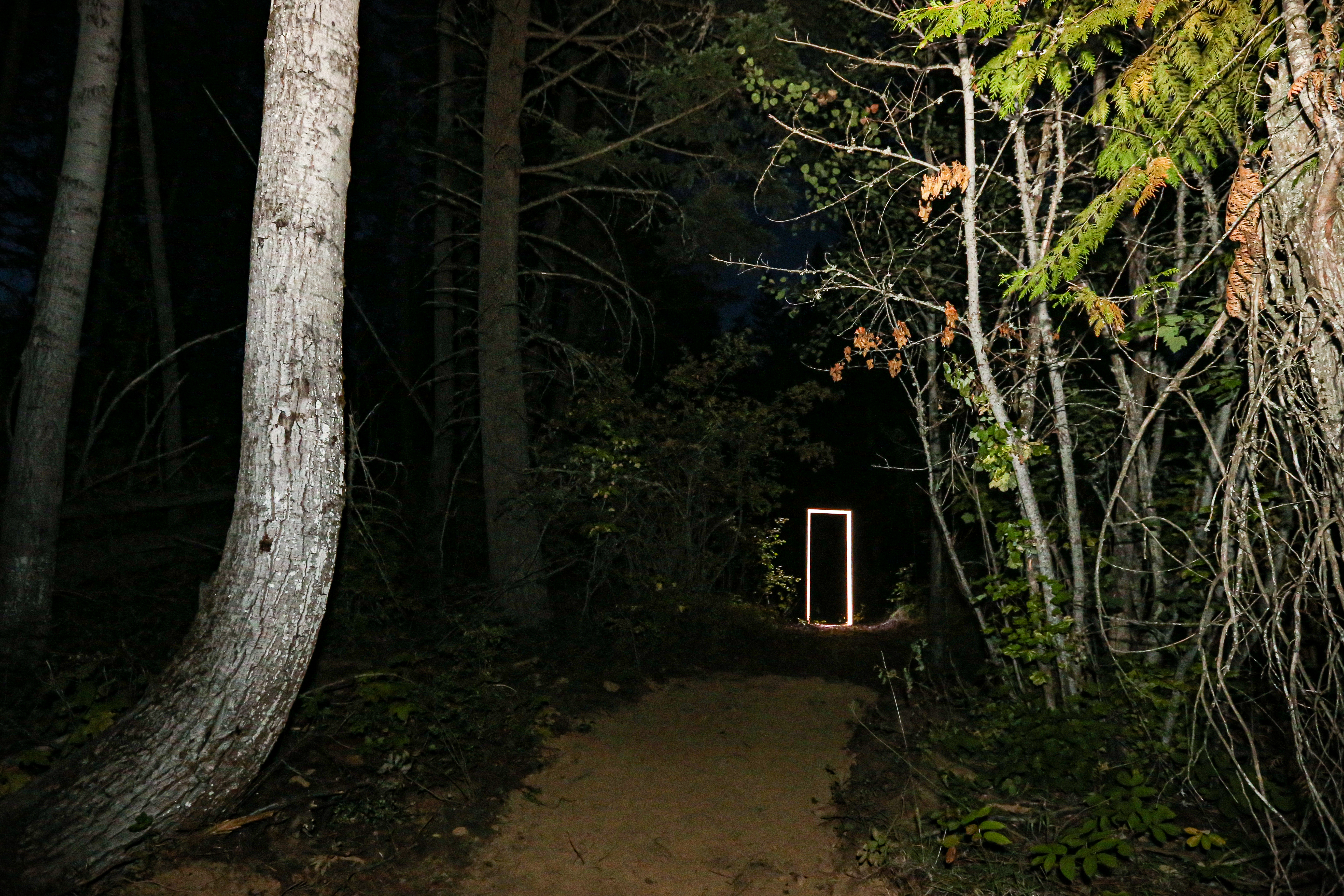 Changes in temperature, elevation, and smell were amplified and abstracted. In the black between gates, branches reached out to touch your arms and face. Time shifted, and eventually the edge of the woods gave way to a grass-filled field.