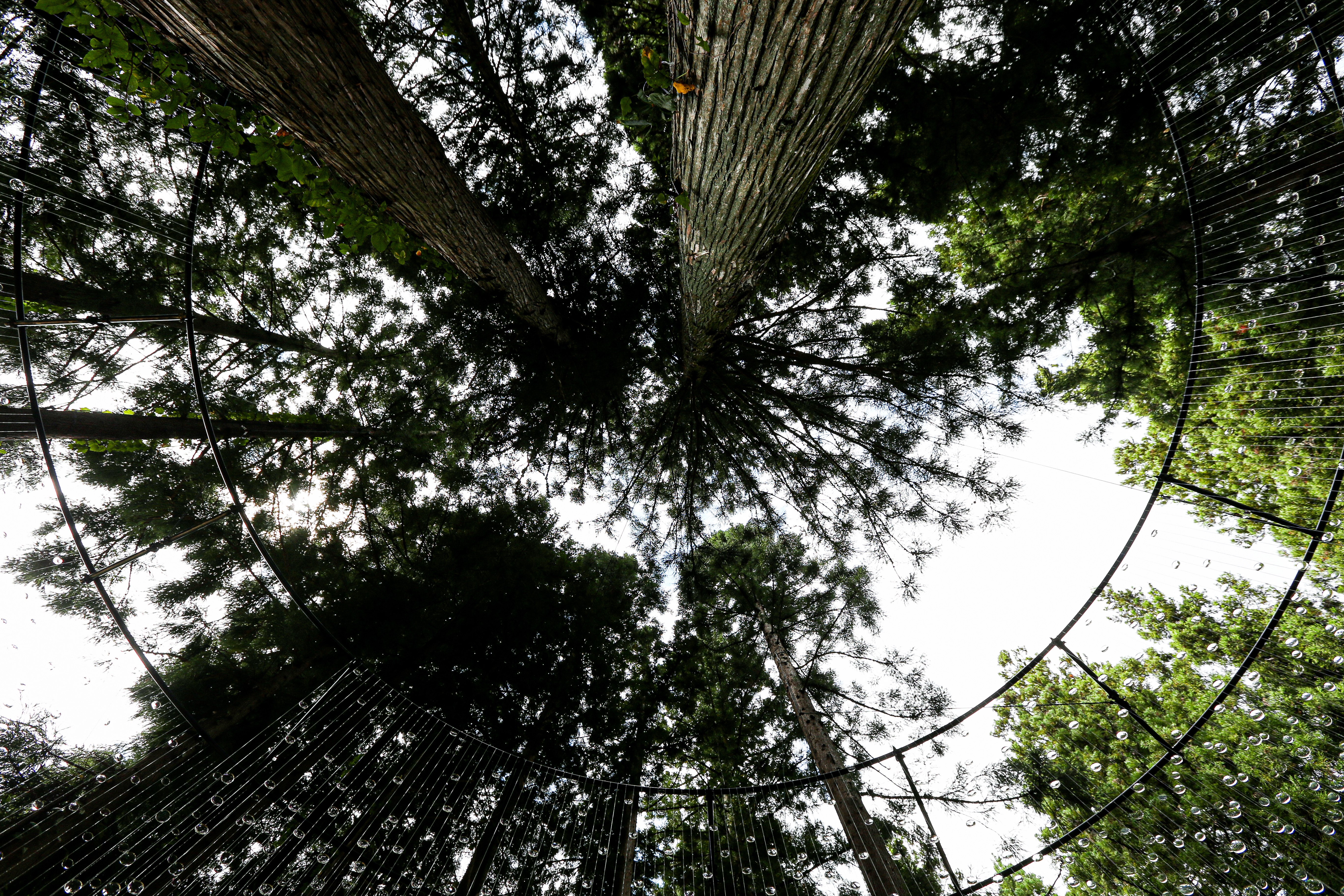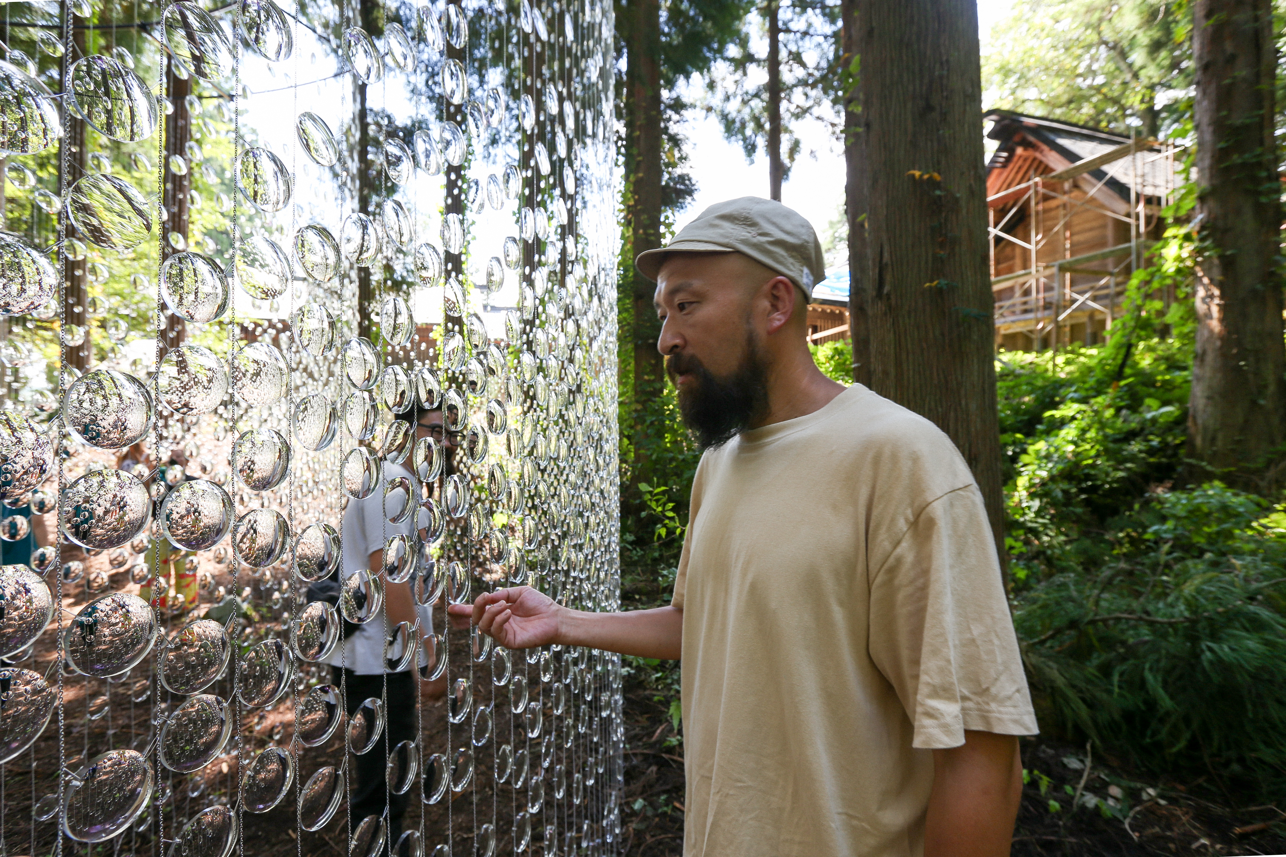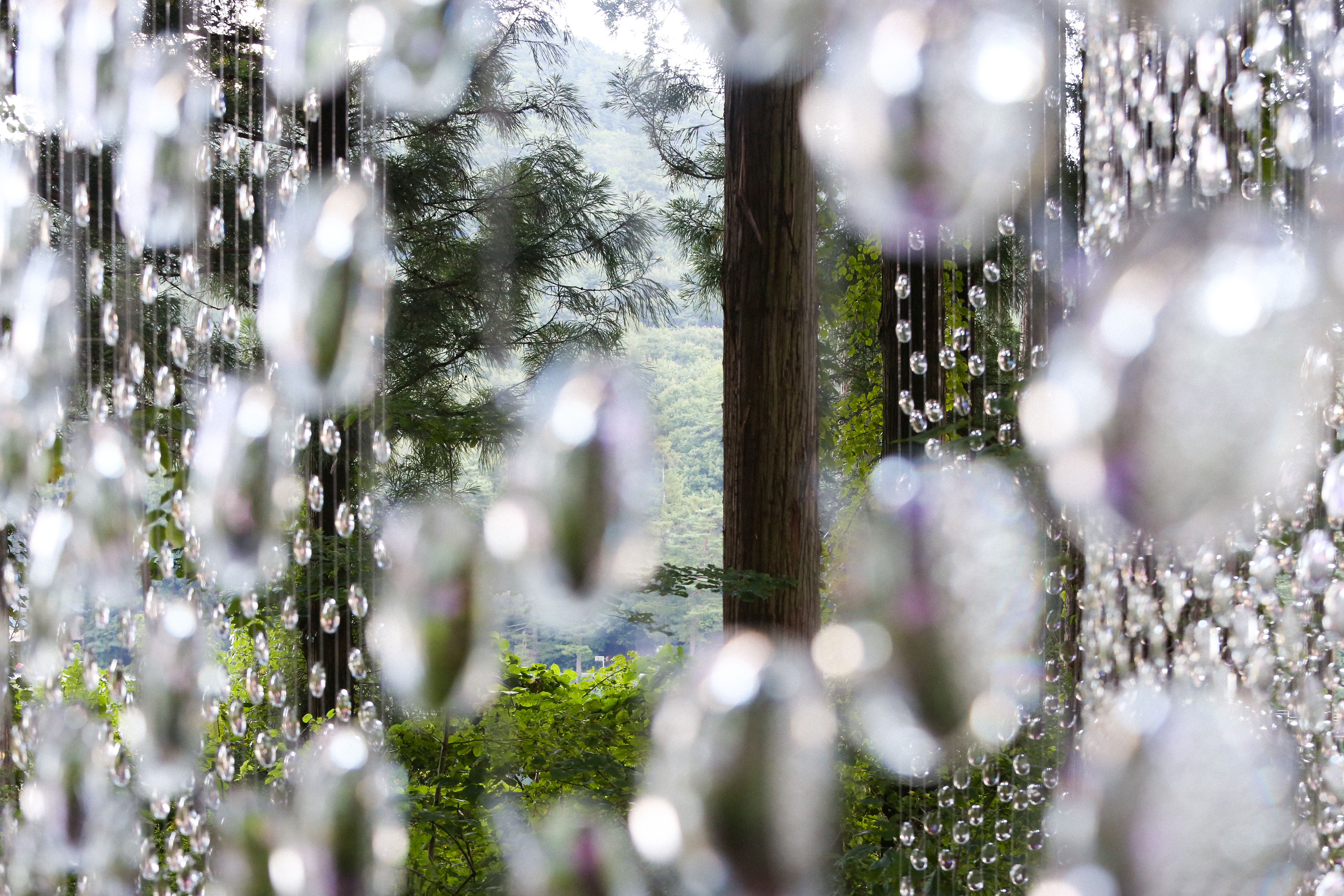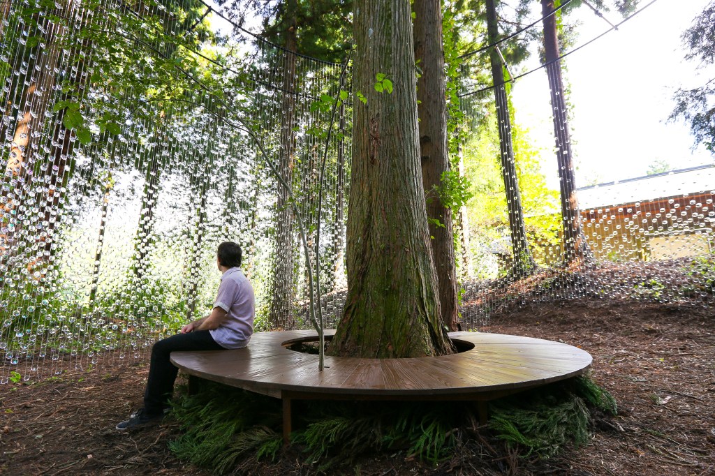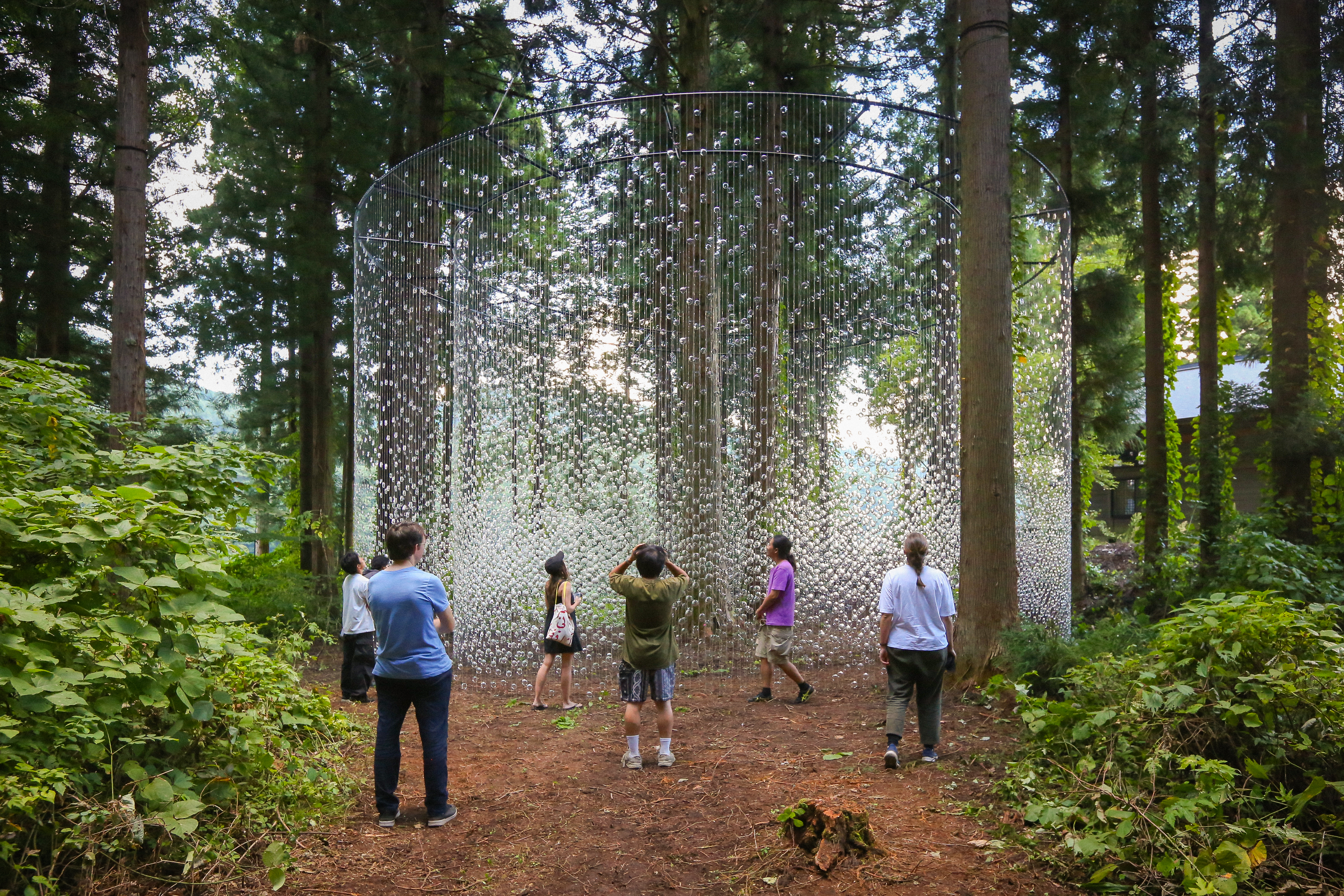 A Whisper in the Eyes of the Storm invites visitors to see what they’d normally overlook. The work is installed in a cedar forest behind Nishina Shrine along the shore of Lake Kizaki. The work invites visitors to look at the landscape (and each other) with fresh eyes, seeing differently and peering deeply into the ancient and evolving landscape.