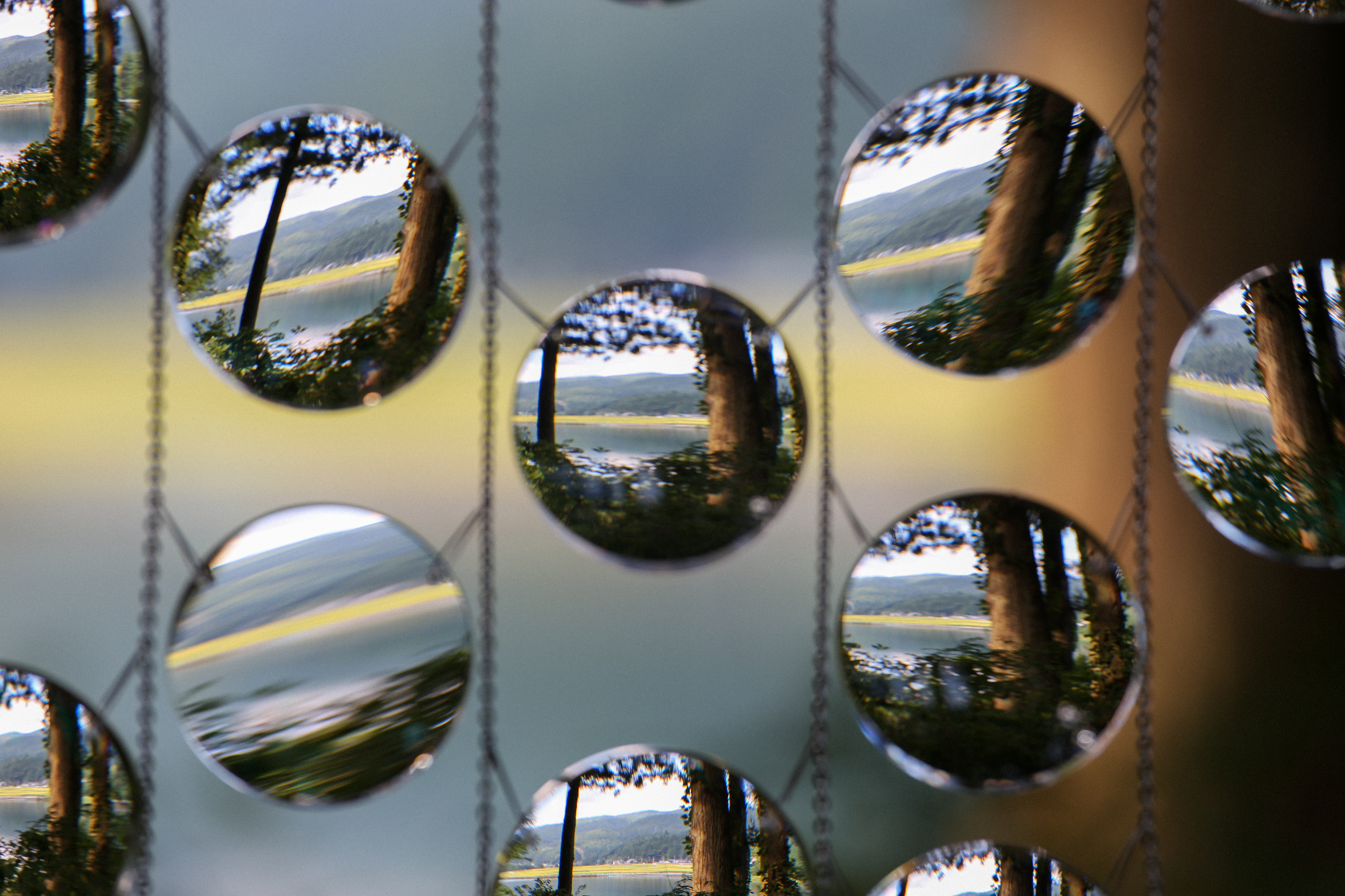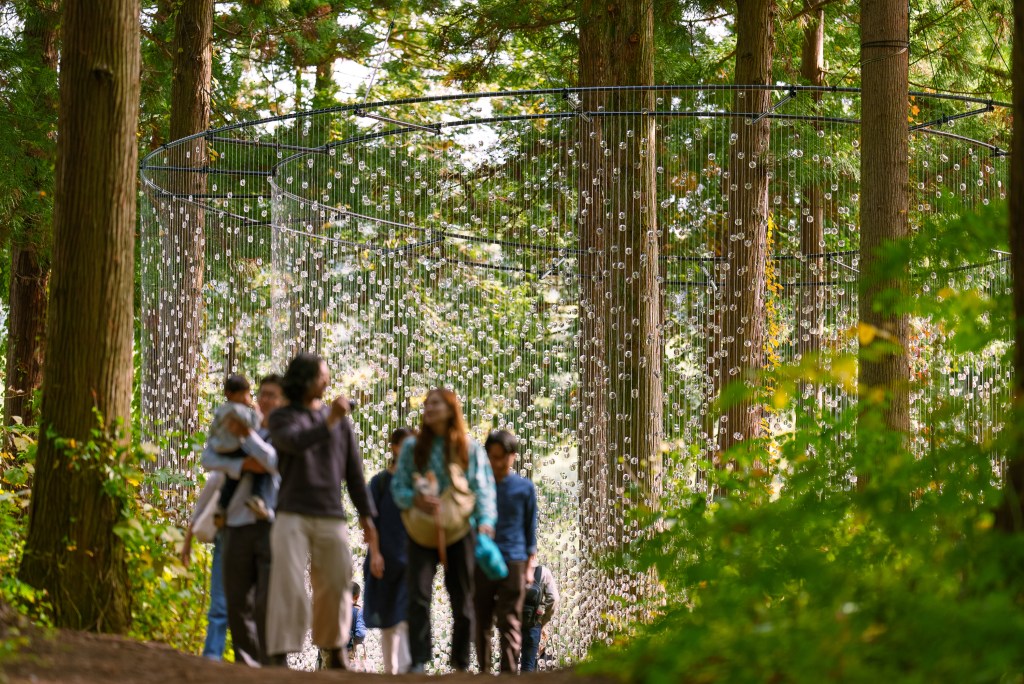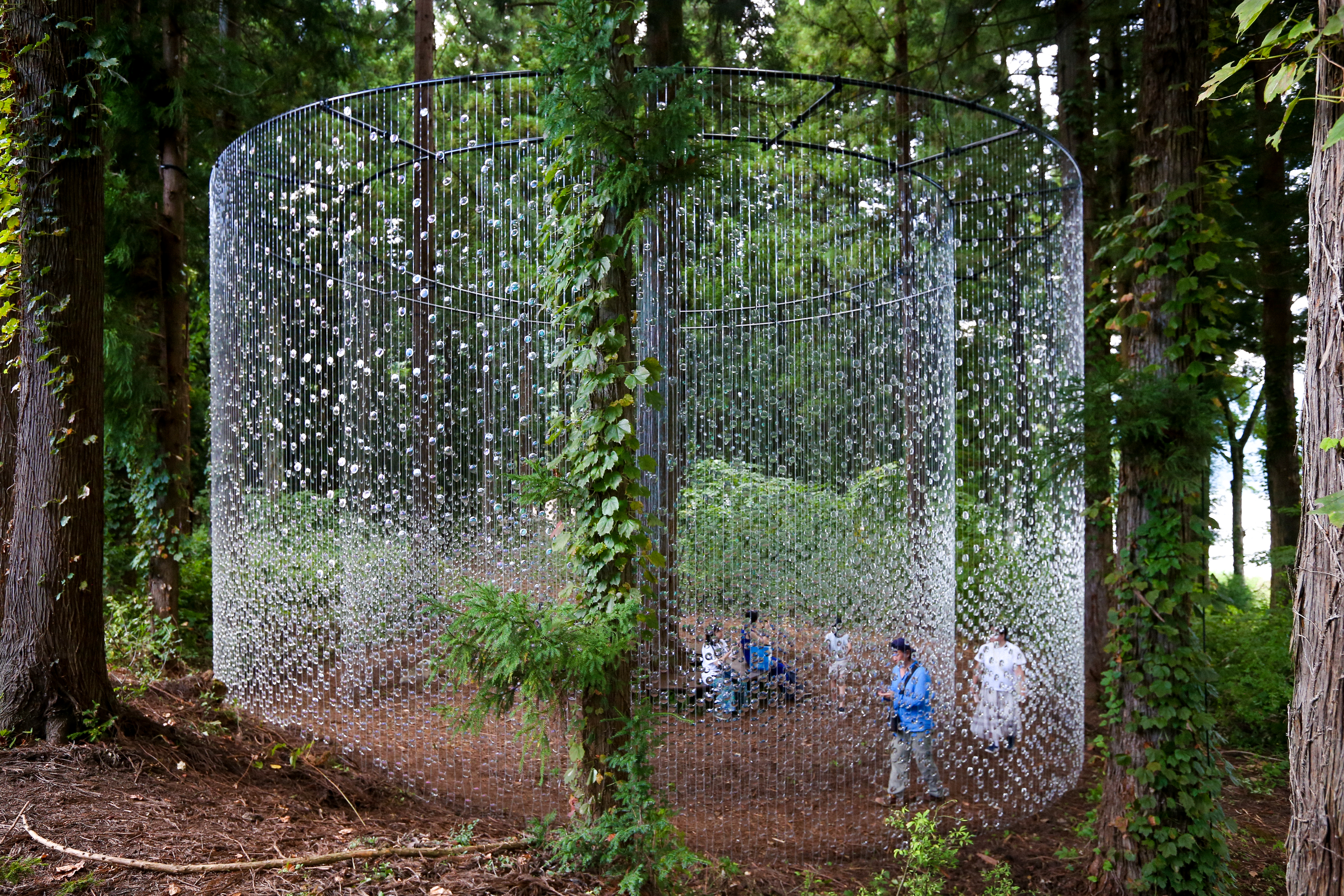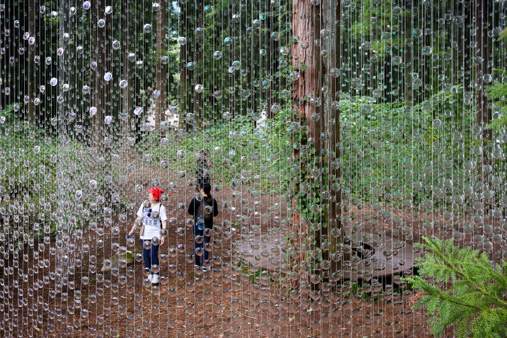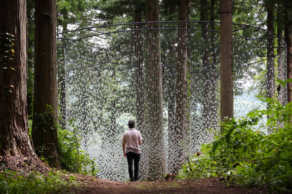 A Whisper in the Eyes of the Storm invites visitors to see what they’d normally overlook. The work is installed in a cedar forest behind Nishina Shrine along the shore of Lake Kizaki. The work invites visitors to look at the landscape (and each other) with fresh eyes, seeing differently and peering deeply into the ancient and evolving landscape.