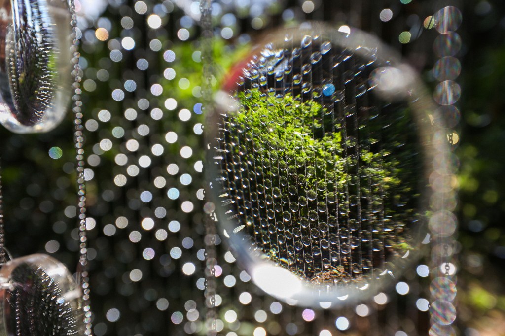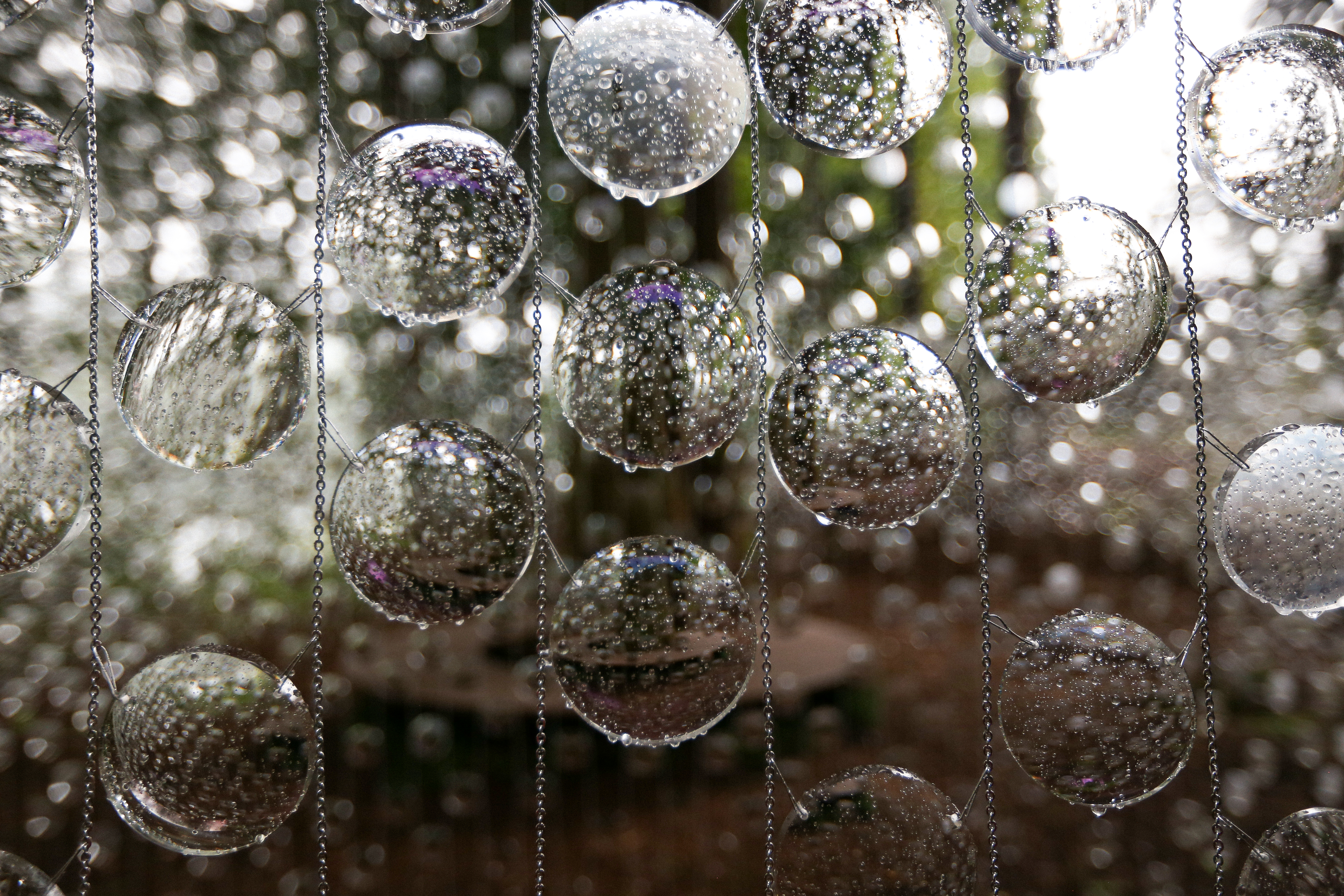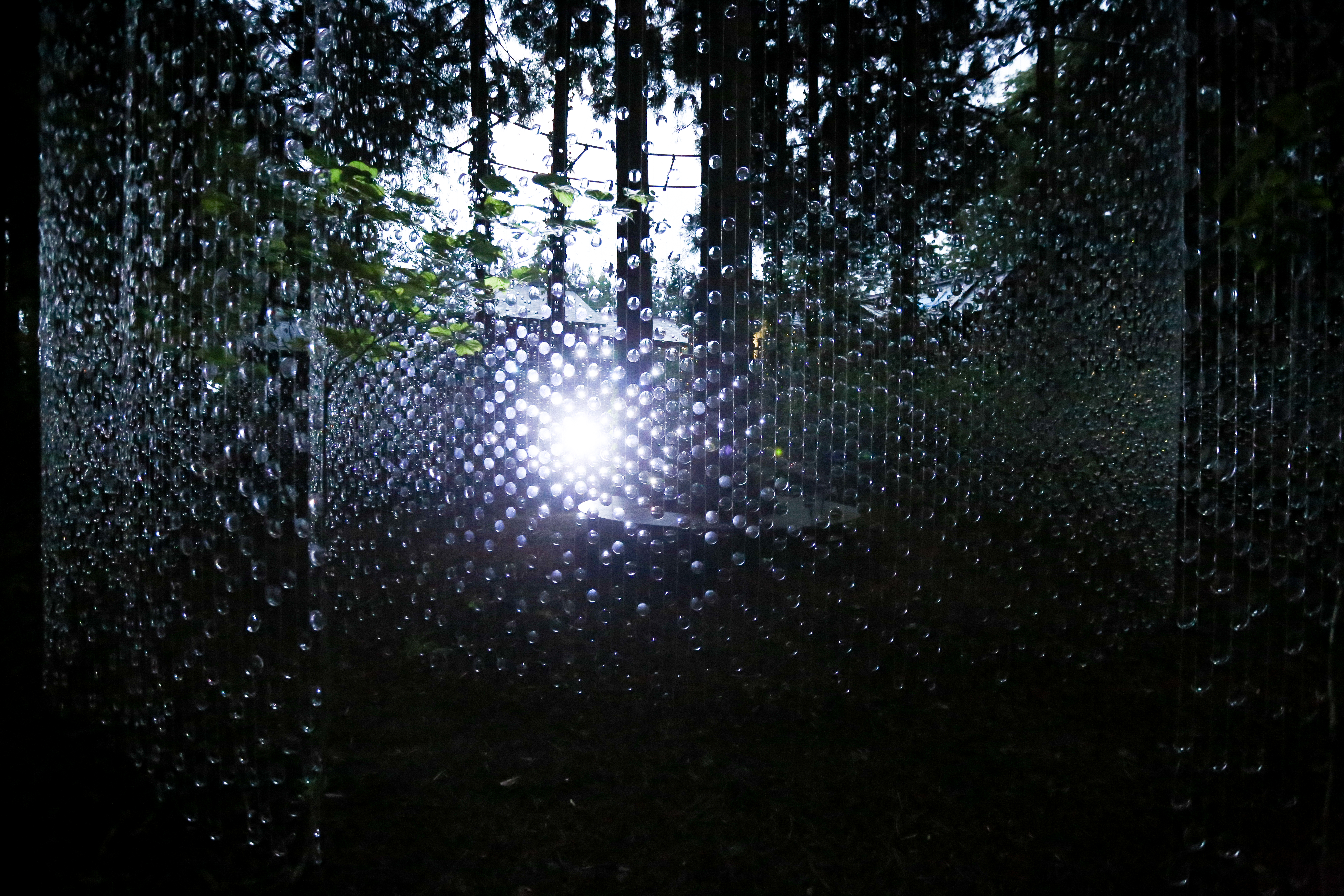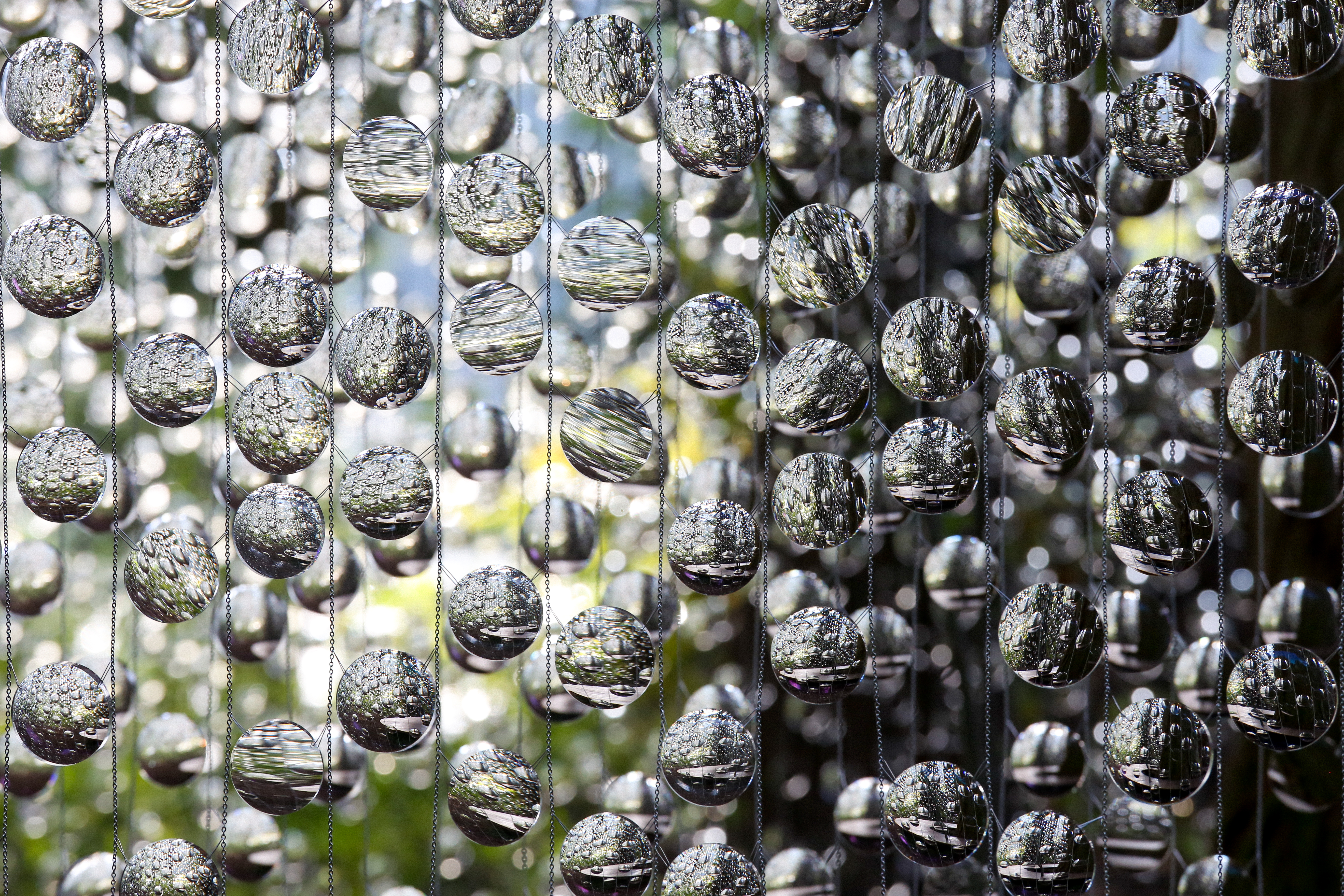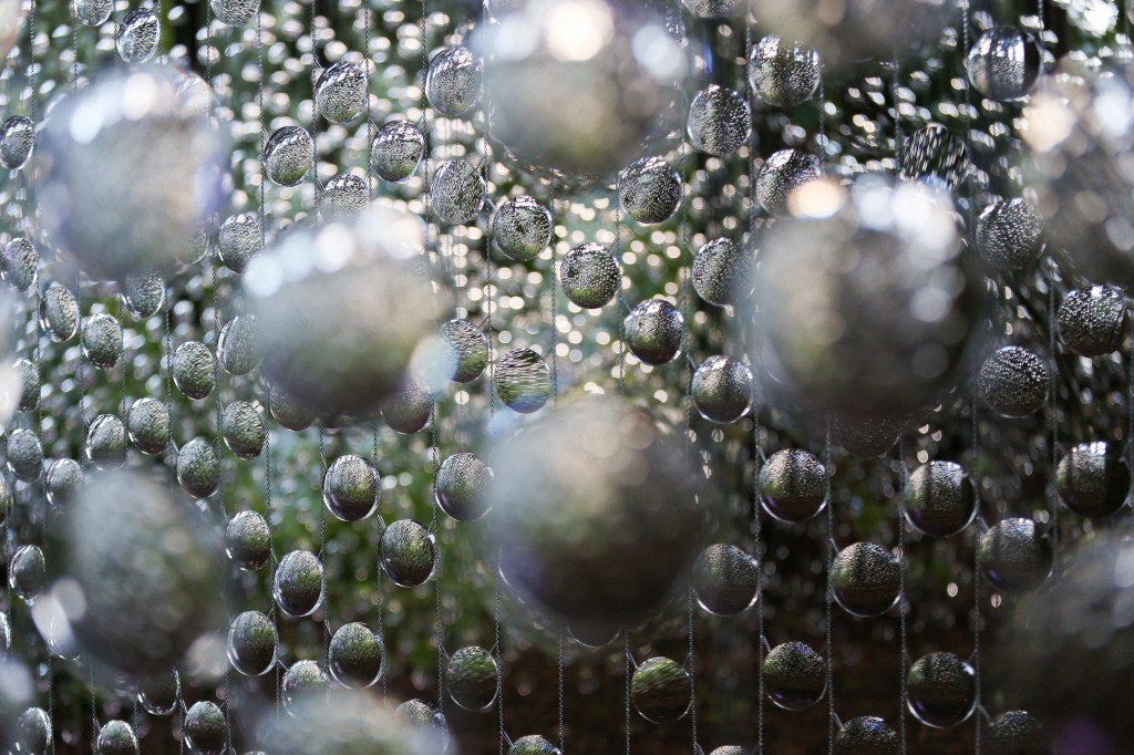Visitors enter through a break in the curtain, encountering the lenses close-up, where they appear like falling rain or dew drops suspended between fine chains.