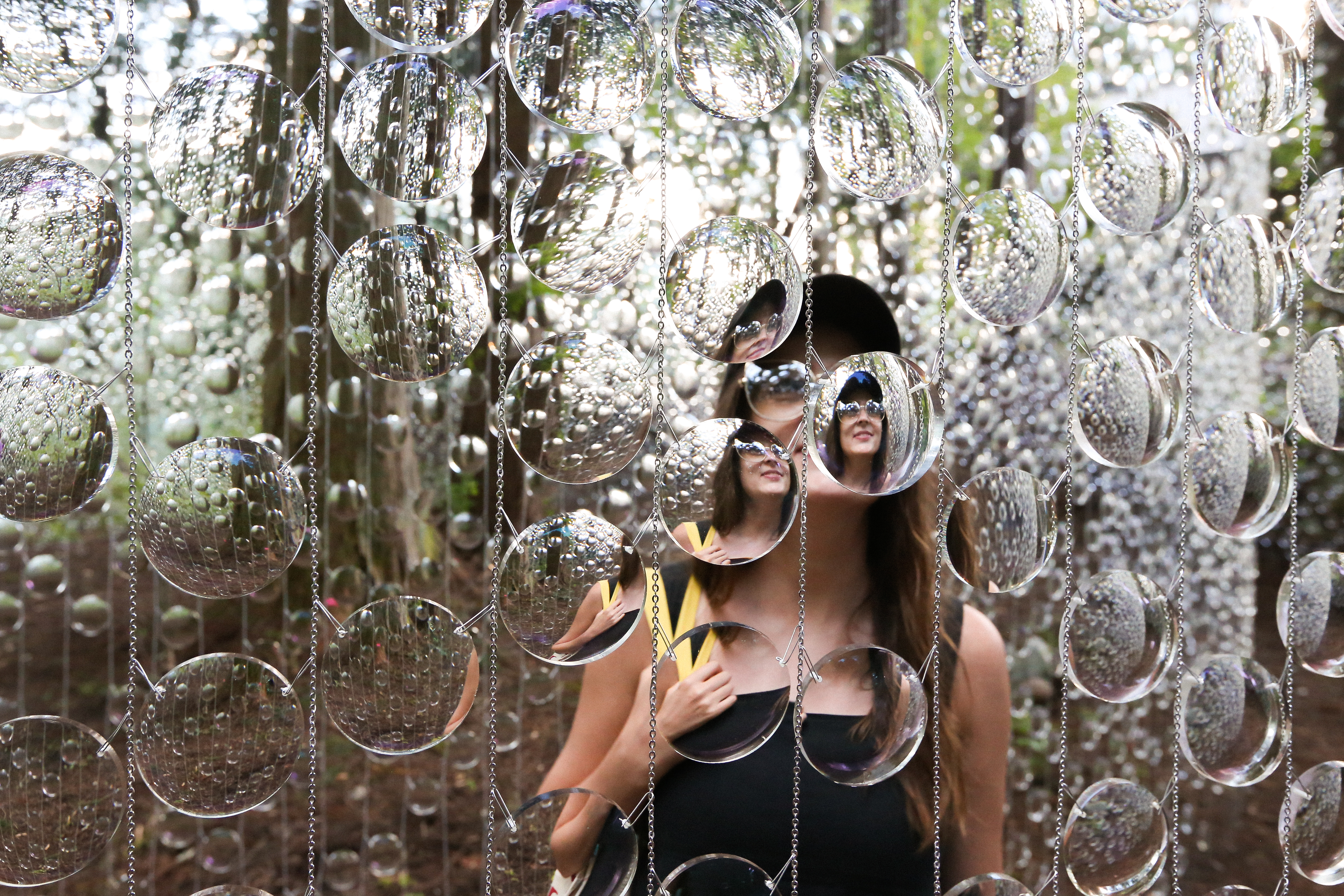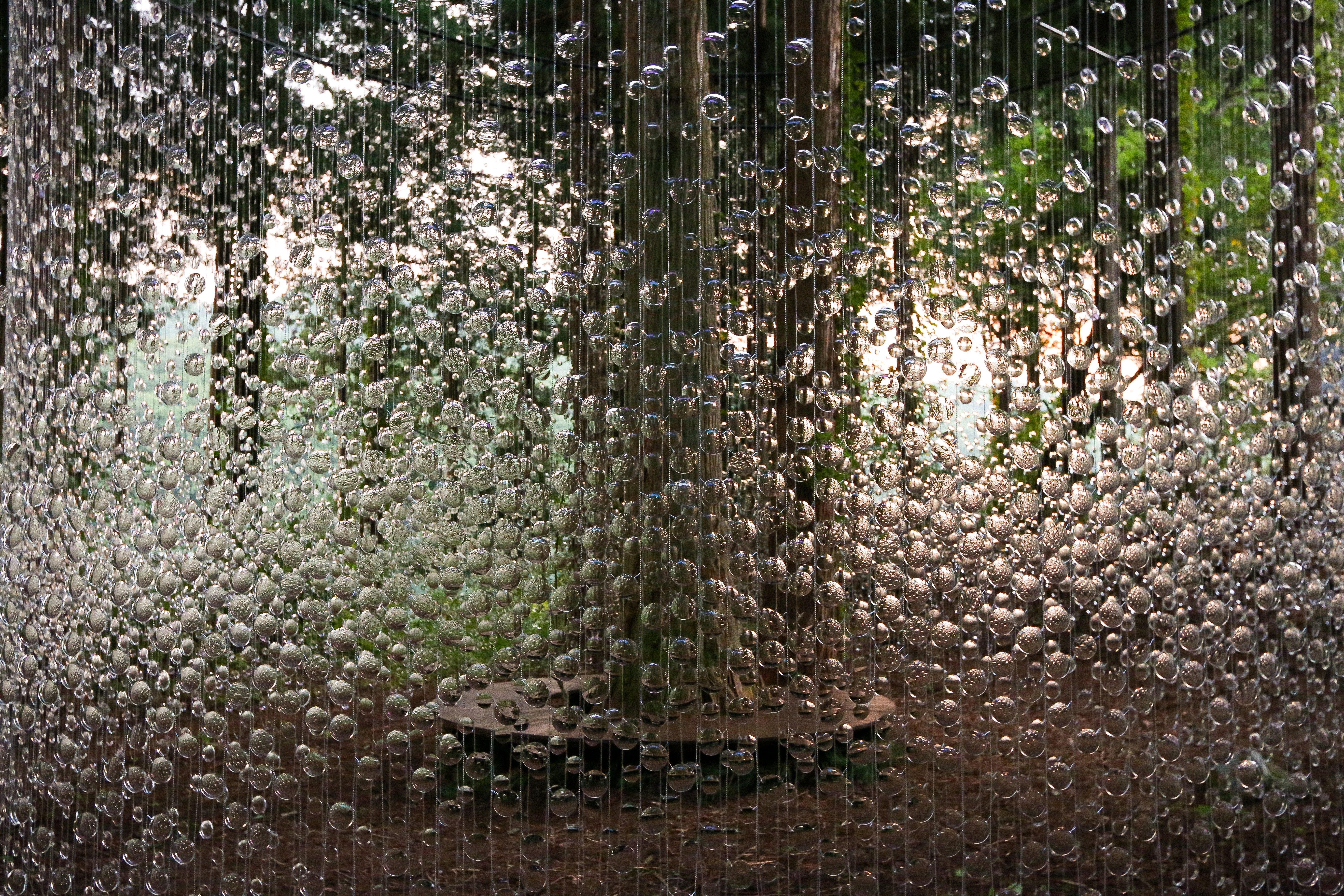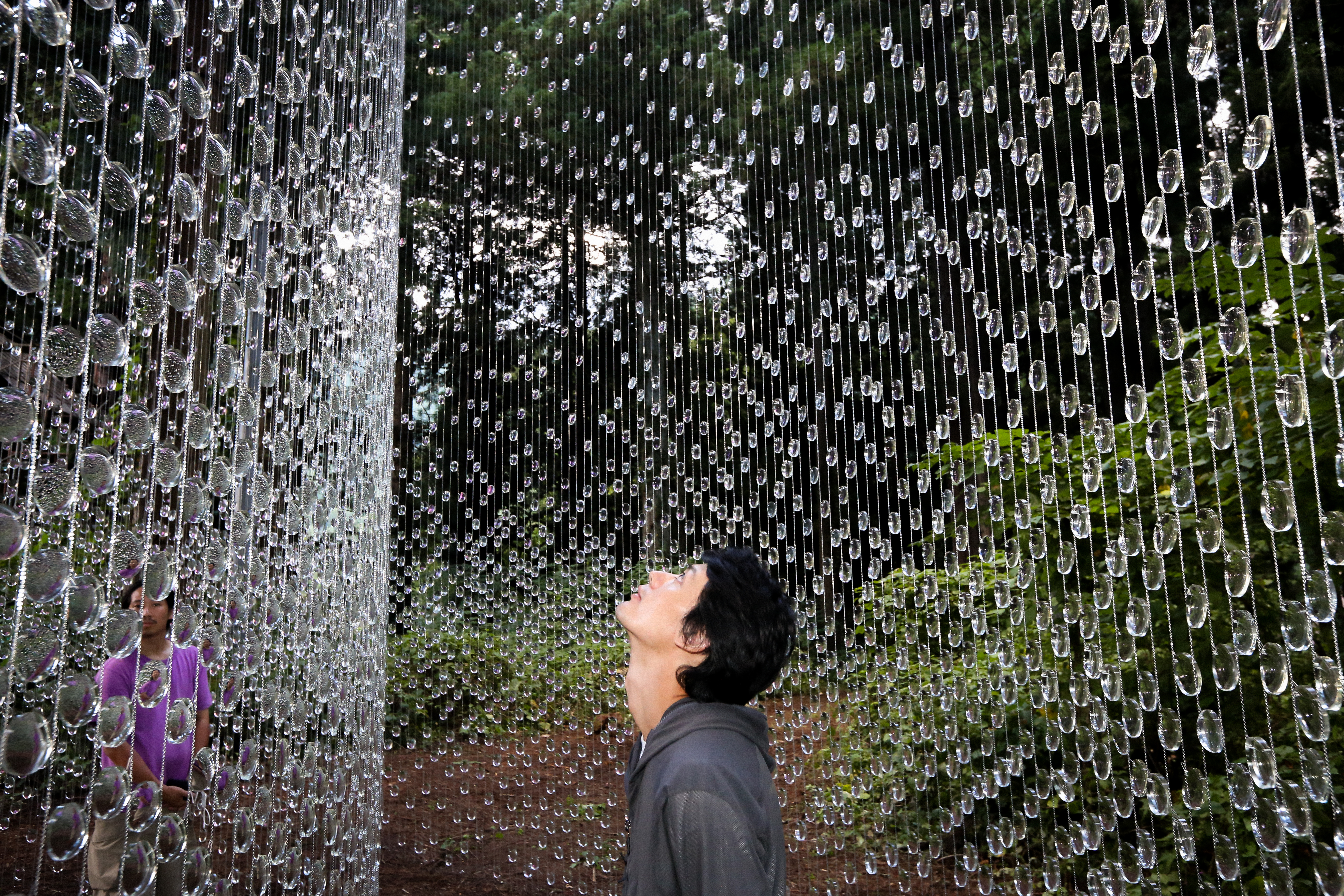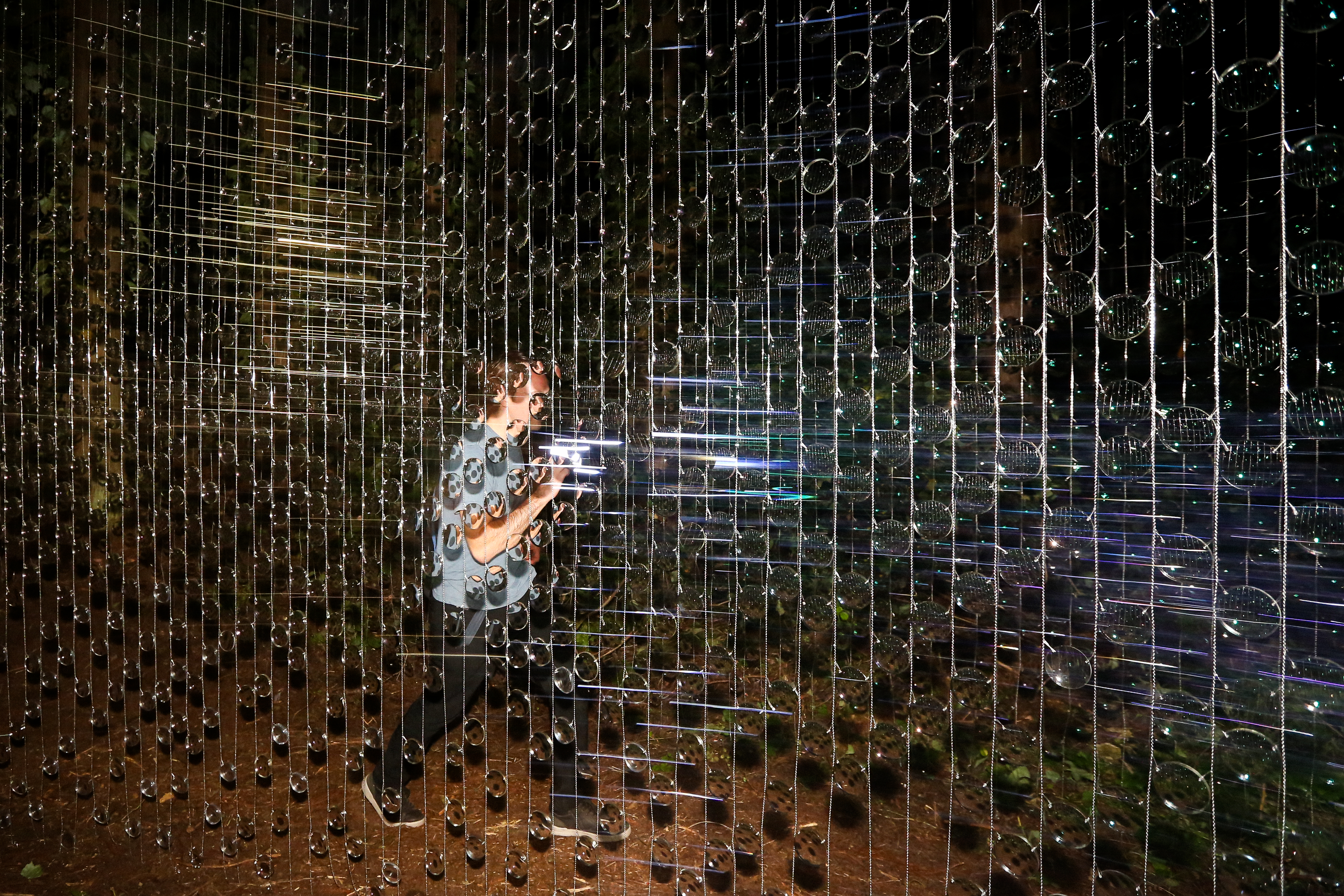Visitors enter through a break in the curtain, encountering the lenses close-up, where they appear like falling rain or dew drops suspended between fine chains.