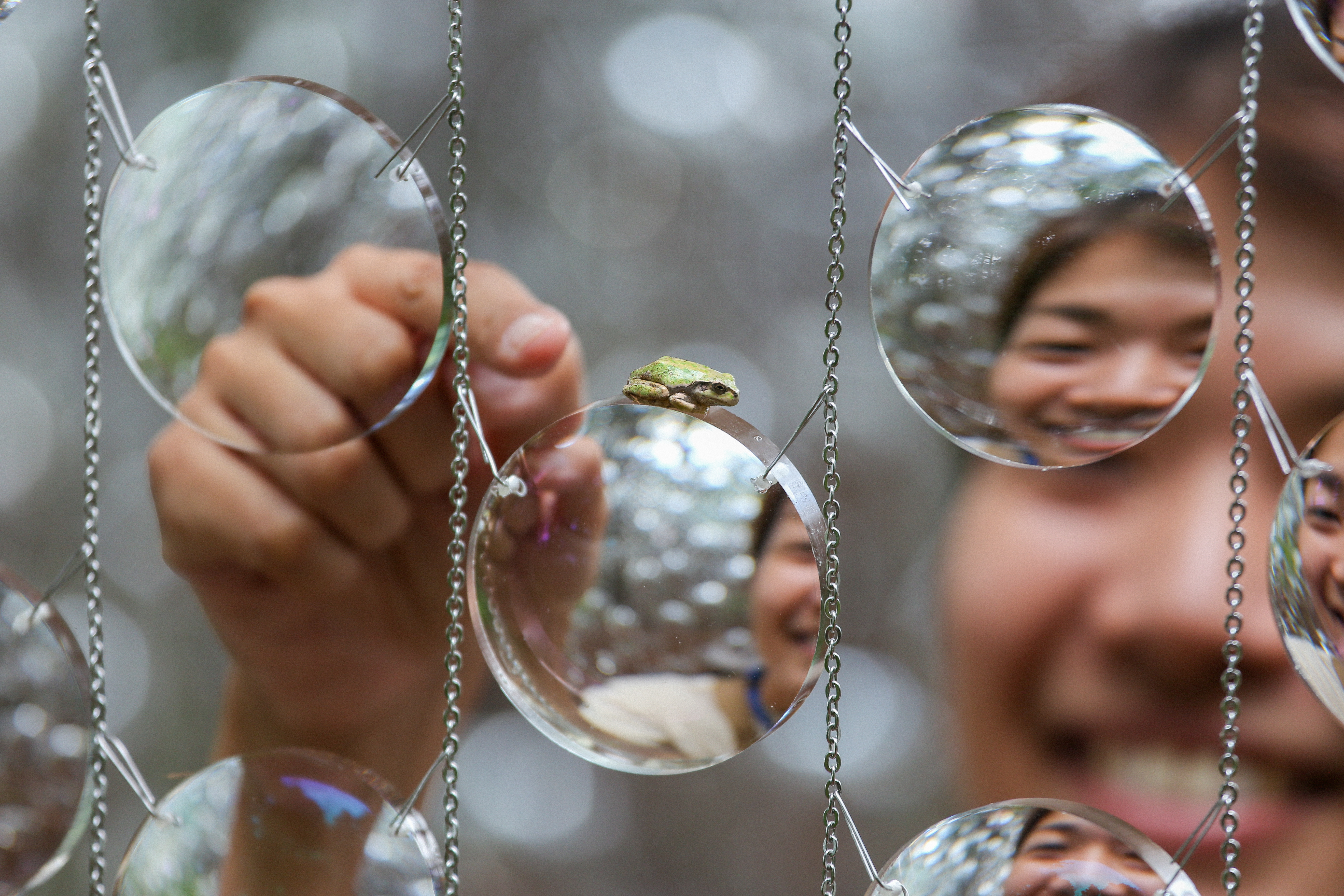 A Whisper in the Eye of the Storm is an immersive installation created from 14,000 prescription lenses for Northern Alps Art Festival. Towering above the viewer like a shimmering forcefield or suspended rain storm, the piece draws from the powerful relationship between the surrounding region and water – as a source of sustenance, electricity, leisure, and life. The installation was designed in response to Omachi, a shrinking town in the Japanese Alps known for hydroelectric dams, beautiful mountainside lakes, and a rapidly shrinking population.