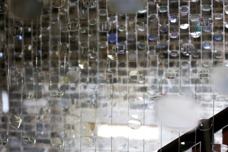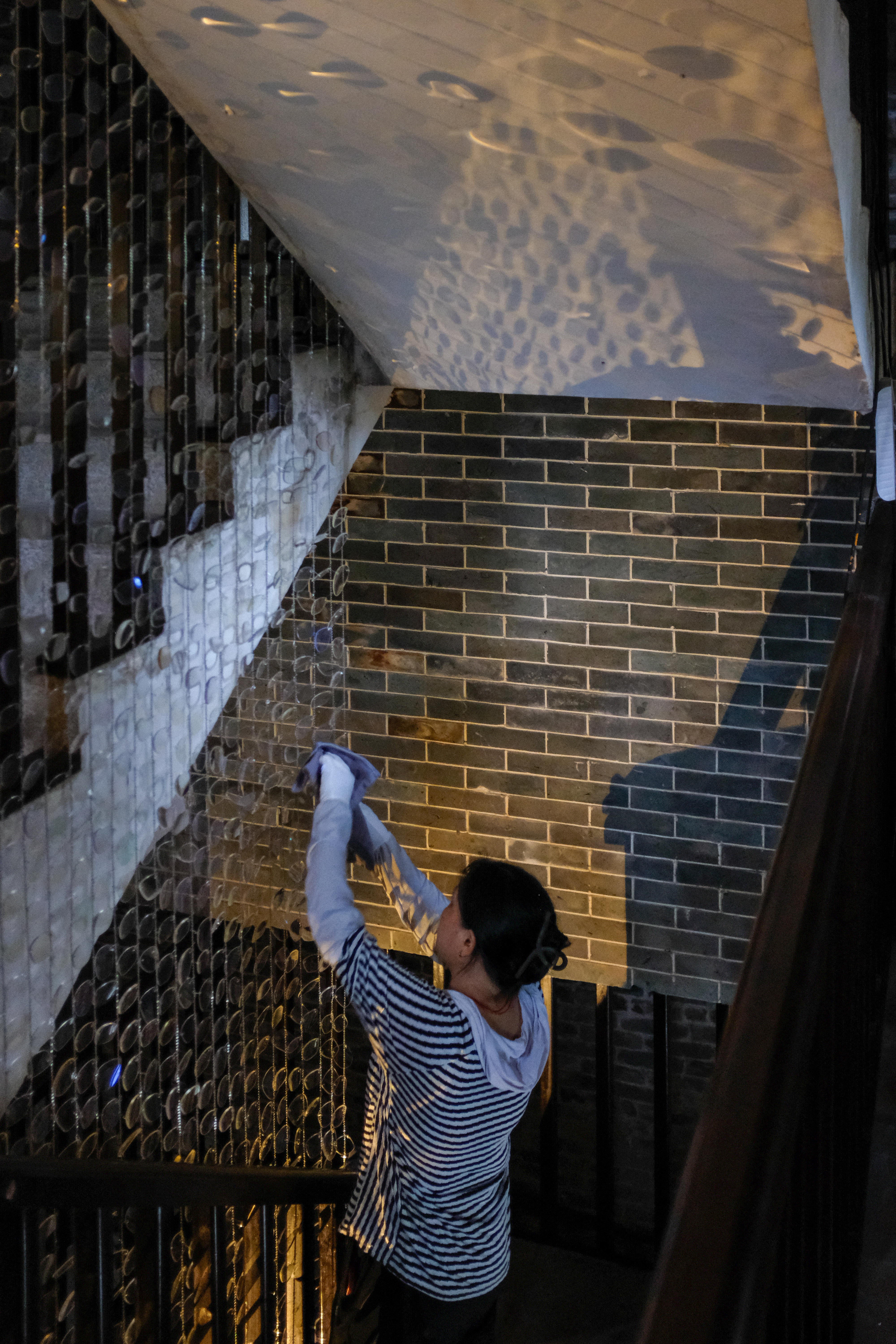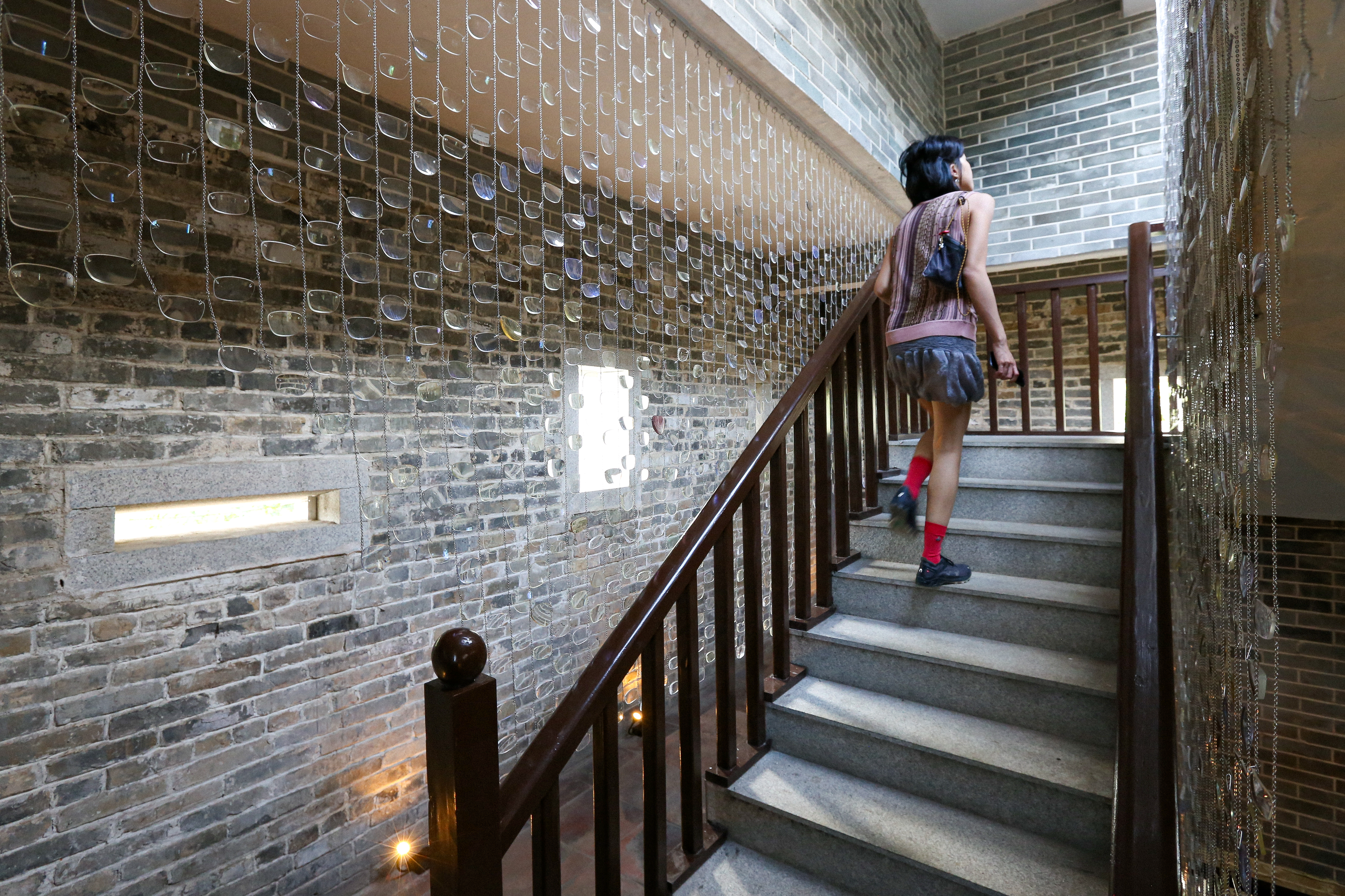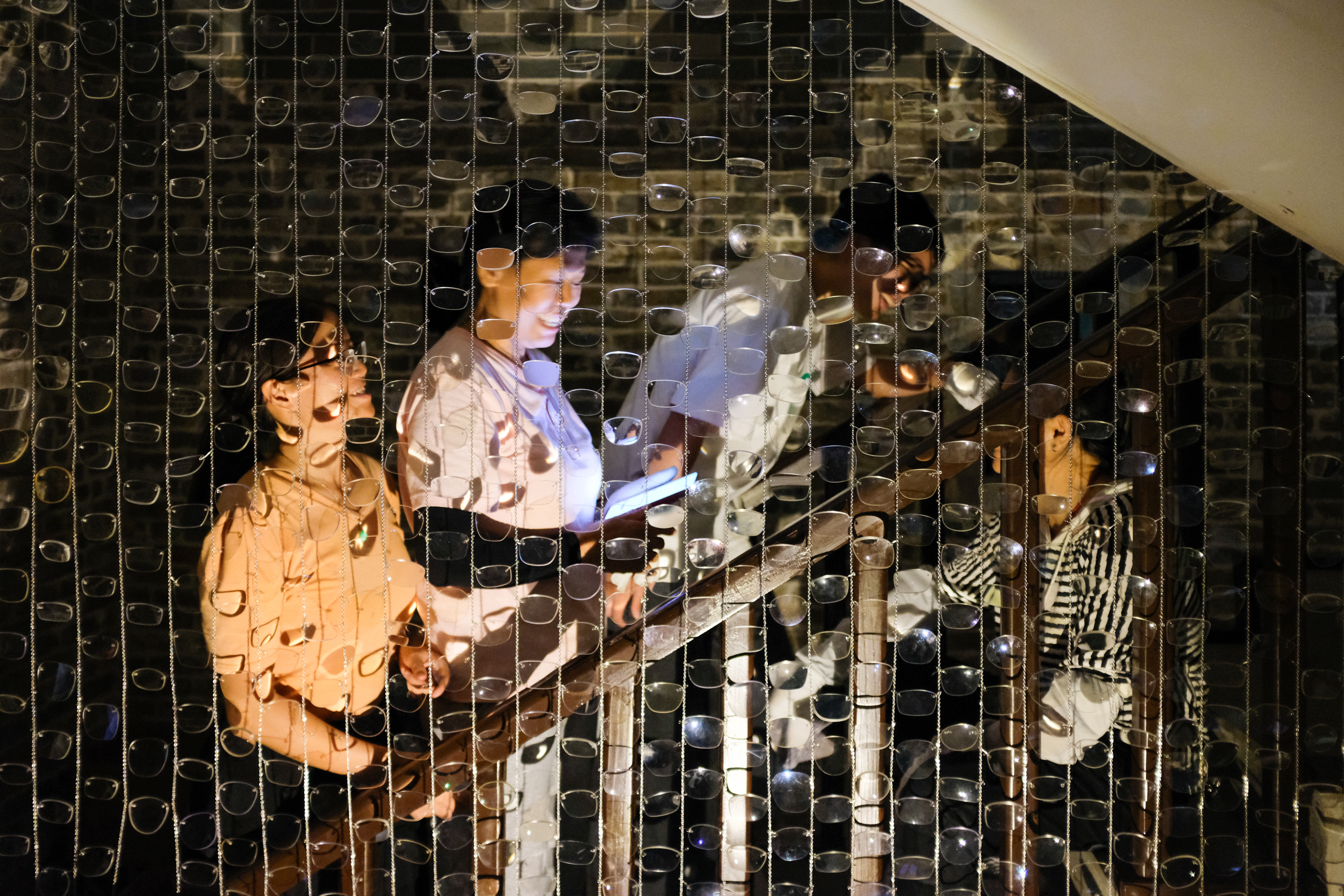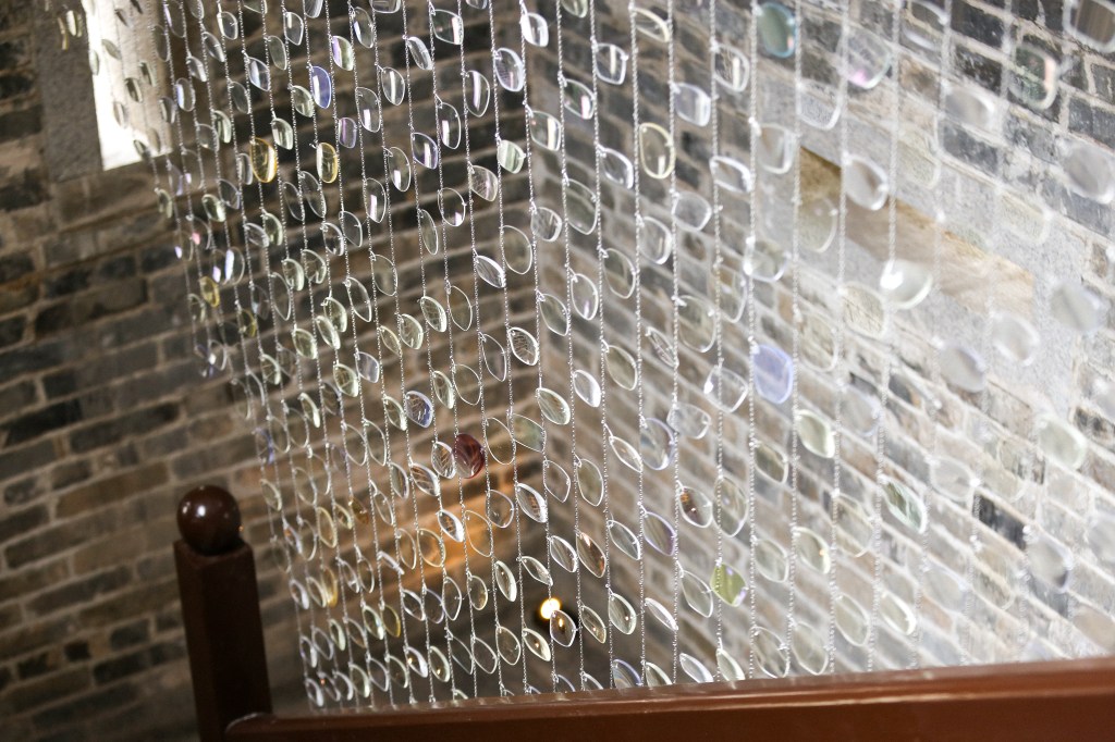 The curtains of the installation are constructed from thousands of repurposed eyeglass lenses and fine silver chain, creating layers of falling “water” that speak to many perspectives on water in Guangdong Province.
