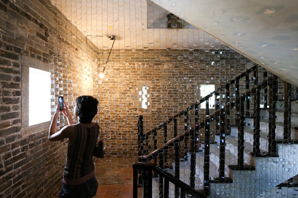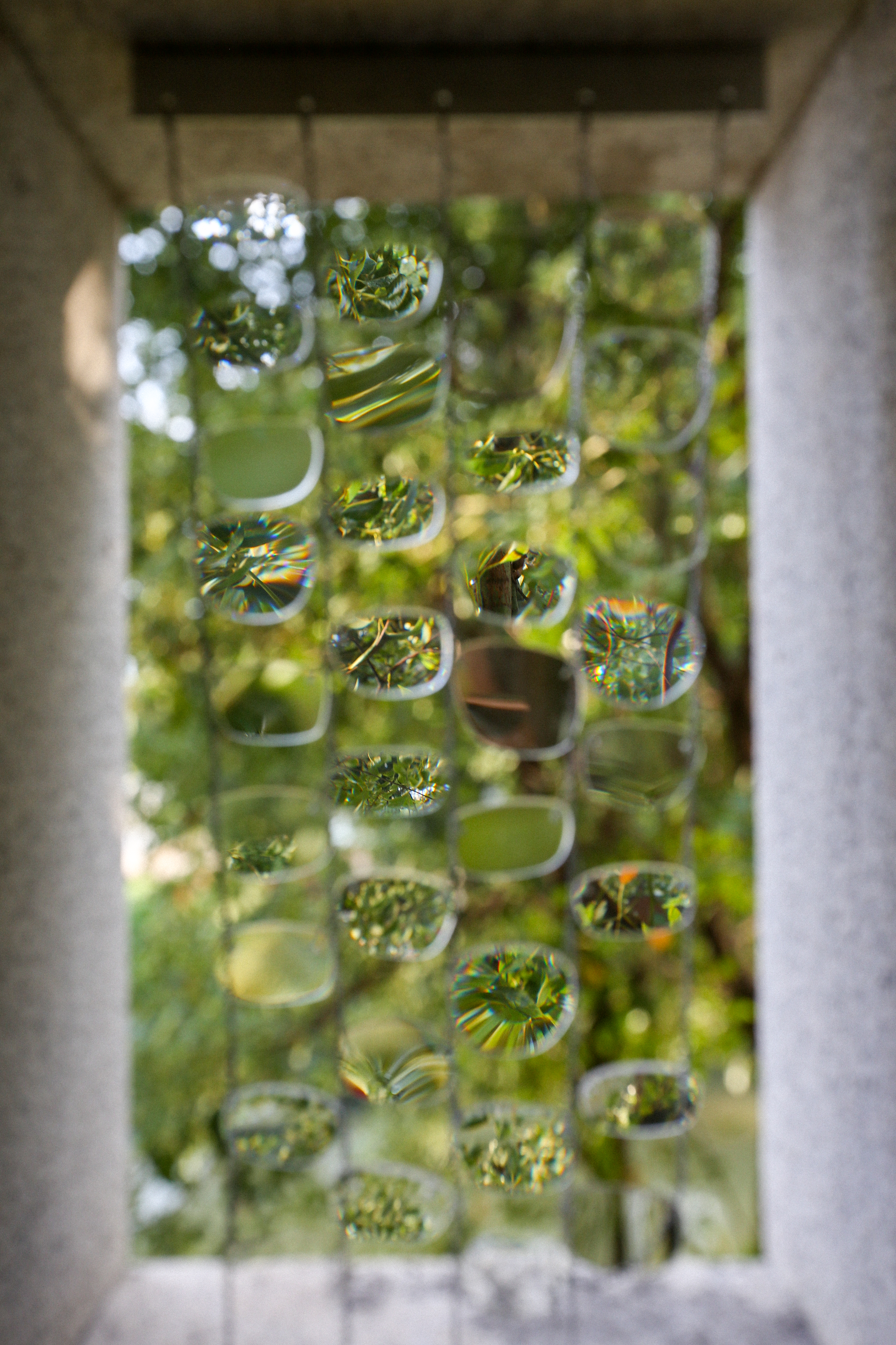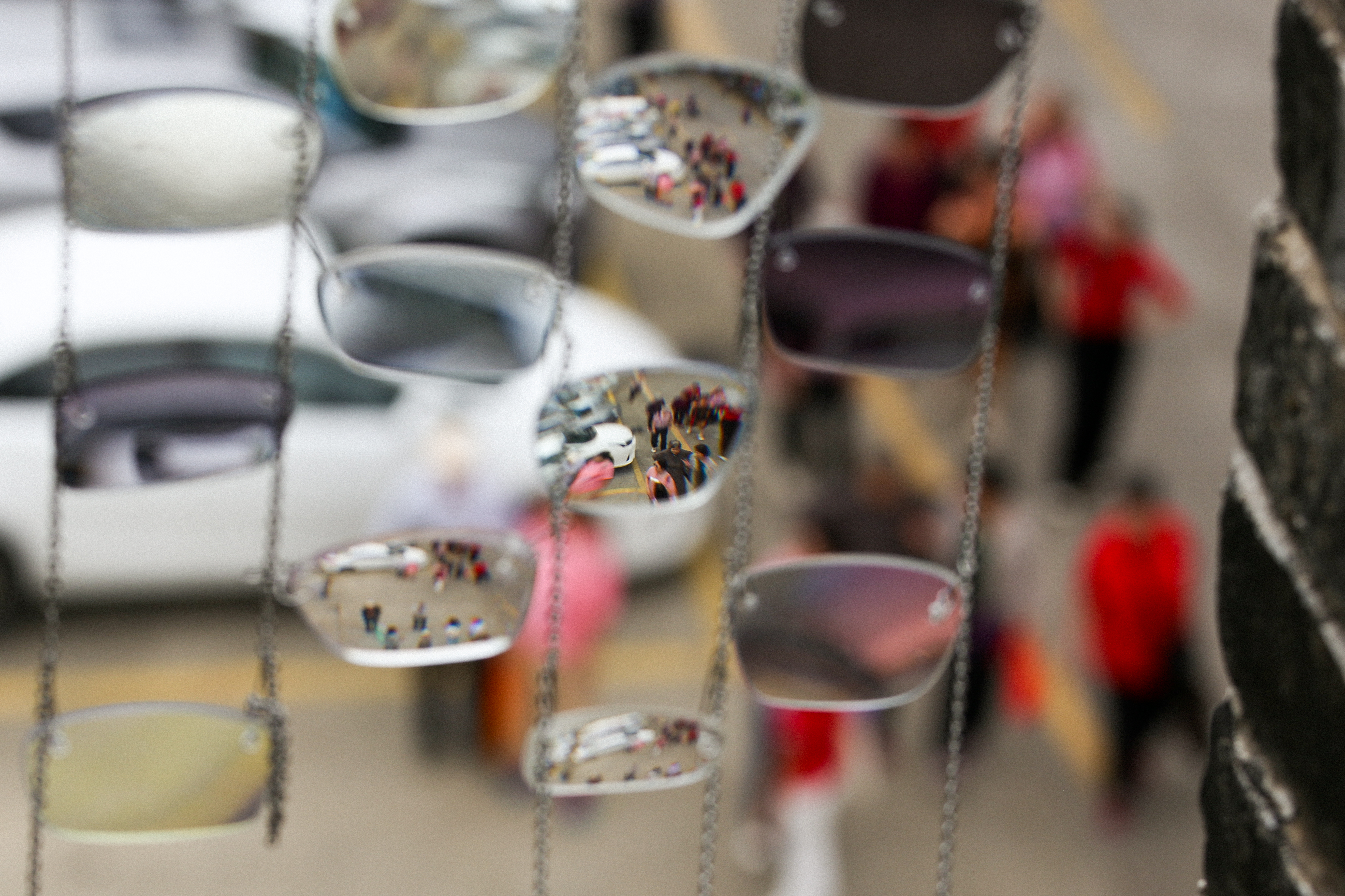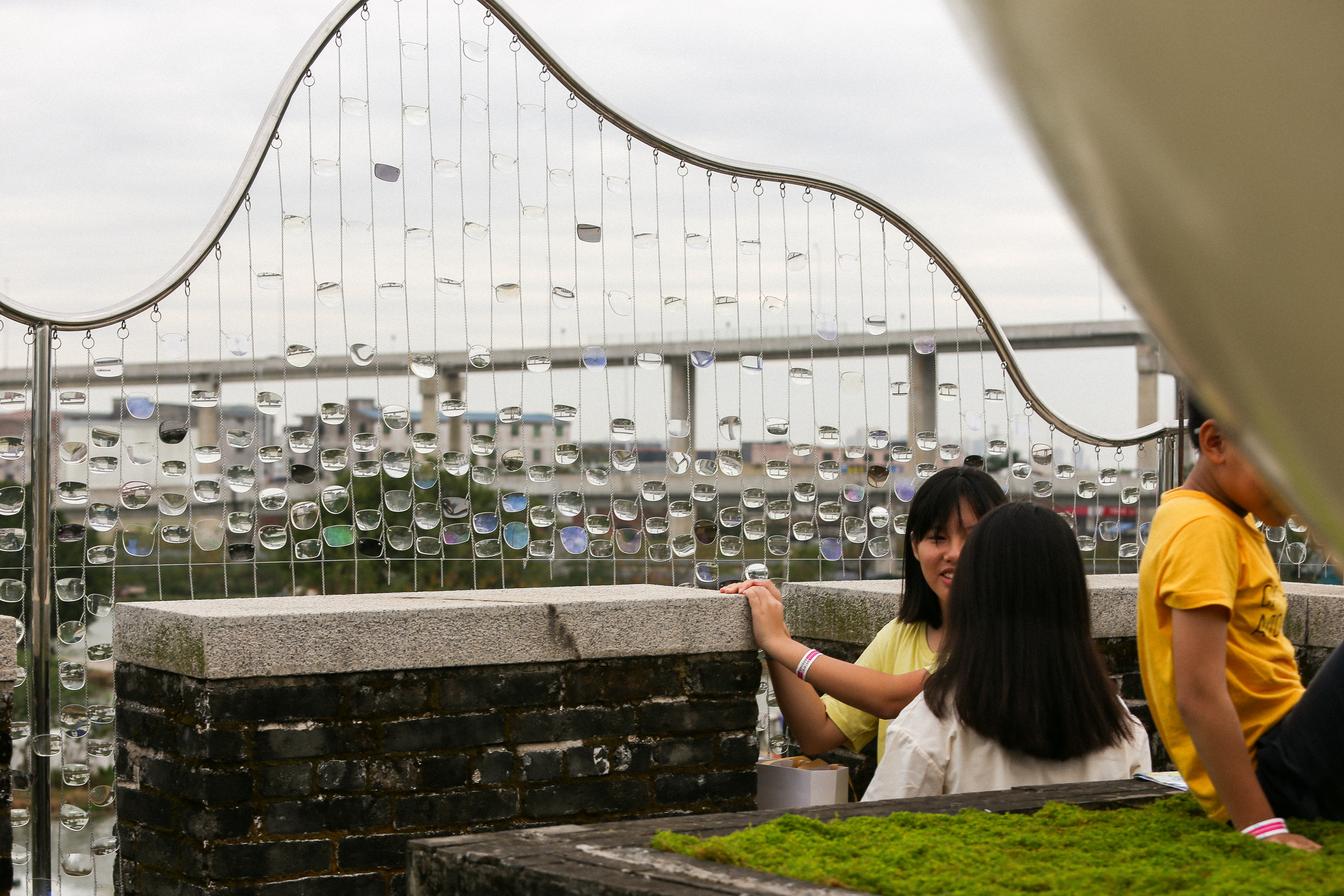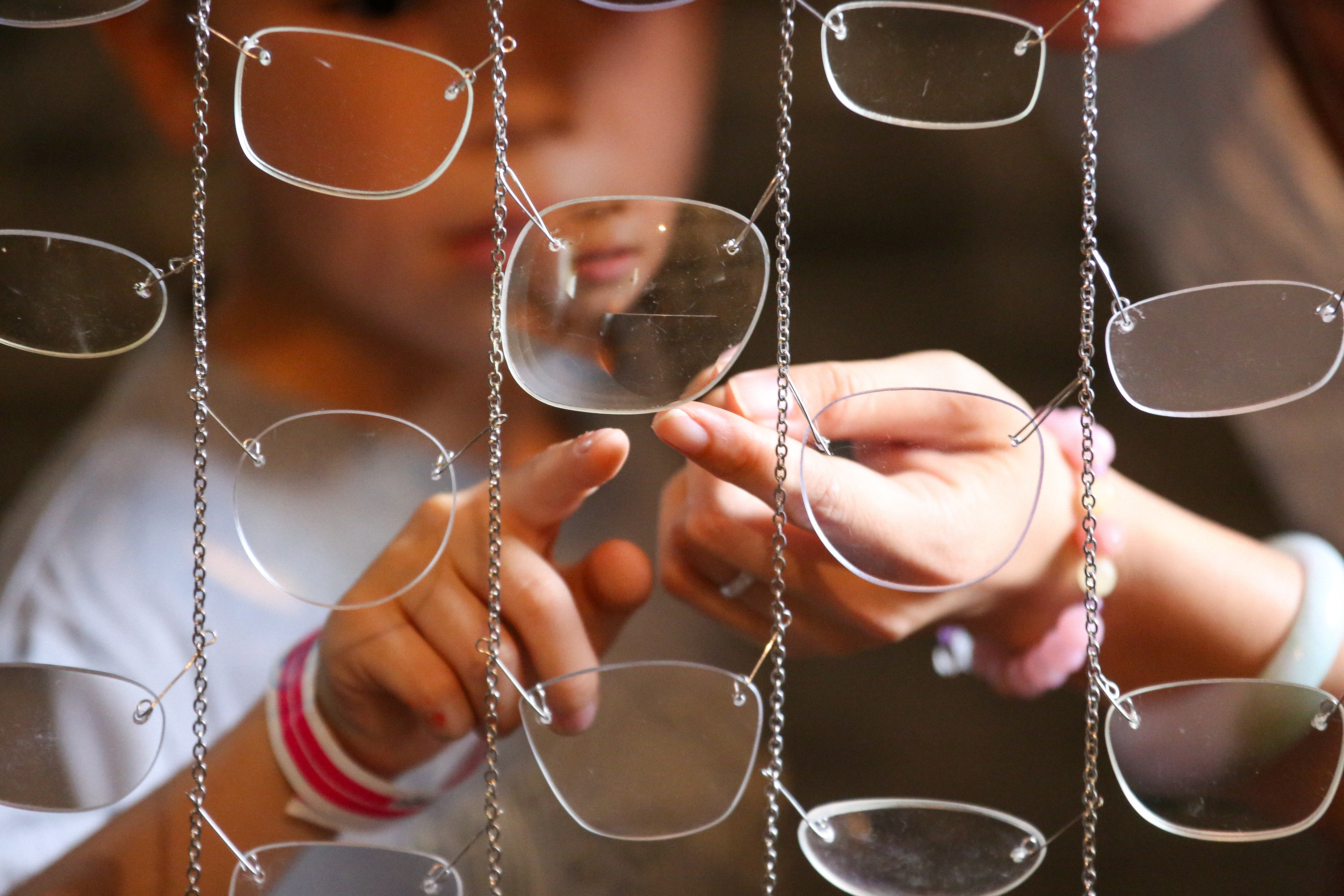 The curtains of the installation are constructed from thousands of repurposed eyeglass lenses and fine silver chain, creating layers of falling “water” that speak to many perspectives on water in Guangdong Province.