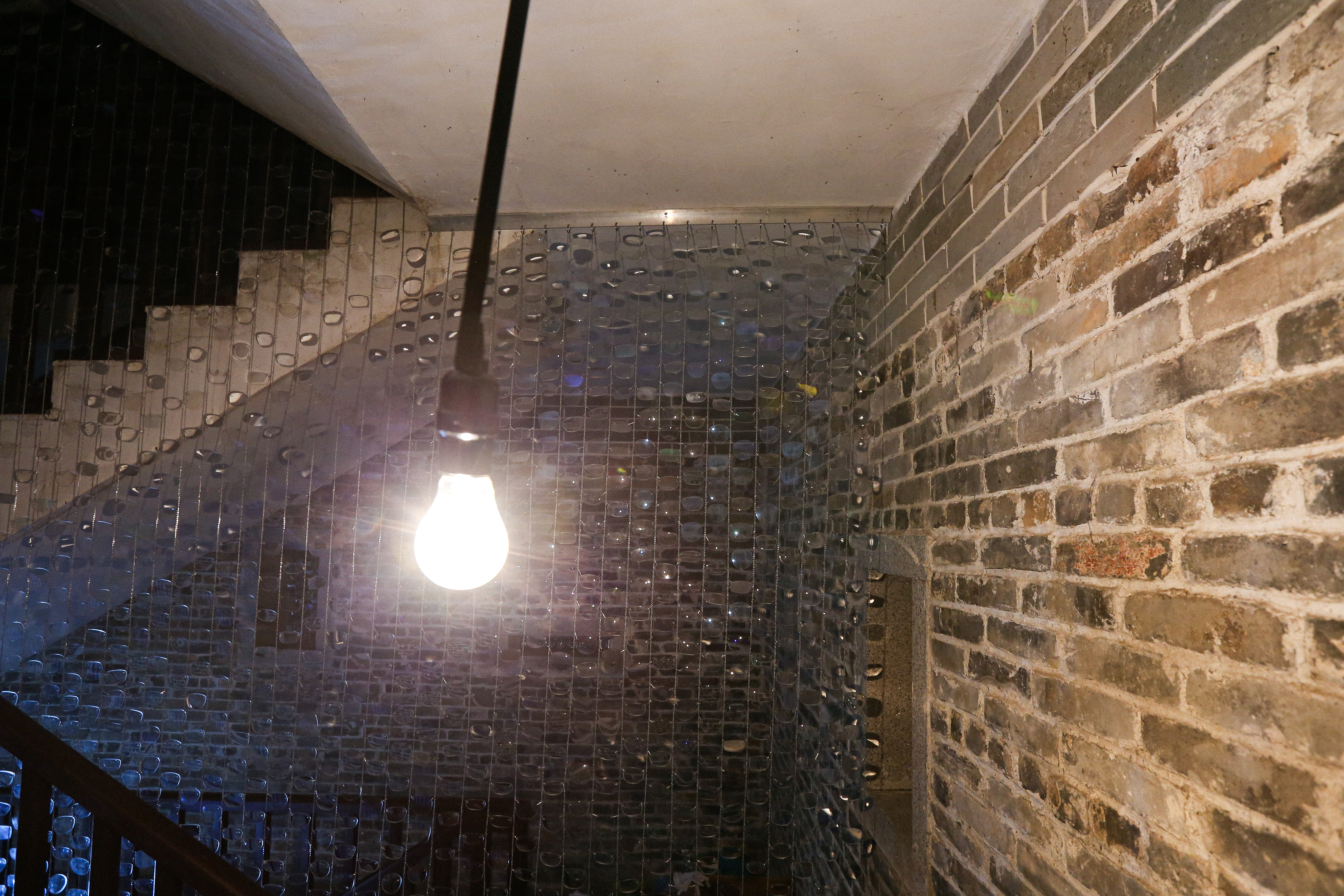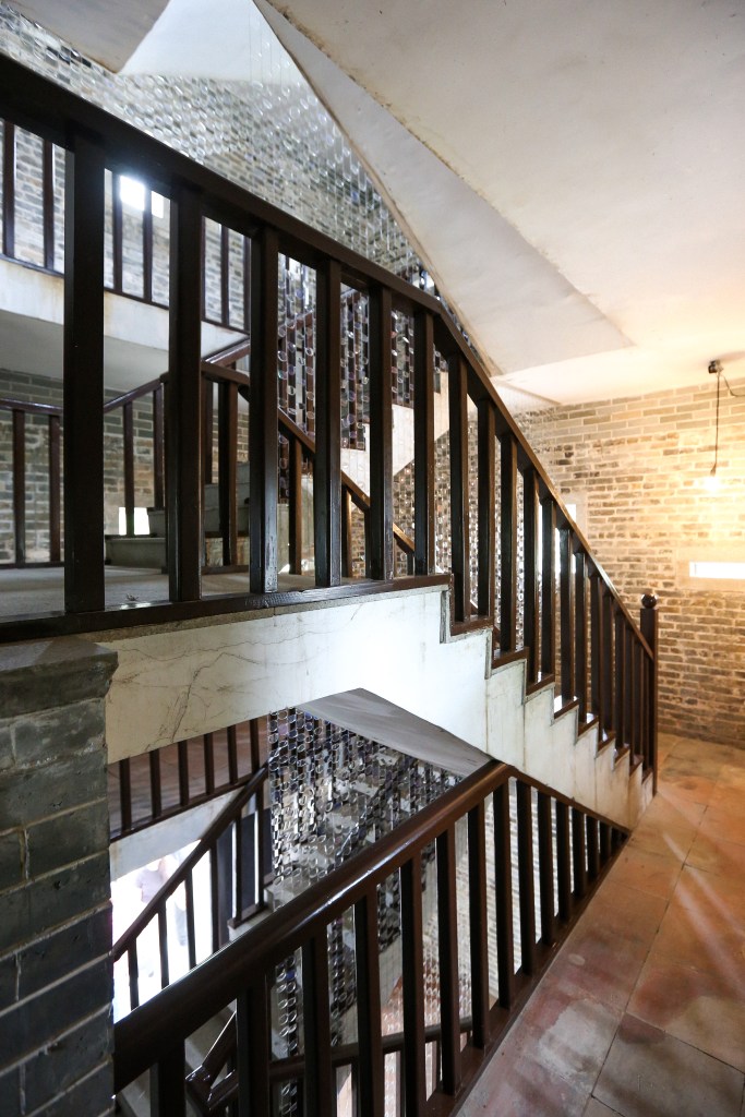 On the second floor, the curtain bisects the tower, forcing visitors to walk the long way around to ascend the second set of stairs. A bare light bulb swings slowly, casting shadows that rock like light inside the belly of a ship on seas. The effect is intended to be destabilizing.