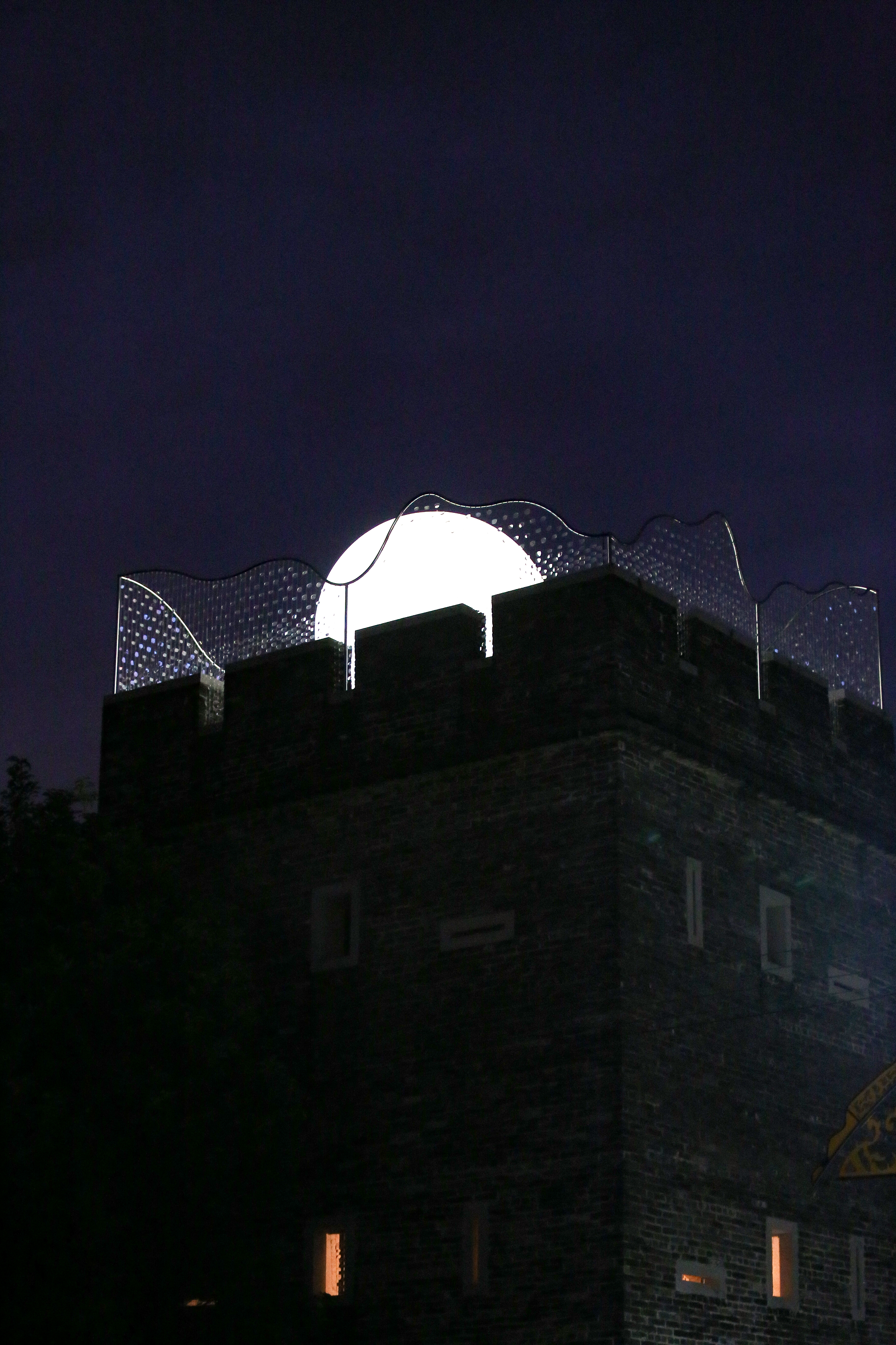 Tears of the Moon is a towering installation inviting visitors to climb the historic Yan Nan Gun Tower in the Guangdong Province of China. As they climb, they pass through a multi-story installation of glittering curtains rising towards the top of the tower where a luminous surprise awaits: the Moon Pearl.
