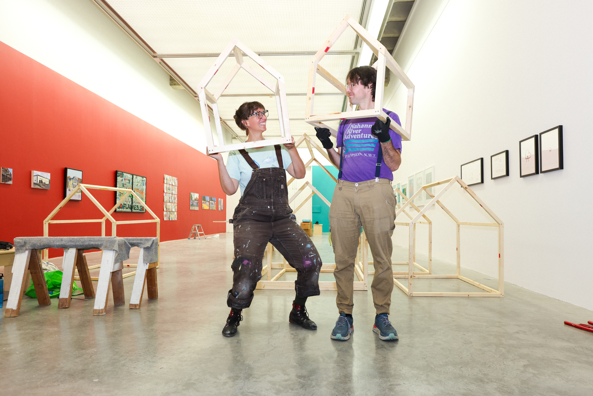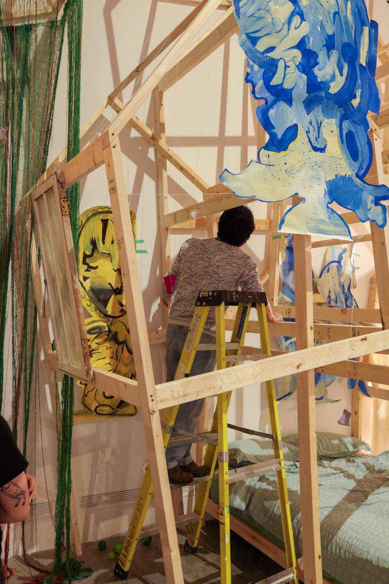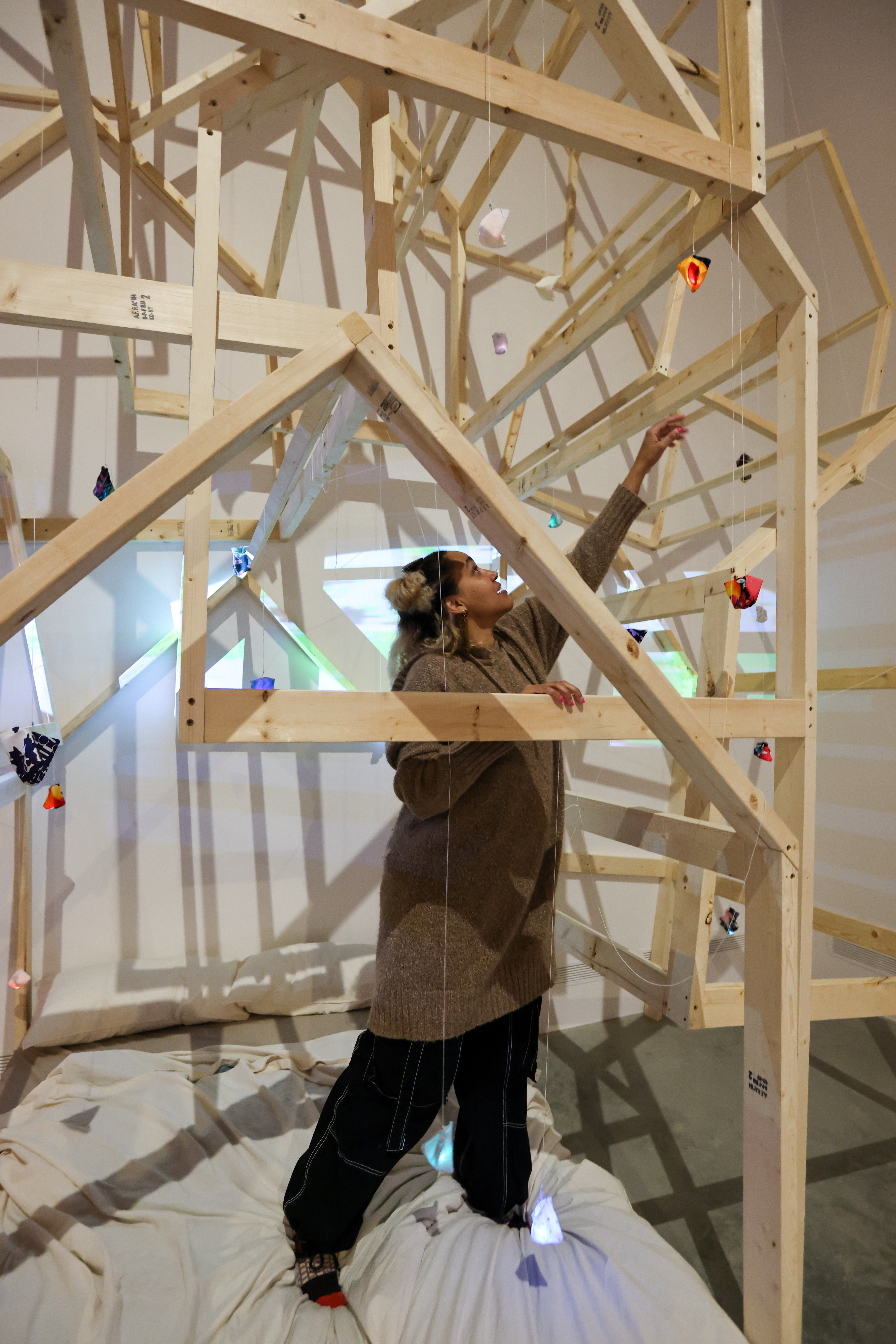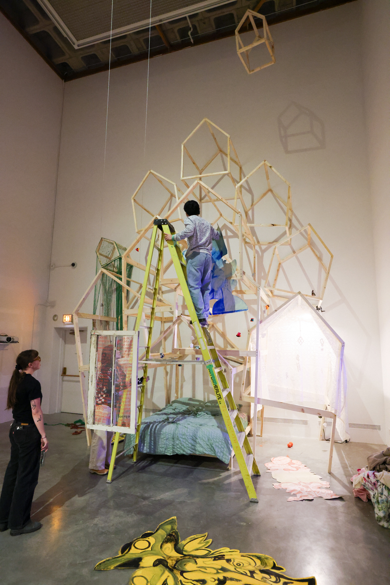 Deep Dream Superstructure is a collaborative sculpture providing the architecture for collective dreaming – literally and metaphorically. Designed in response to Faces & Places, this perilous tower of A-frame houses pays tribute to the DIY ethos of domestic art-spaces in Calgary/Mohkinstsis. The foundation of the sculpture is a double bed, offering a place to sit, lay, read, draw, daydream, or cat-nap. This is the locus for deep dreaming, allowing the artwork to shift and transform continually over the course of the exhibition.