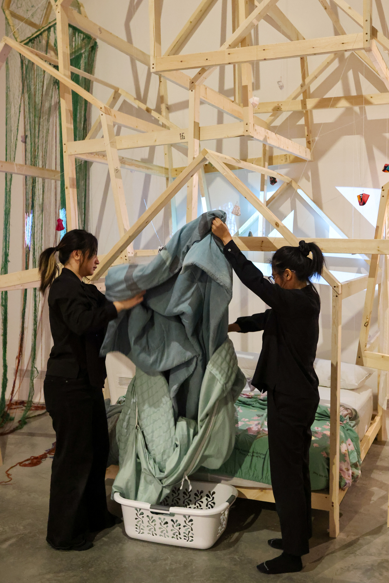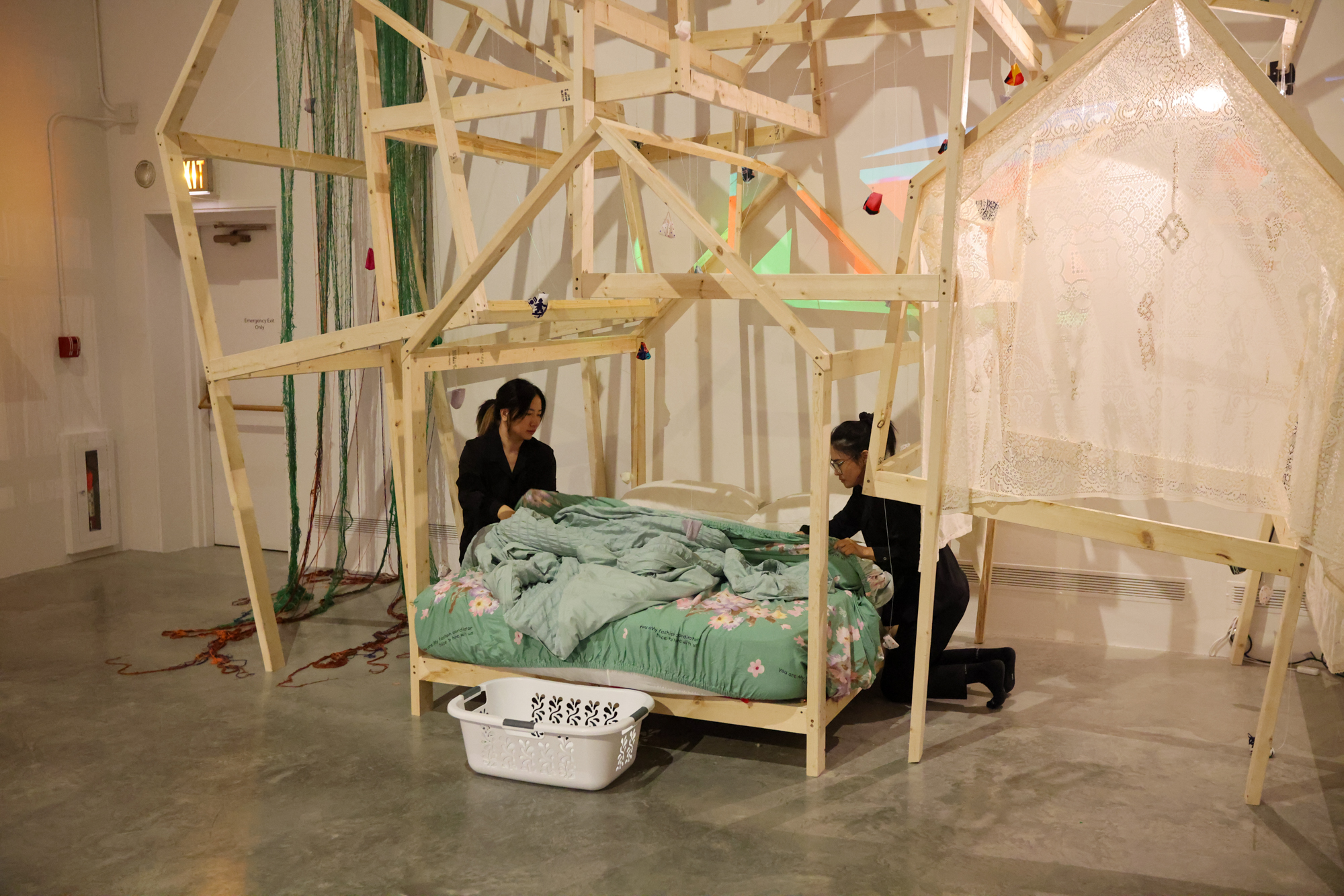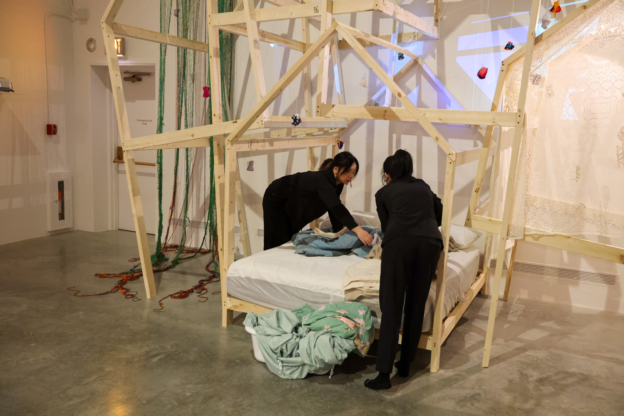 “We started with a simple act: changing the bedding in the gallery. This bed invites visitors to lie down, rest, or reflect, and over time we noticed it could become worn or dirty. Replacing the sheets became a way for us to think about care — care for the space, care for others, and care in everyday life. Through the repeated, almost ritualistic act of changing the bedding, we explored the labour involved in maintaining both private and shared spaces, the comfort and hygiene it provides, and the quiet responsibility we carry toward those who interact with it. At the same time, we reflected on how these small, everyday gestures carry meaning, shaping how people experience and connect with spaces and one another.”