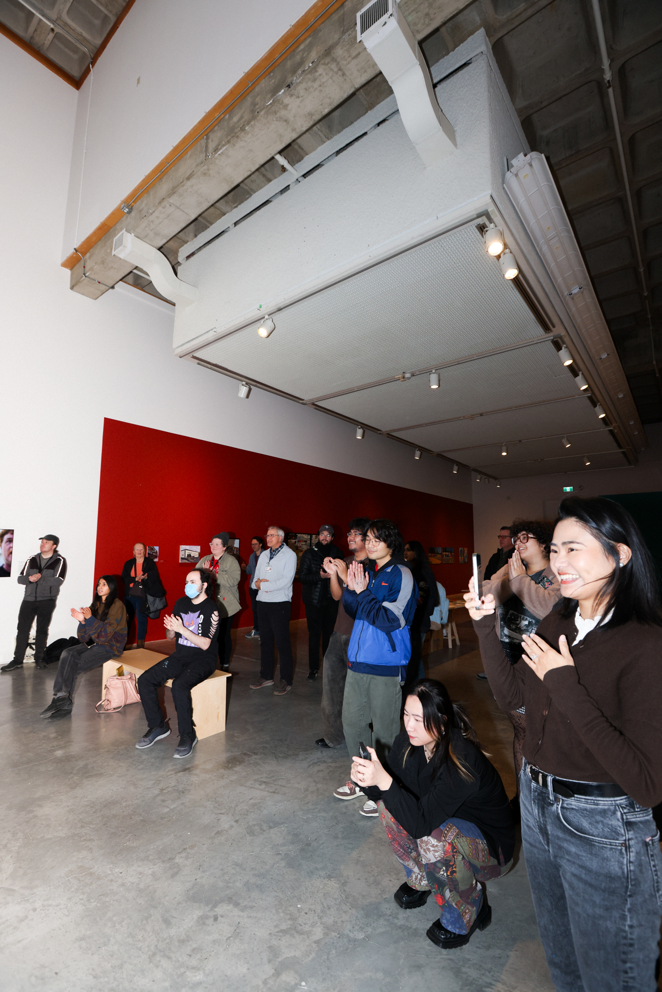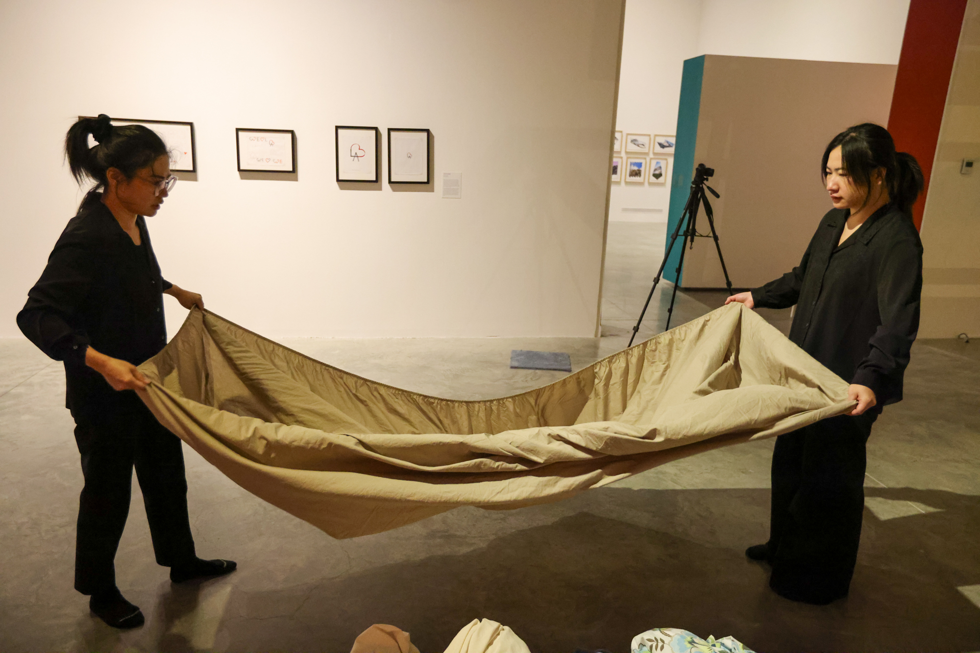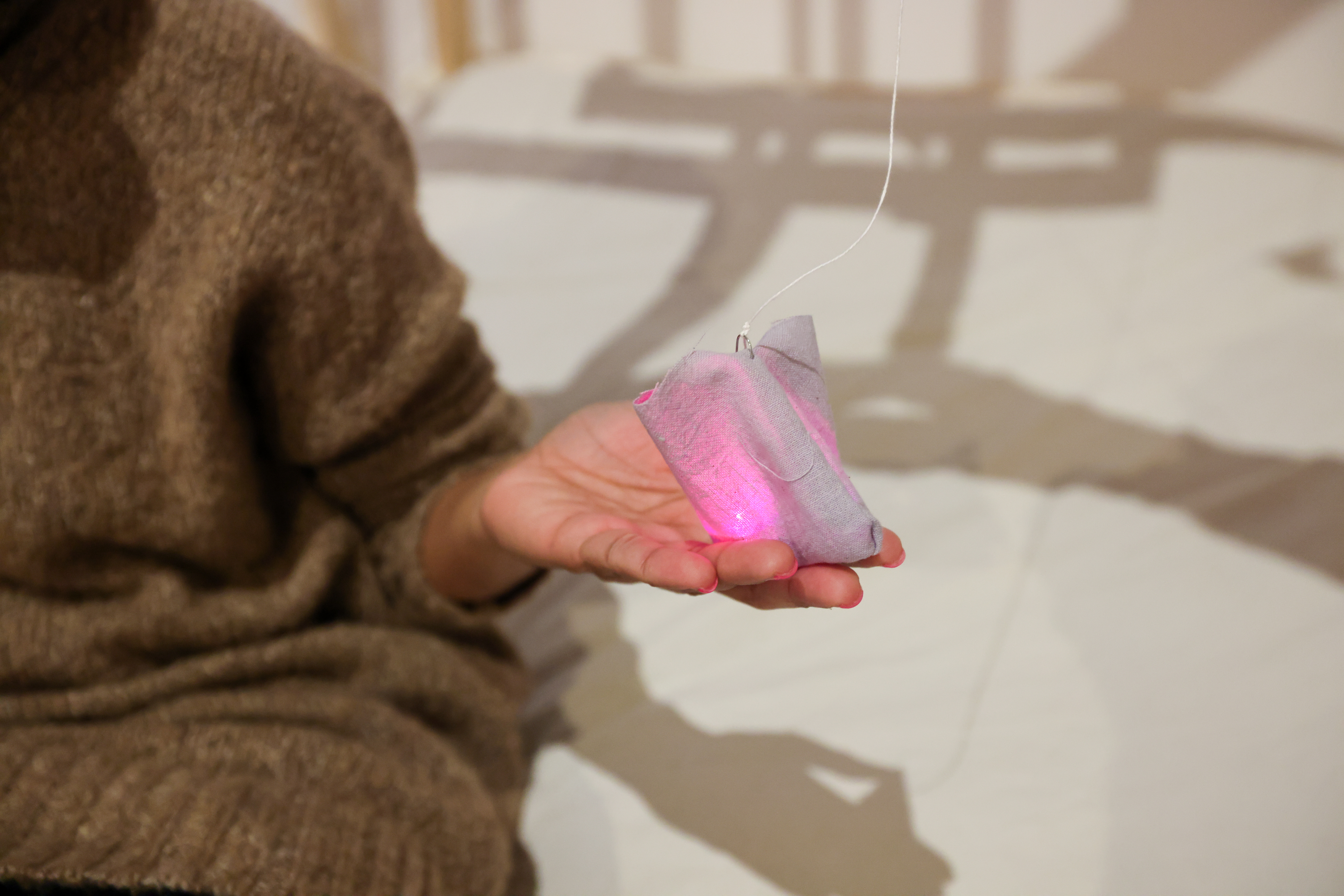“We started with a simple act: changing the bedding in the gallery. This bed invites visitors to lie down, rest, or reflect, and over time we noticed it could become worn or dirty. Replacing the sheets became a way for us to think about care — care for the space, care for others, and care in everyday life. Through the repeated, almost ritualistic act of changing the bedding, we explored the labour involved in maintaining both private and shared spaces, the comfort and hygiene it provides, and the quiet responsibility we carry toward those who interact with it. At the same time, we reflected on how these small, everyday gestures carry meaning, shaping how people experience and connect with spaces and one another.”