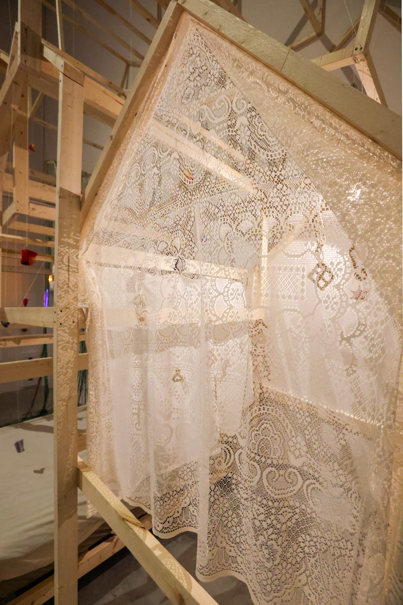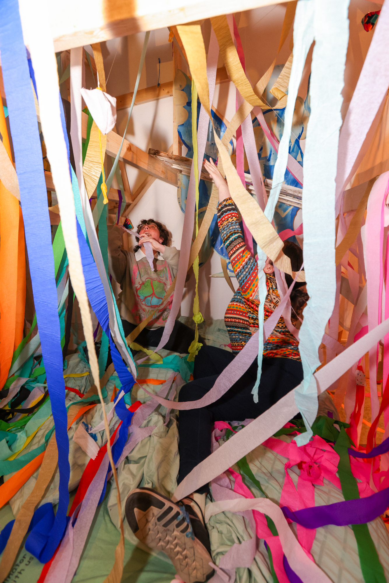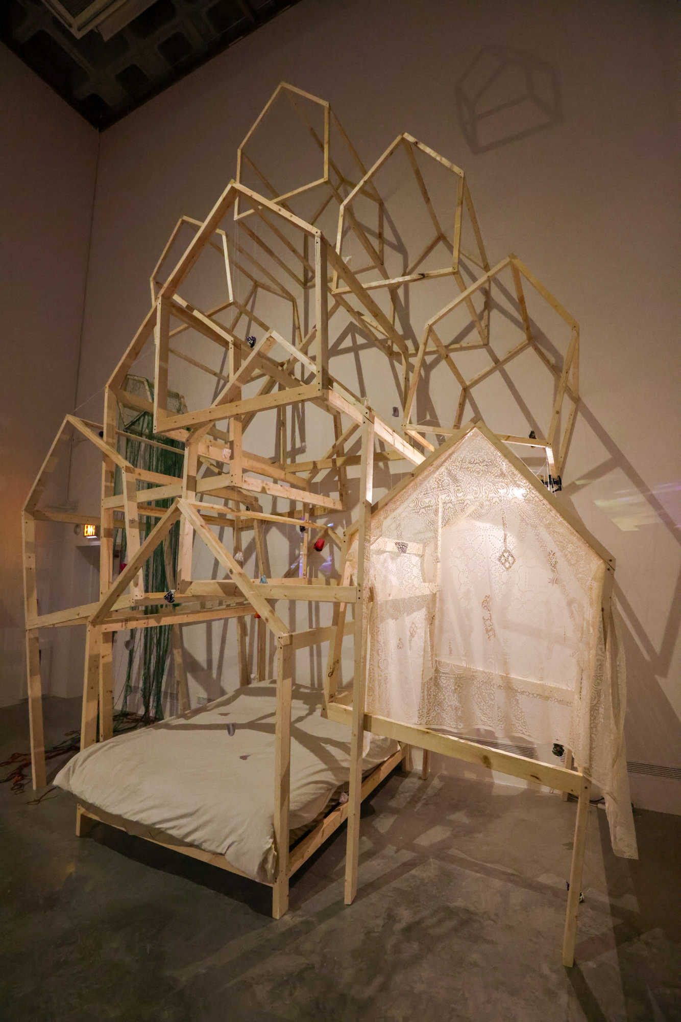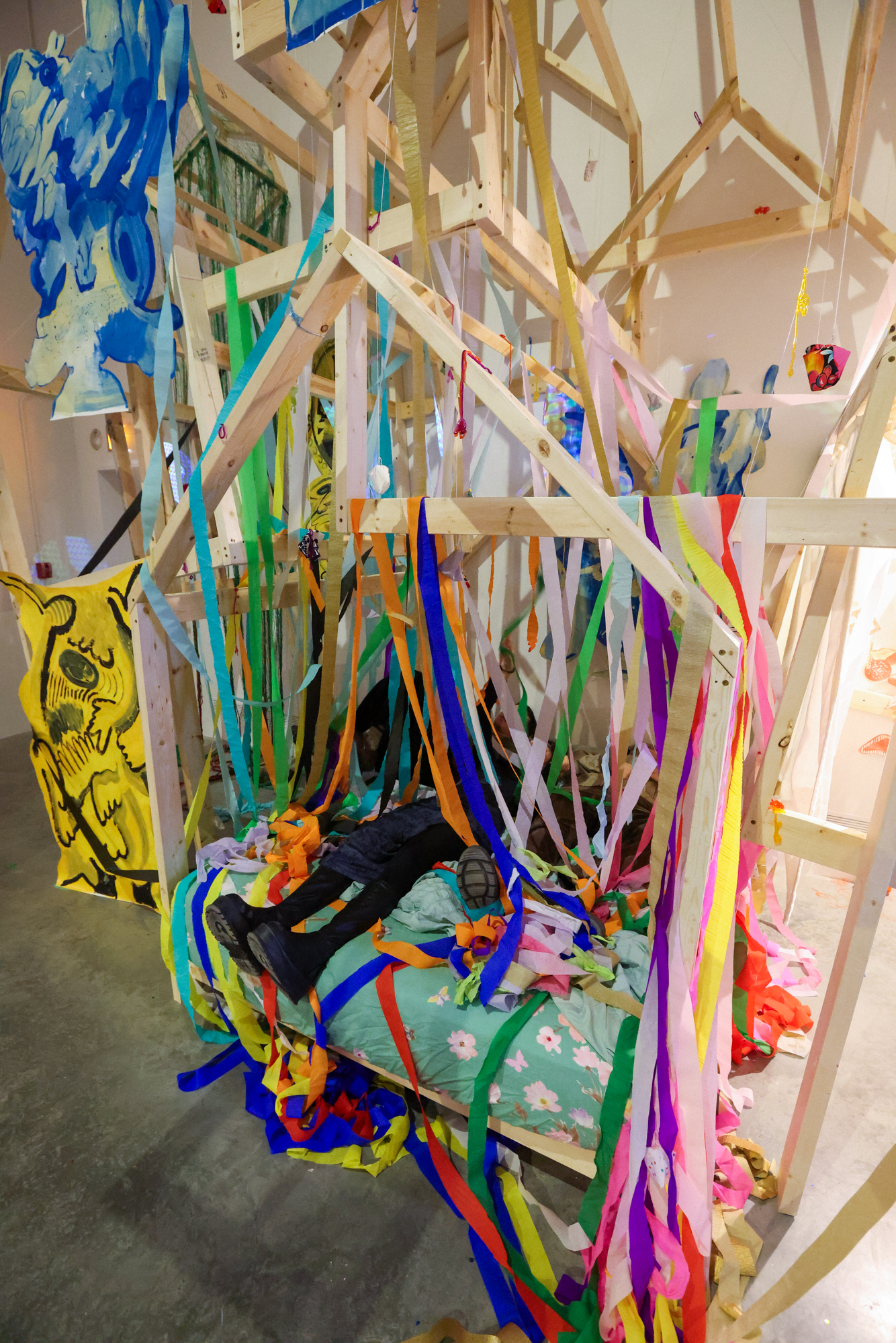 “We wanted to gamify the sculpture and do something that is not usually done in a gallery space. We armed the audience with sticky hands and streamers to throw onto the structure from within the bed. All participants were entered into a raffle to win a mystery gift. We turned the dream structure into an interactive space where the audience creates the art rather than just observes it.”