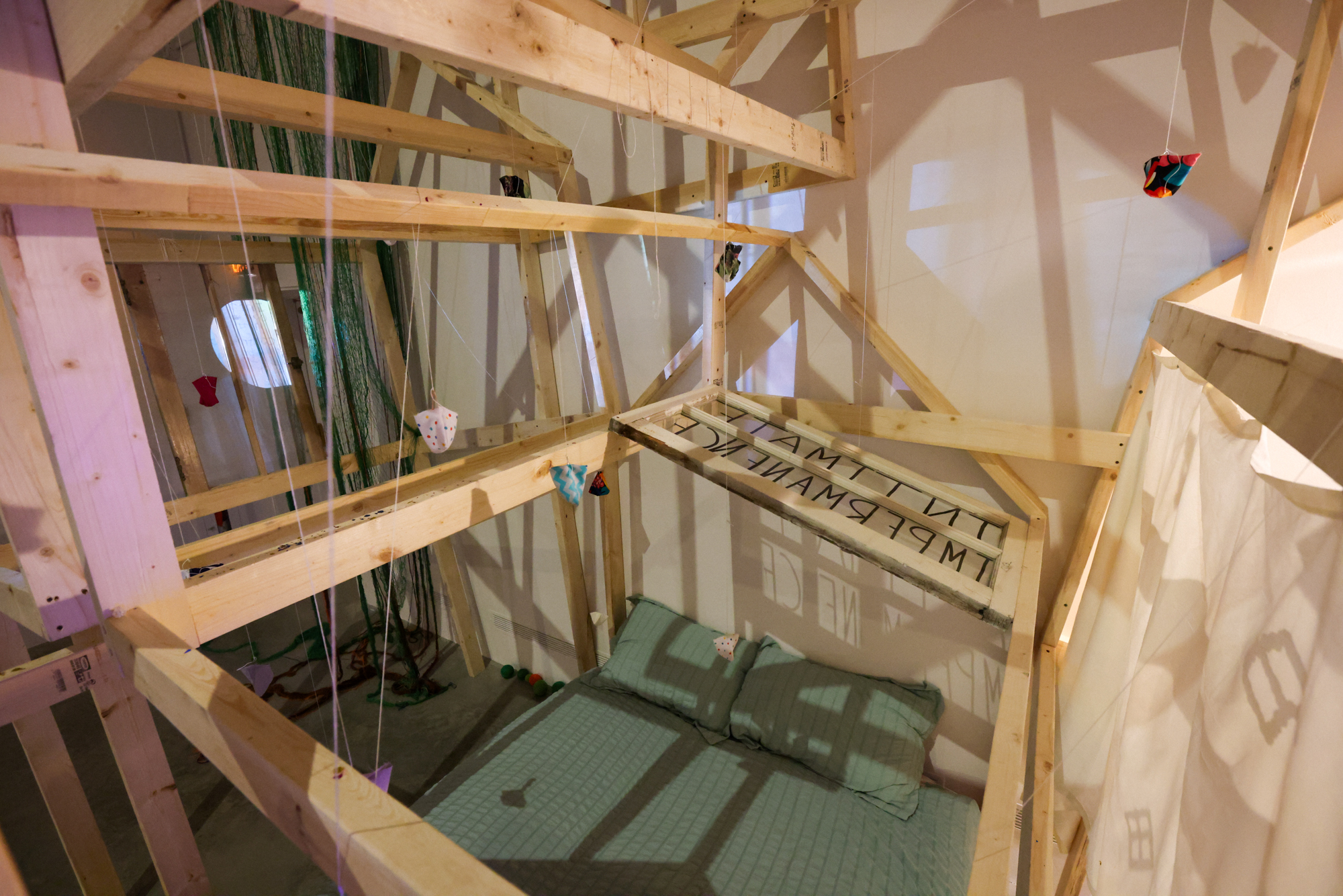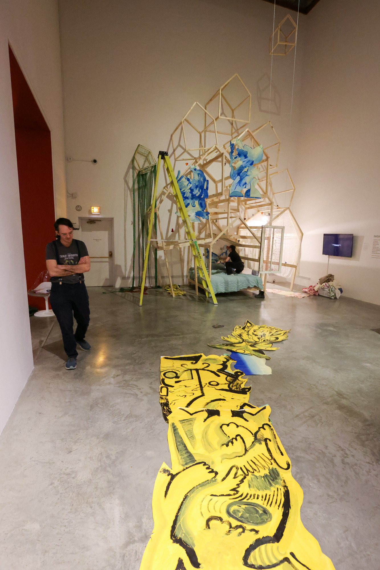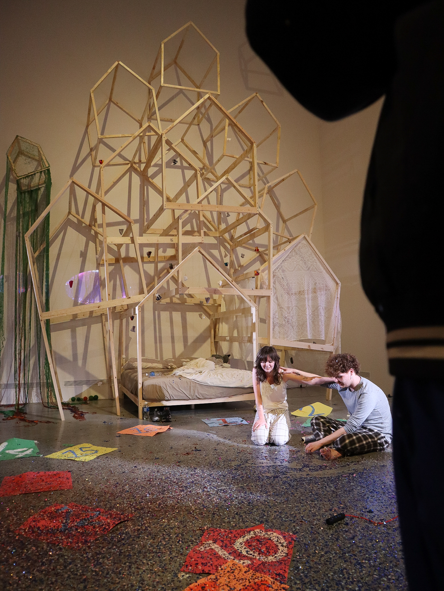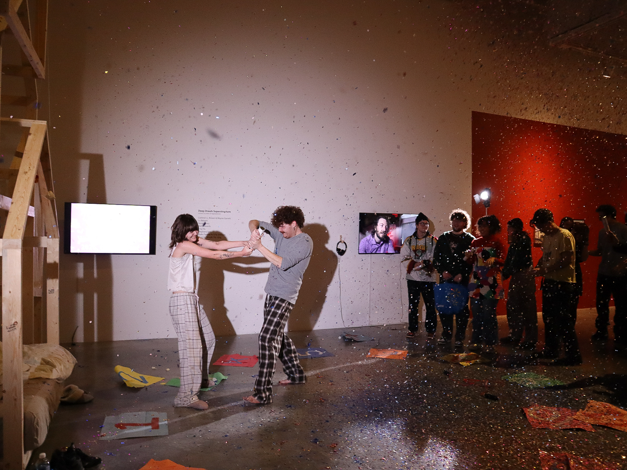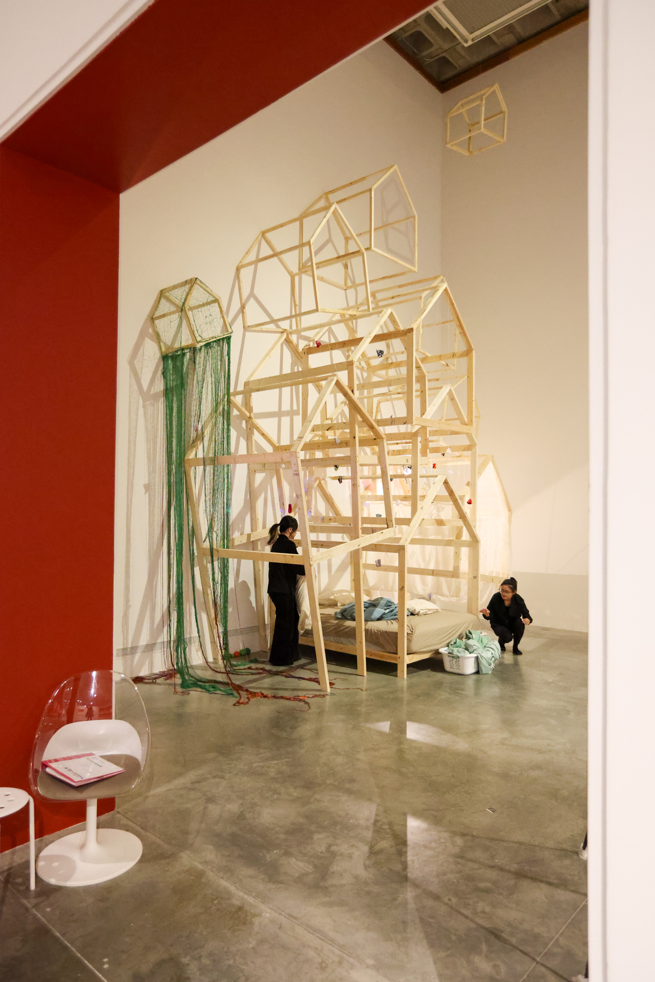 “We wanted to gamify the sculpture and do something that is not usually done in a gallery space. We armed the audience with sticky hands and streamers to throw onto the structure from within the bed. All participants were entered into a raffle to win a mystery gift. We turned the dream structure into an interactive space where the audience creates the art rather than just observes it.”