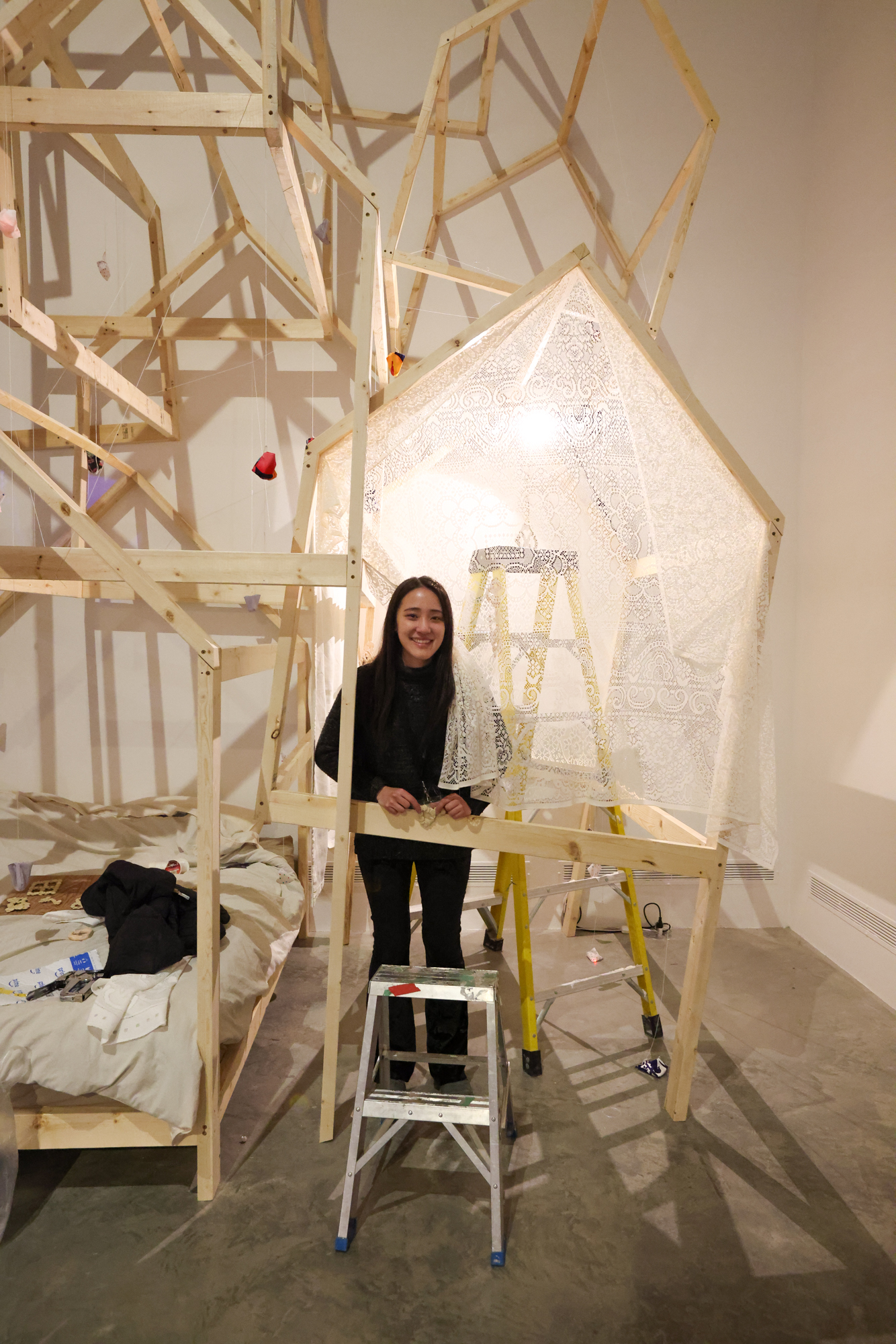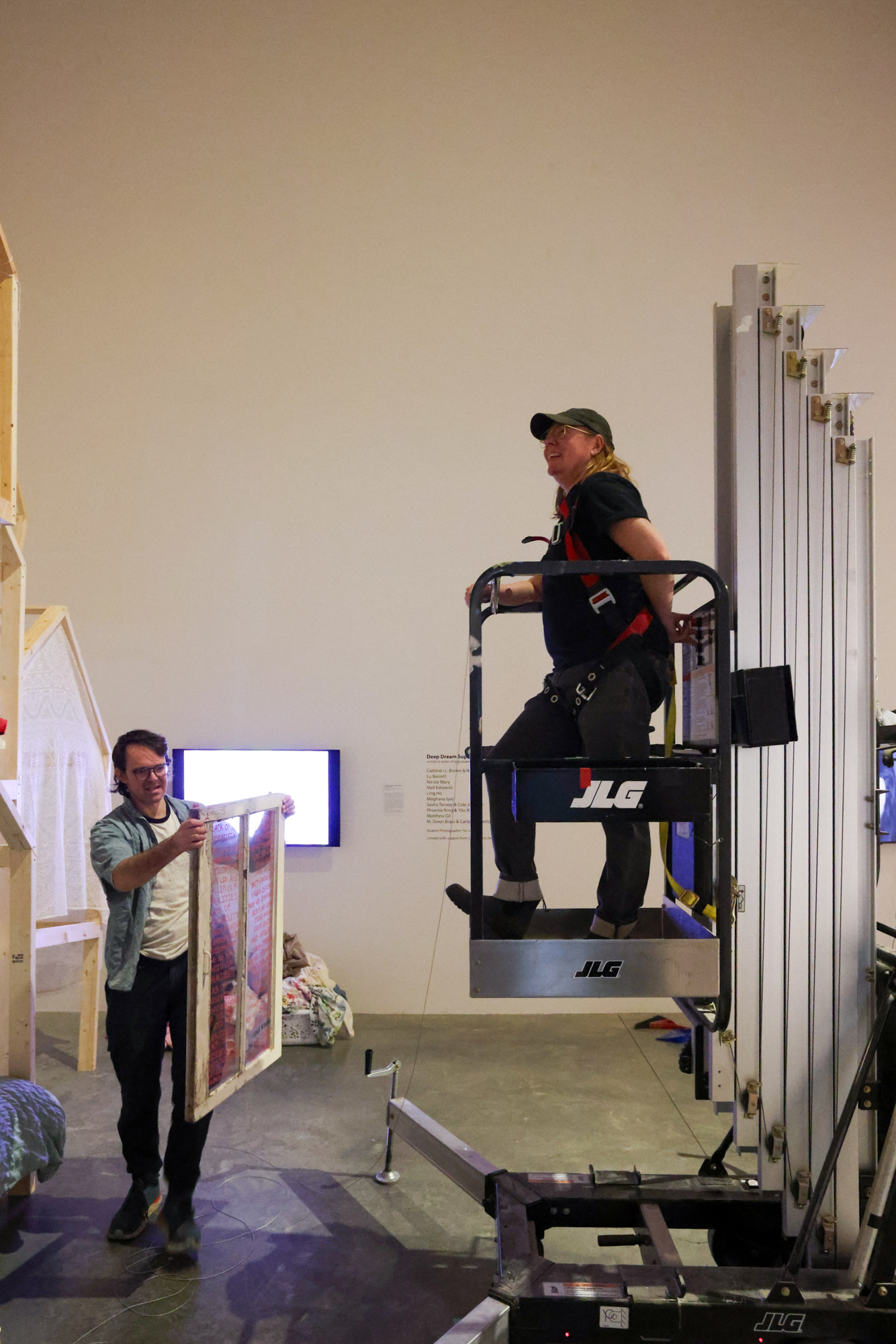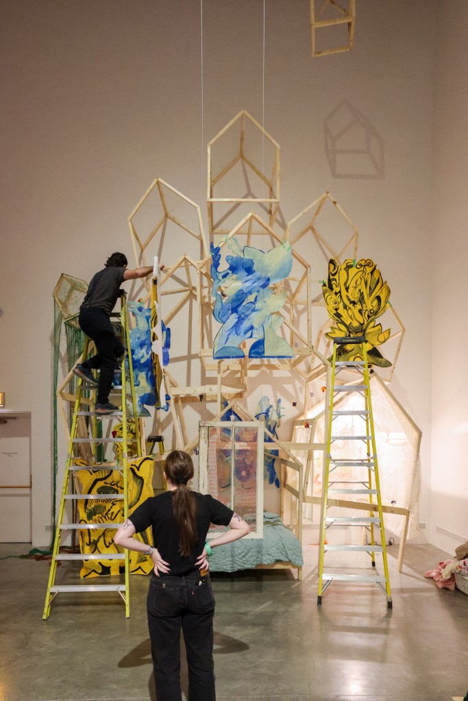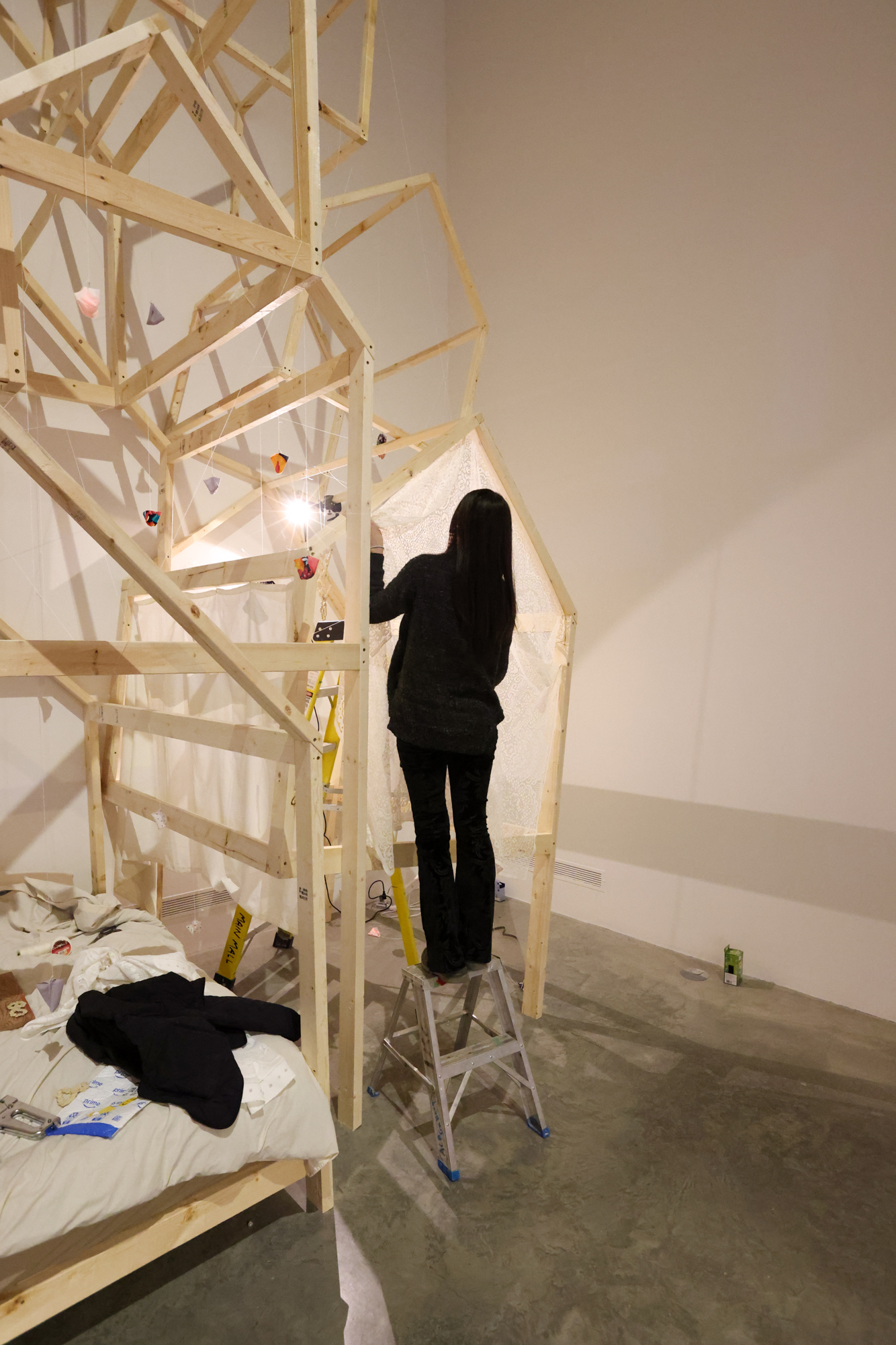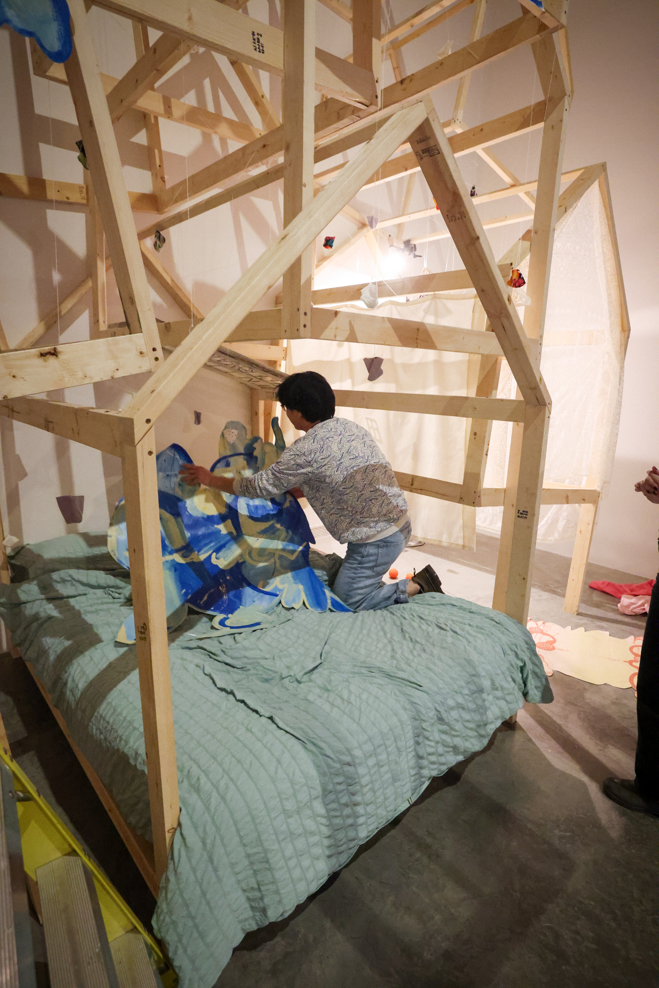 “We wanted to gamify the sculpture and do something that is not usually done in a gallery space. We armed the audience with sticky hands and streamers to throw onto the structure from within the bed. All participants were entered into a raffle to win a mystery gift. We turned the dream structure into an interactive space where the audience creates the art rather than just observes it.”