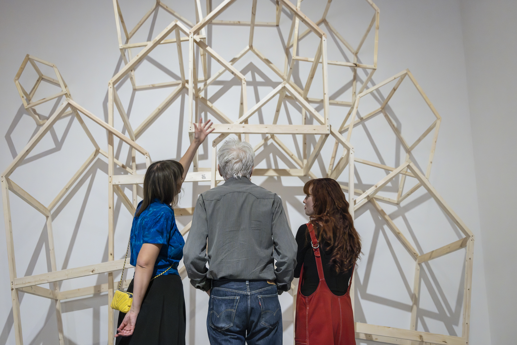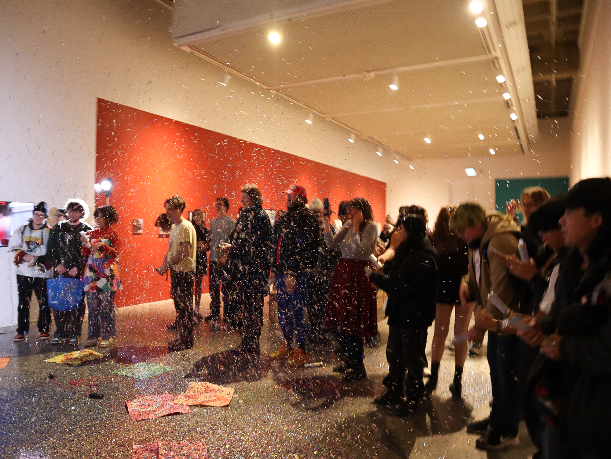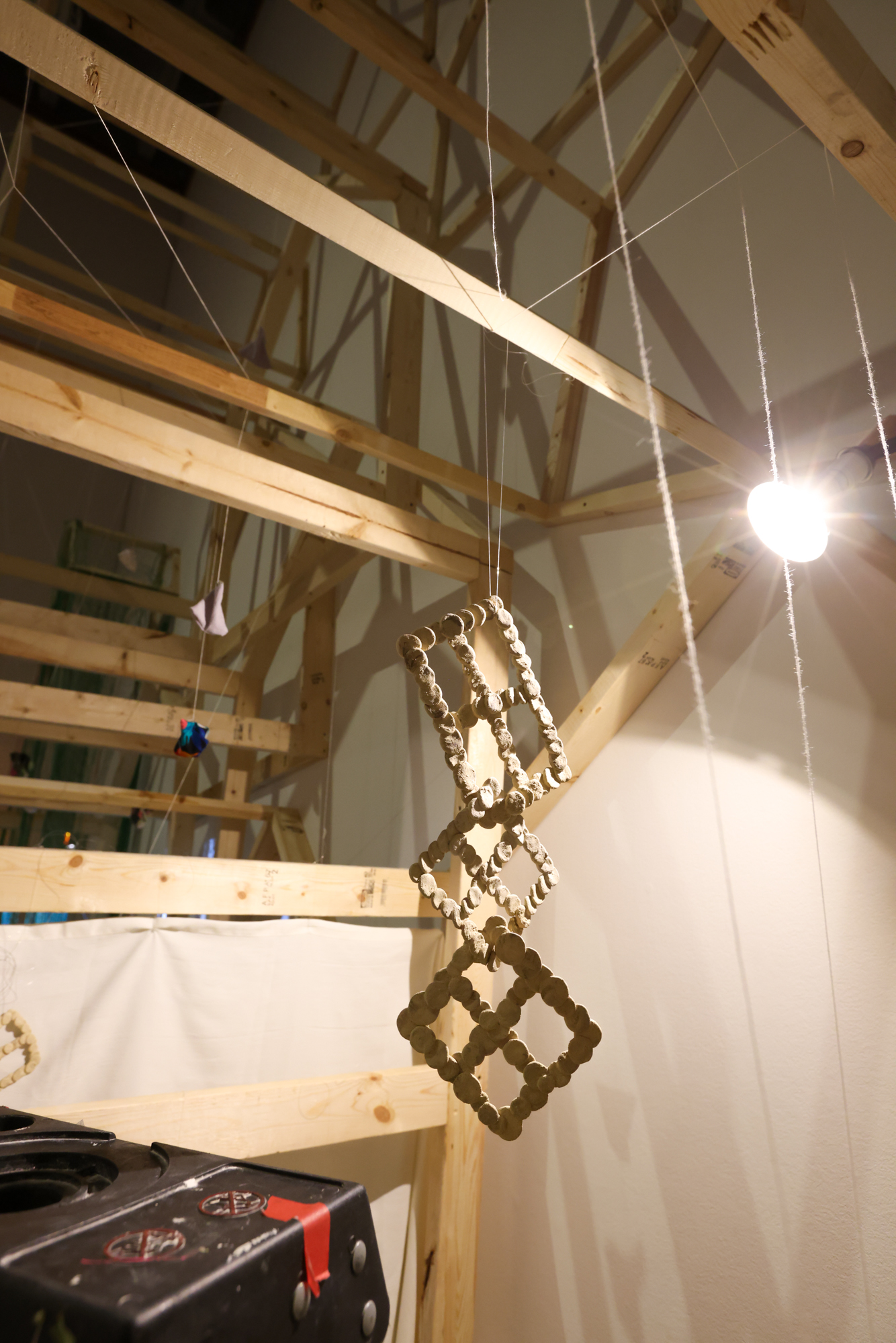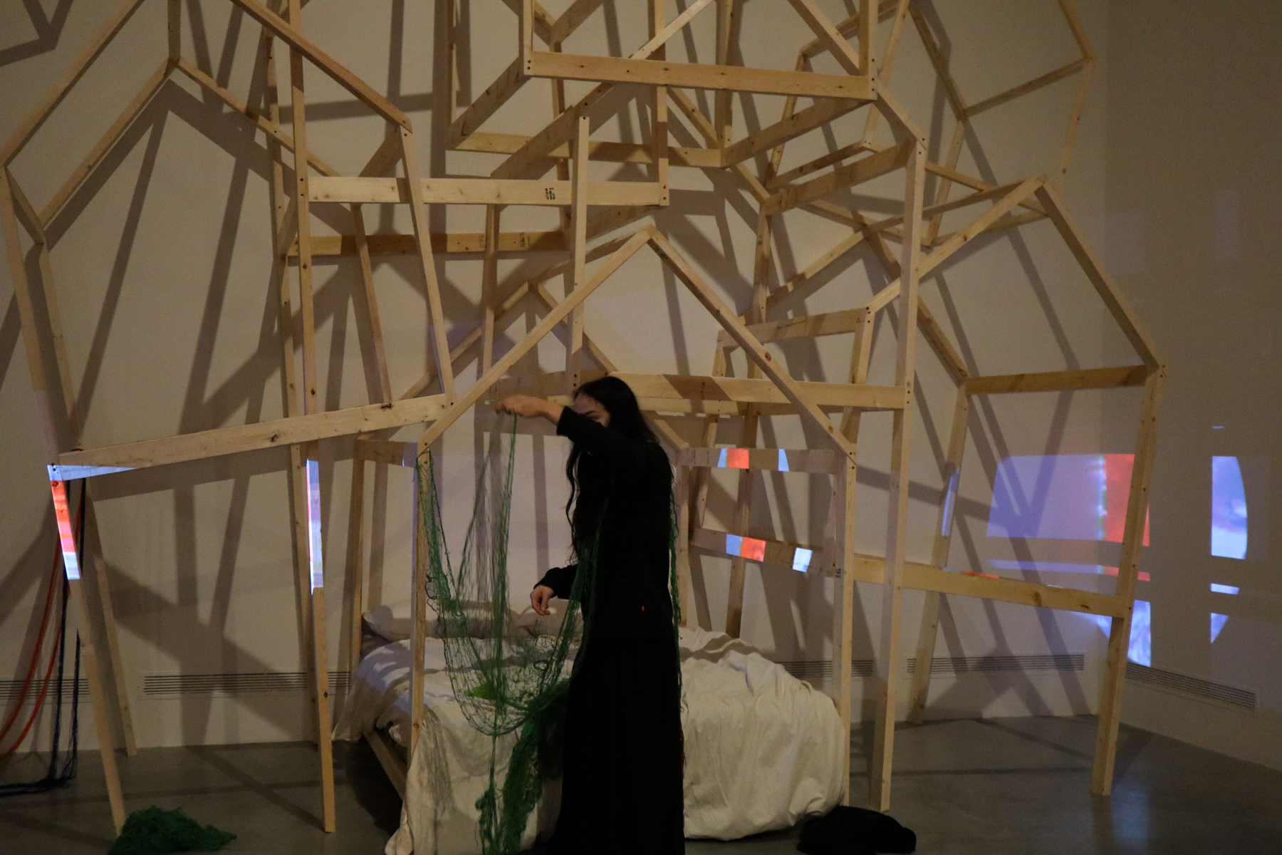 “We wanted to gamify the sculpture and do something that is not usually done in a gallery space. We armed the audience with sticky hands and streamers to throw onto the structure from within the bed. All participants were entered into a raffle to win a mystery gift. We turned the dream structure into an interactive space where the audience creates the art rather than just observes it.”