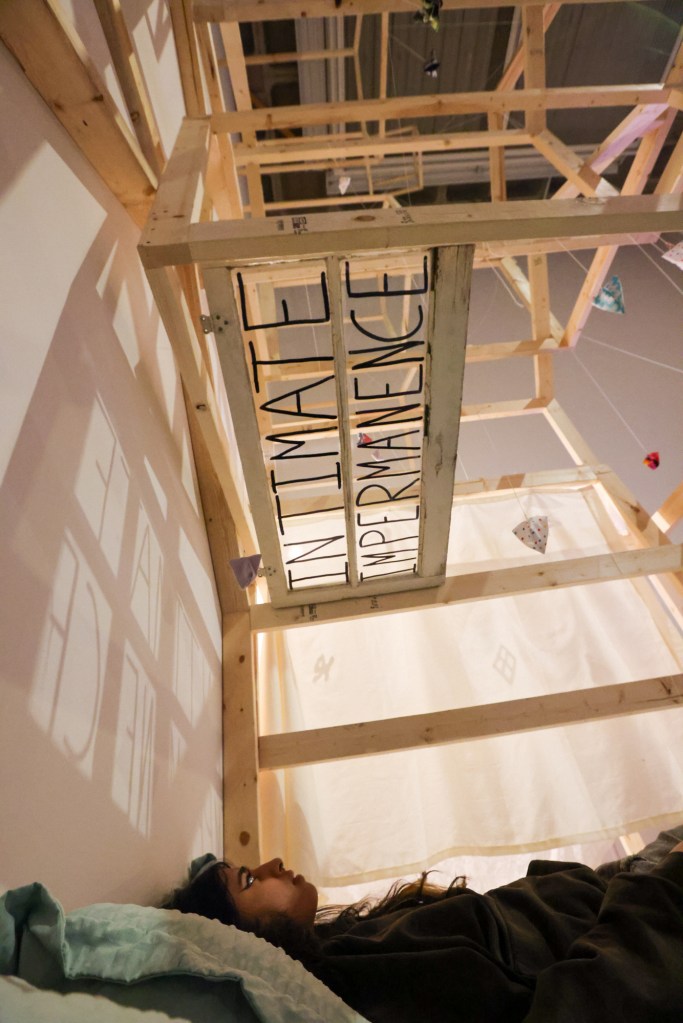I wanted to contribute to the sculpture by installing domestic window panels with words and poems written with paint markers to articulate these ideas. Three window panels were installed in various spots of the sculpture. The first panel is suspended in front of the bed, expanding the sculpture outwards into the gallery. Poems appear on both sides of the glass, offering layered interpretations depending on whether the viewer is lying on the bed or standing before it. The second panel is placed above the bed, where viewers can lie down and read the words Intimate Impermanence above them. The third panel is placed on the left side of the sculpture, where another poem can be seen written through the dust. Through interaction with these panels and the installation, the act of looking through the windows showcases shared introspection.”