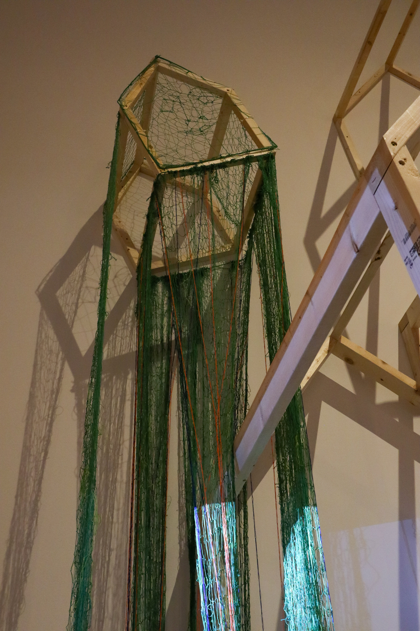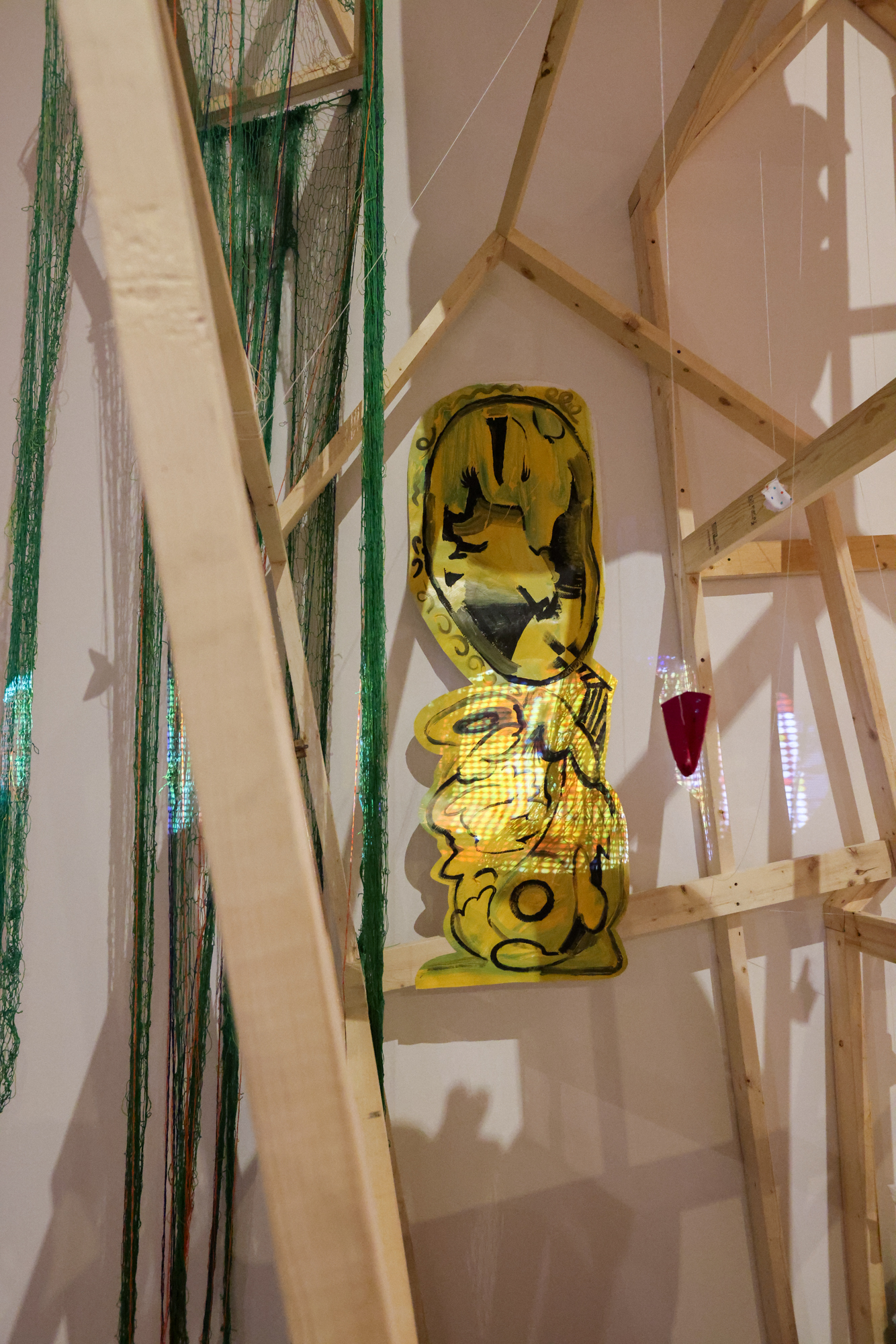 “For my contribution, I arm-knitted and dyed a sculpture based on a dream I had of the green man/fool archetype. Using a combination of repetitive and playful processes, I spent three days in the space adding to my pre-made piece. I kept the ends of my sculpture loose and left colourful balls of yarn around the superstructure so that these objects had the possibility of being moved around or used during the duration of the exhibition.”